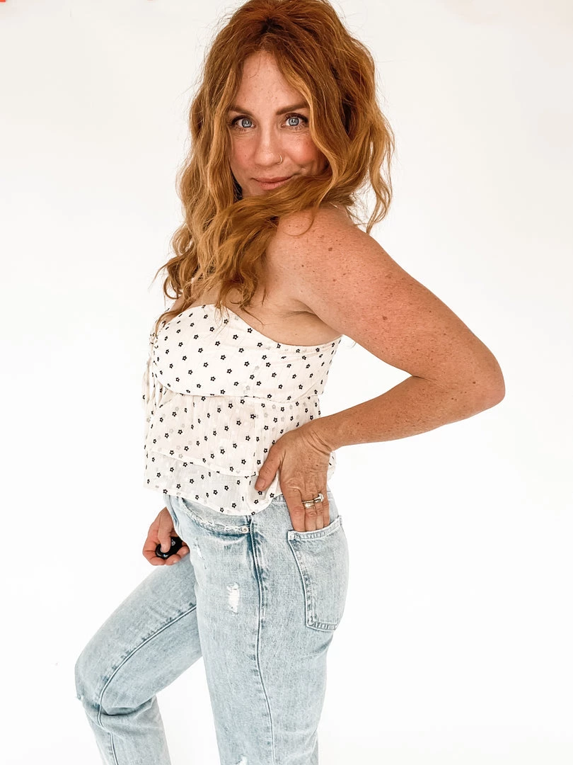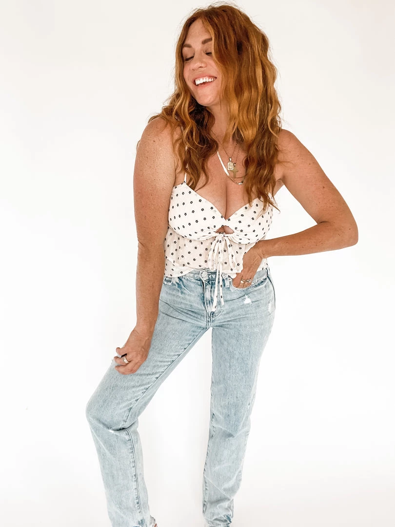 A light flower power! This is an elegant summer tank that can be paired with some high rise jeans and some cute booties. It features some fun polka dot floral detailing and shimmery sparkles.