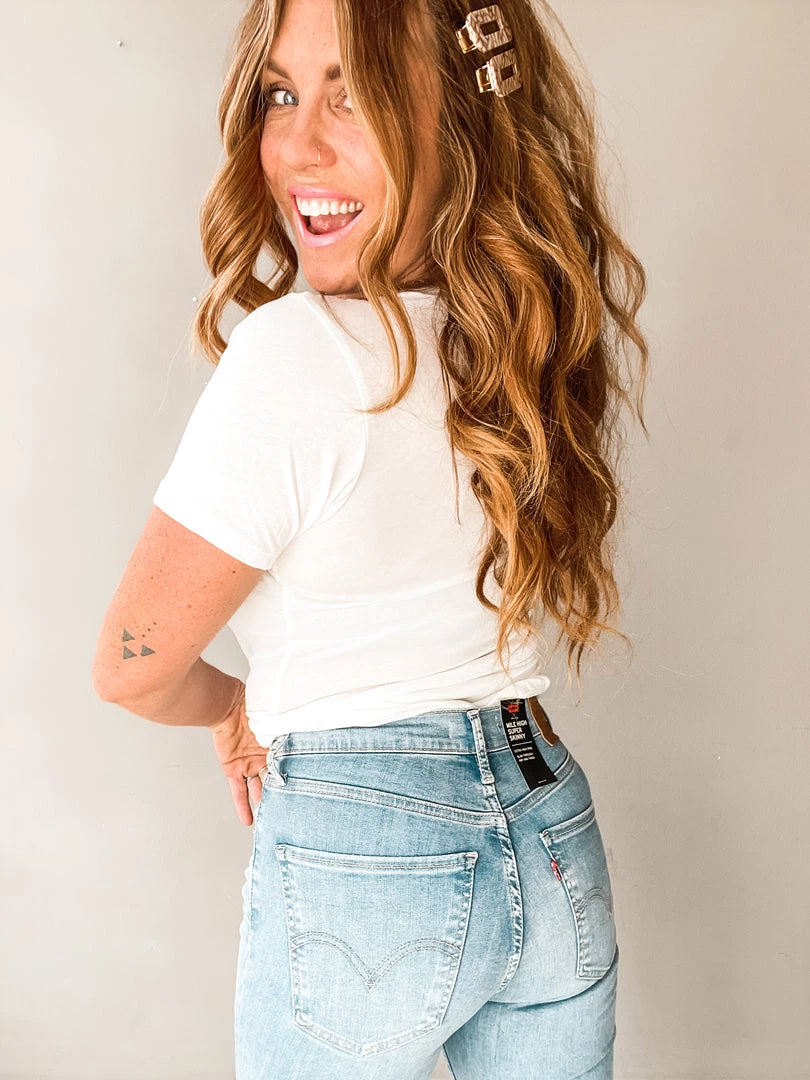 The Levi’s Mile High Super Skinny is the skinny you all have been asking for!!! SUPER stretchy, very forgiving and hold everything you want held in, in! This classic skinny has a high waist and tight to the ankle fit, perfect if you love tucking your skinnies into even the slimmest of boots. A great classic wash and a yummy stretchy fit you’ll want to sleep in.