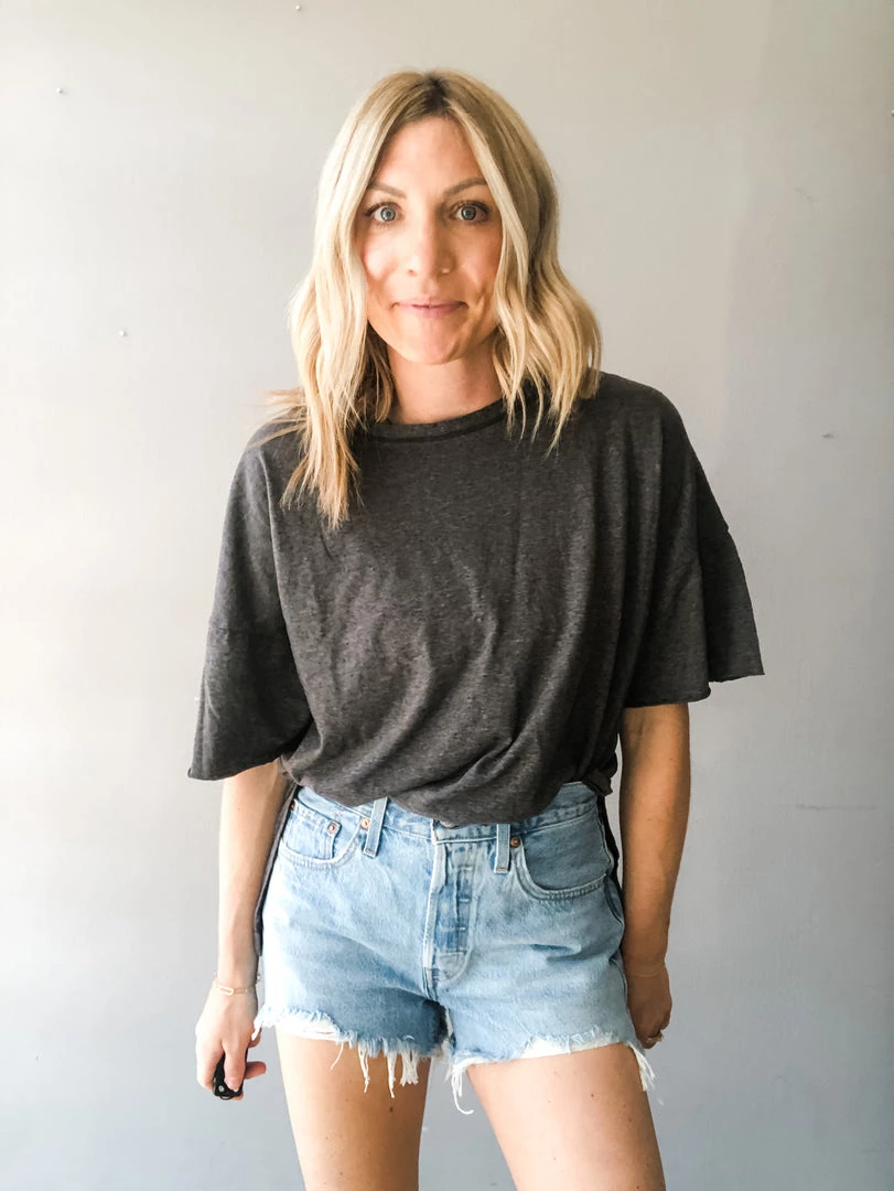 The Levi’s 501 Original Short is a super flattering high rise with just enough booty coverage and an actual comfortable denim you will want to LIVE in!!! We love the distressing and light wash of this button front high rise.