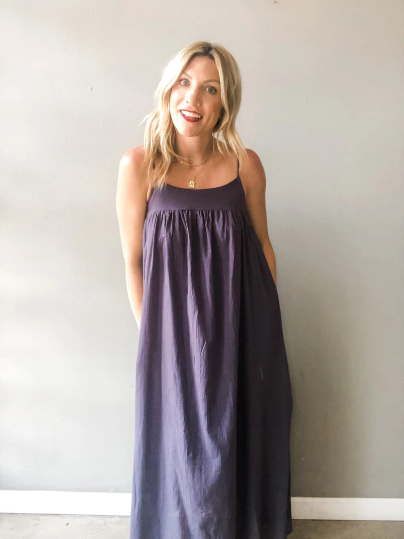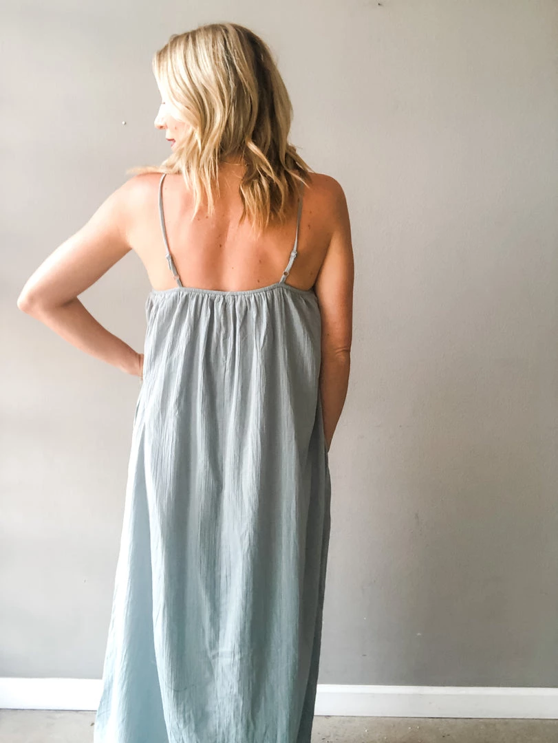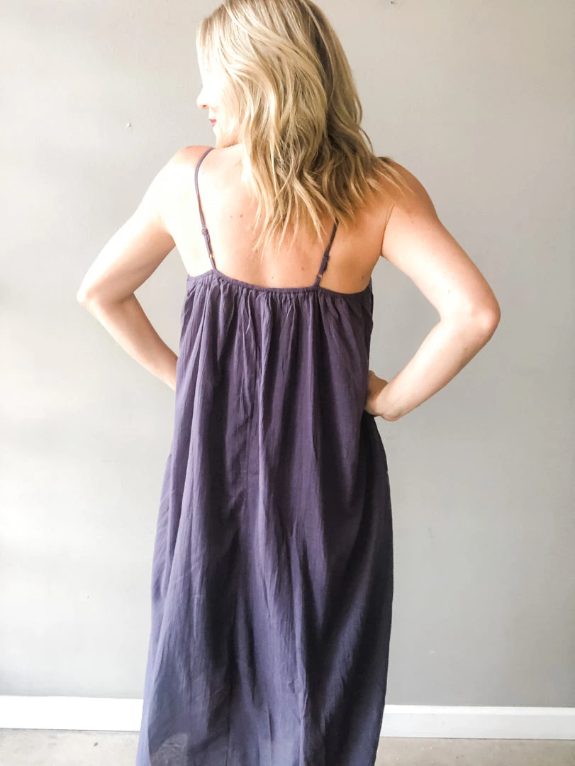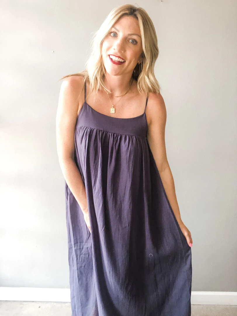 A loose fitting textured cotton maxi dress with side pockets and adjustable shoulder straps. The perfect summer dress to toss on and go. This piece is versatile and can be styled so many ways. Midi length lining.