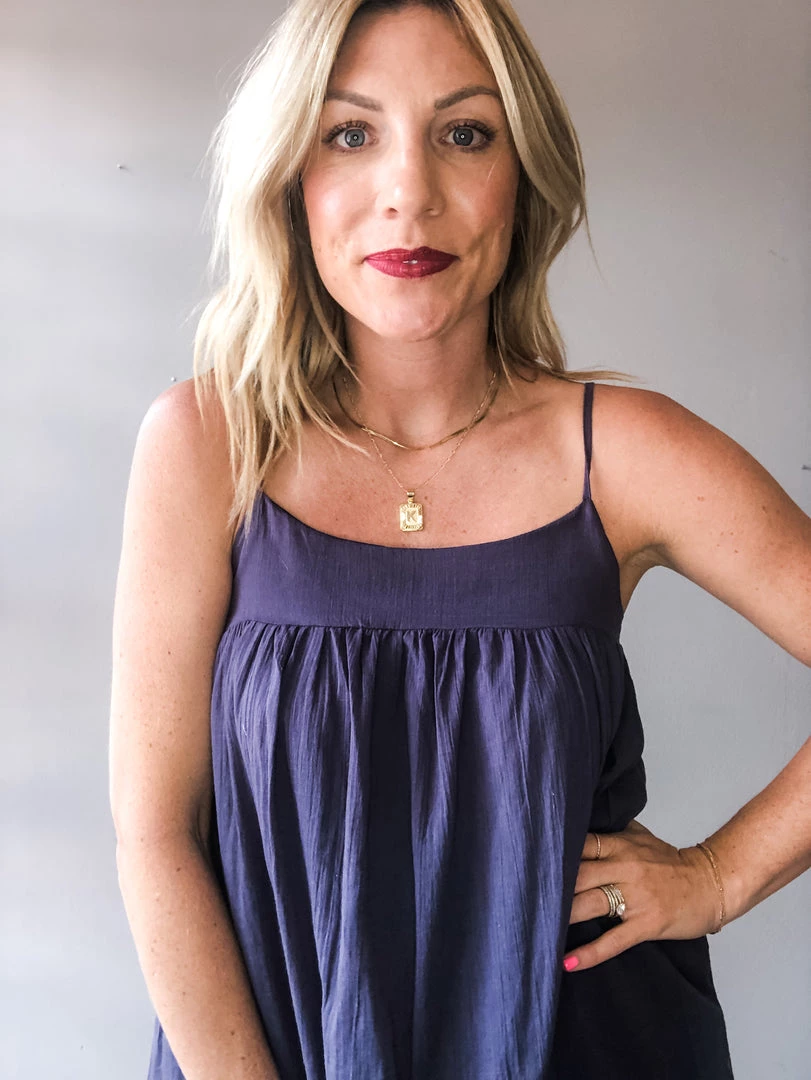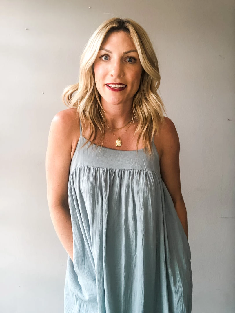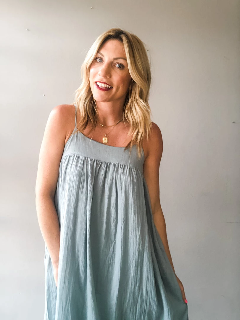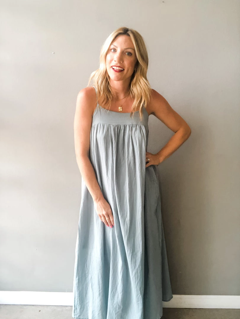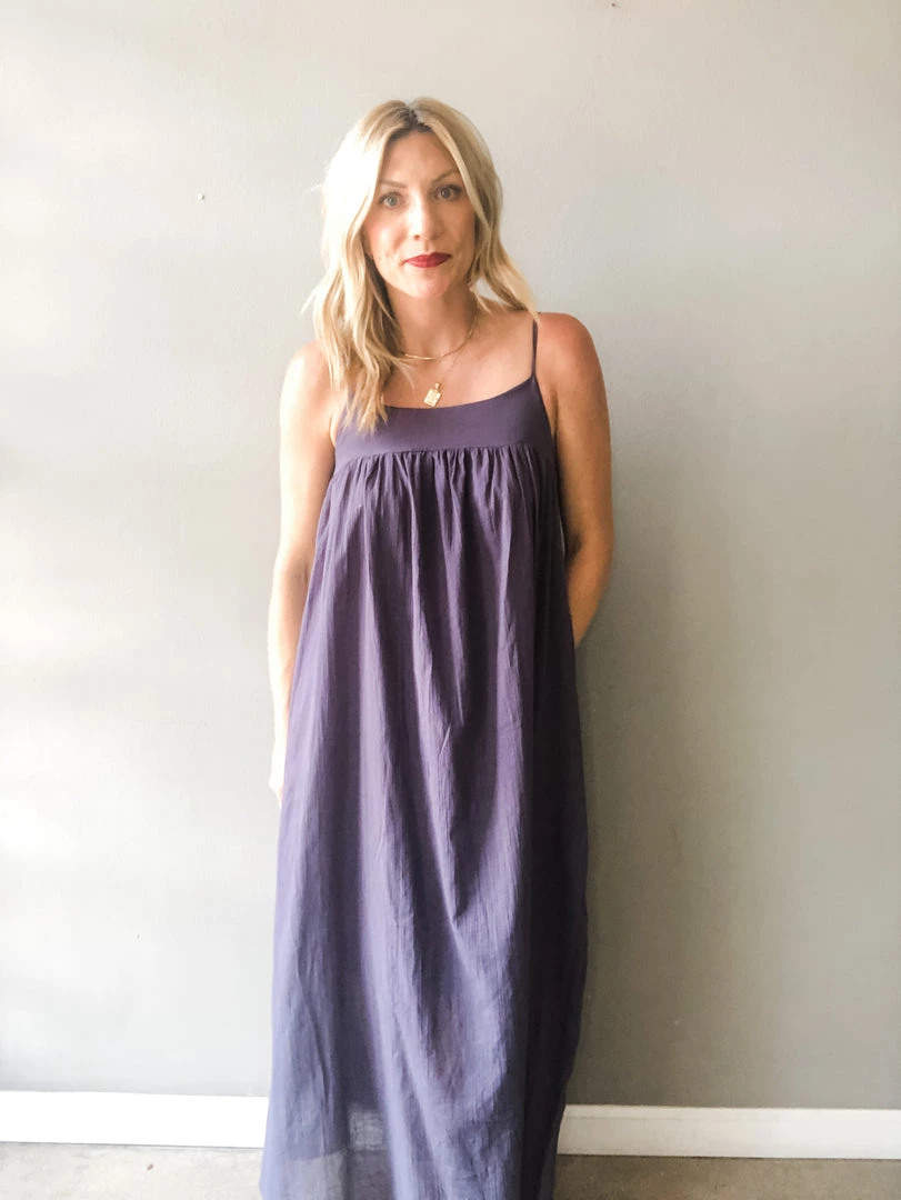A loose fitting textured cotton maxi dress with side pockets and adjustable shoulder straps. The perfect summer dress to toss on and go. This piece is versatile and can be styled so many ways. Midi length lining.