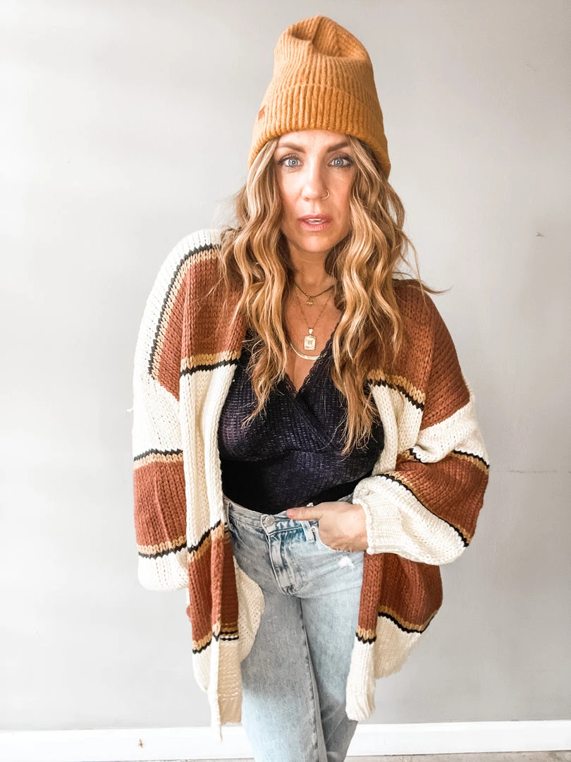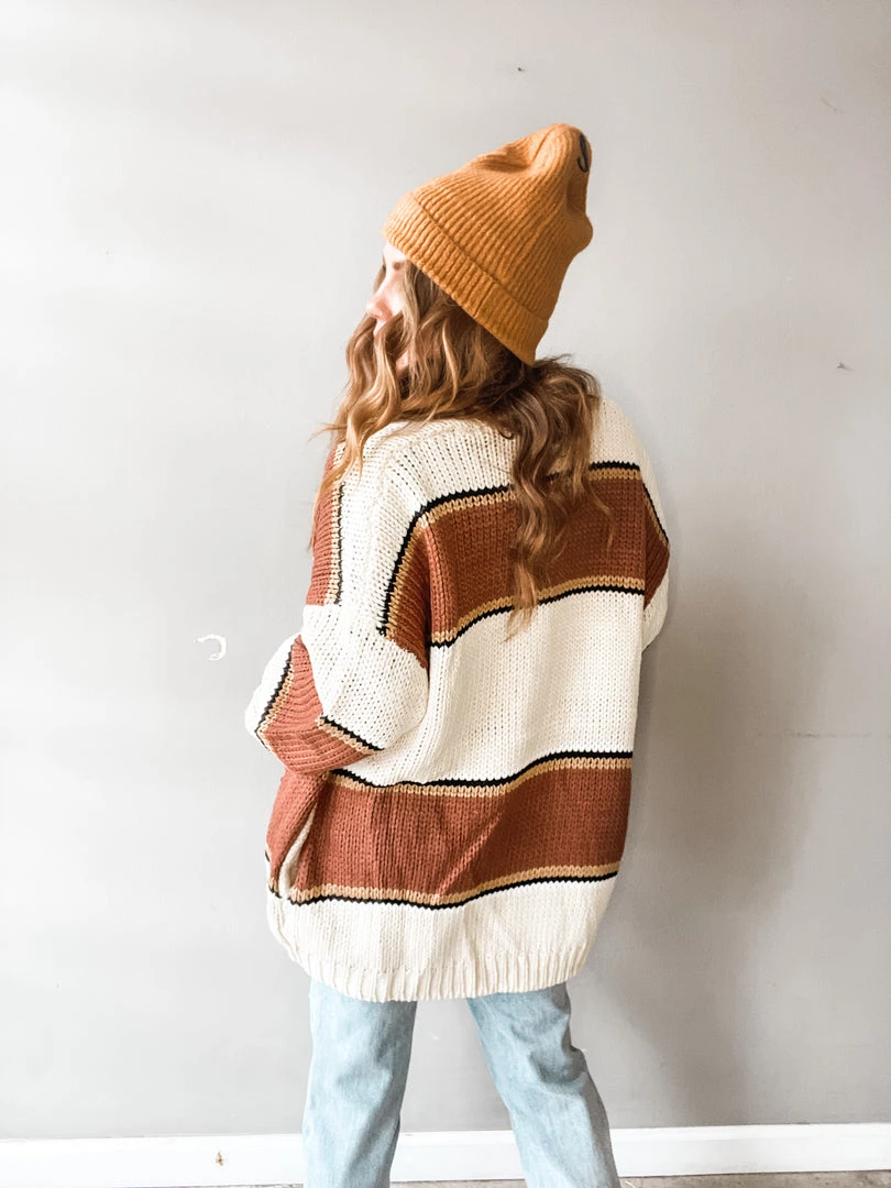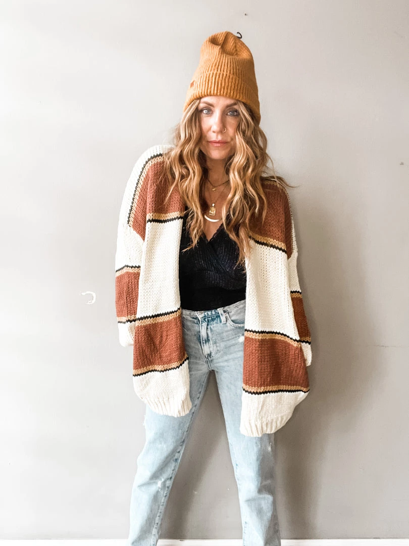 Along Those LInes Cardigan is a great oversized knit cardigan with fun neutral stripes! We love the side pockets and easy fit and color palette of this staple layering piece.