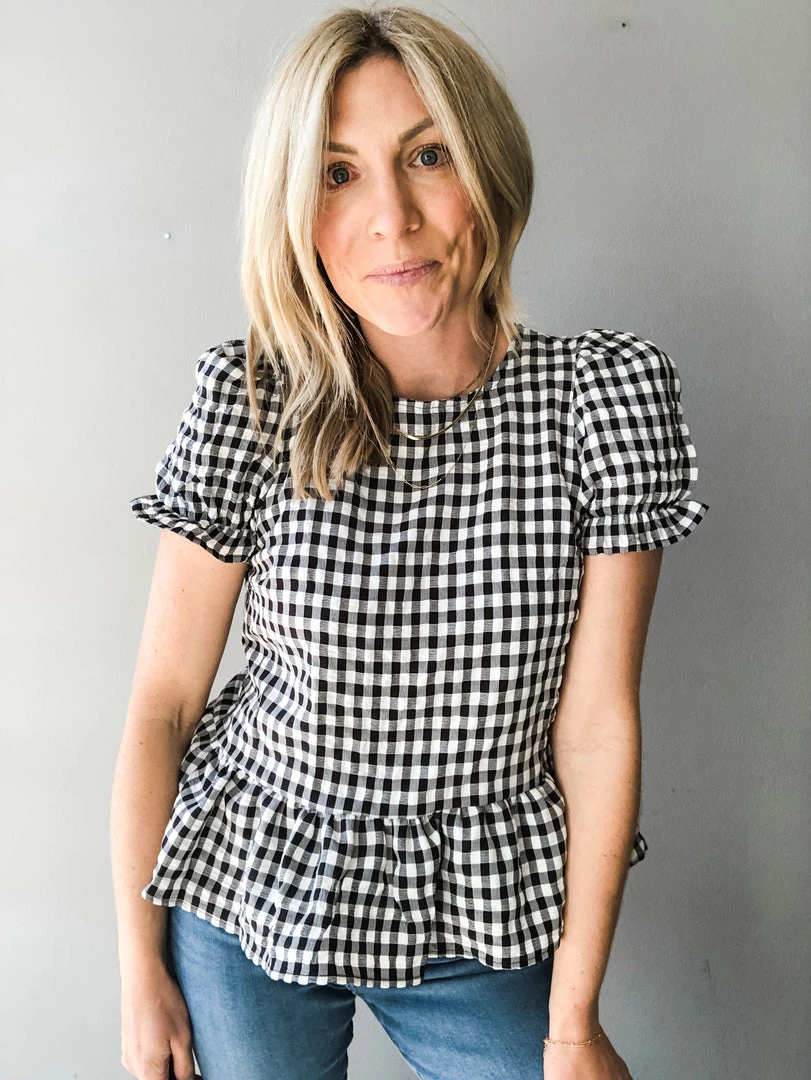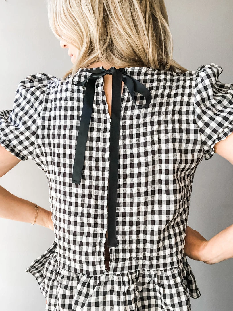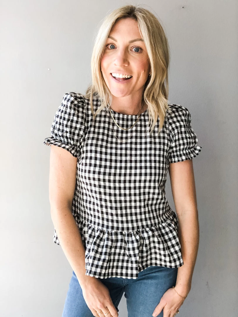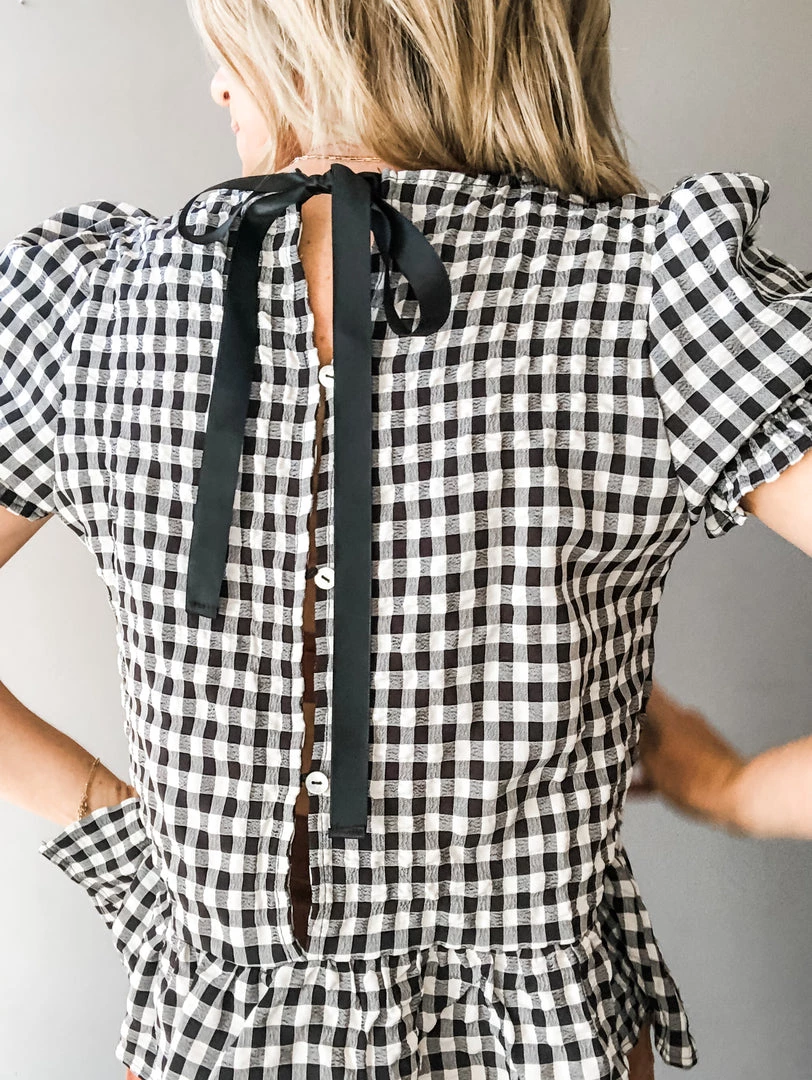 A sweet gingham top with all the feminine details. High neck with puff sleeve and ruffle trim plus a fun button detail down the back with ribbon tie closure. Pair with denim and take her anywhere. Fun to dress up for a night out or wear cute and casual at your next backyard hang.