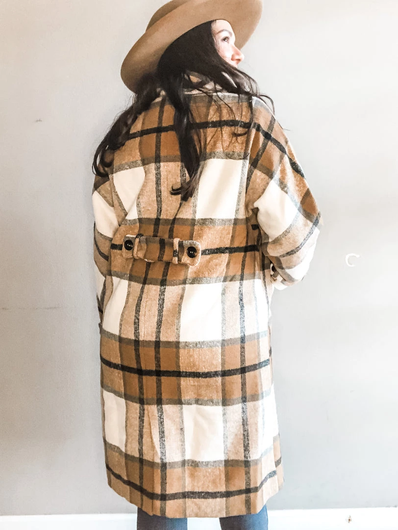 The Berkely Plaid Coat is a dream for any neutral-loving gal!! It’s a classic silhouette and a must have closet staple. This buffalo plaid jacket his at the knees and features a center button closure with pockets towards the center of the body and fixed belted details at the back. Perfectly cozy with just a hint of those tailored details we love to see in the collar, front lapel and belted sleeves. A weightier coat that fits true to size for a slightly loose silhouette.