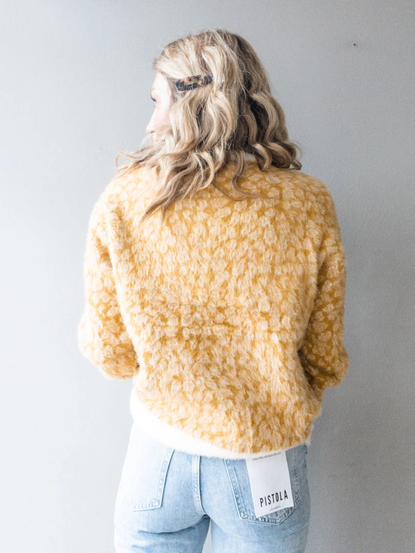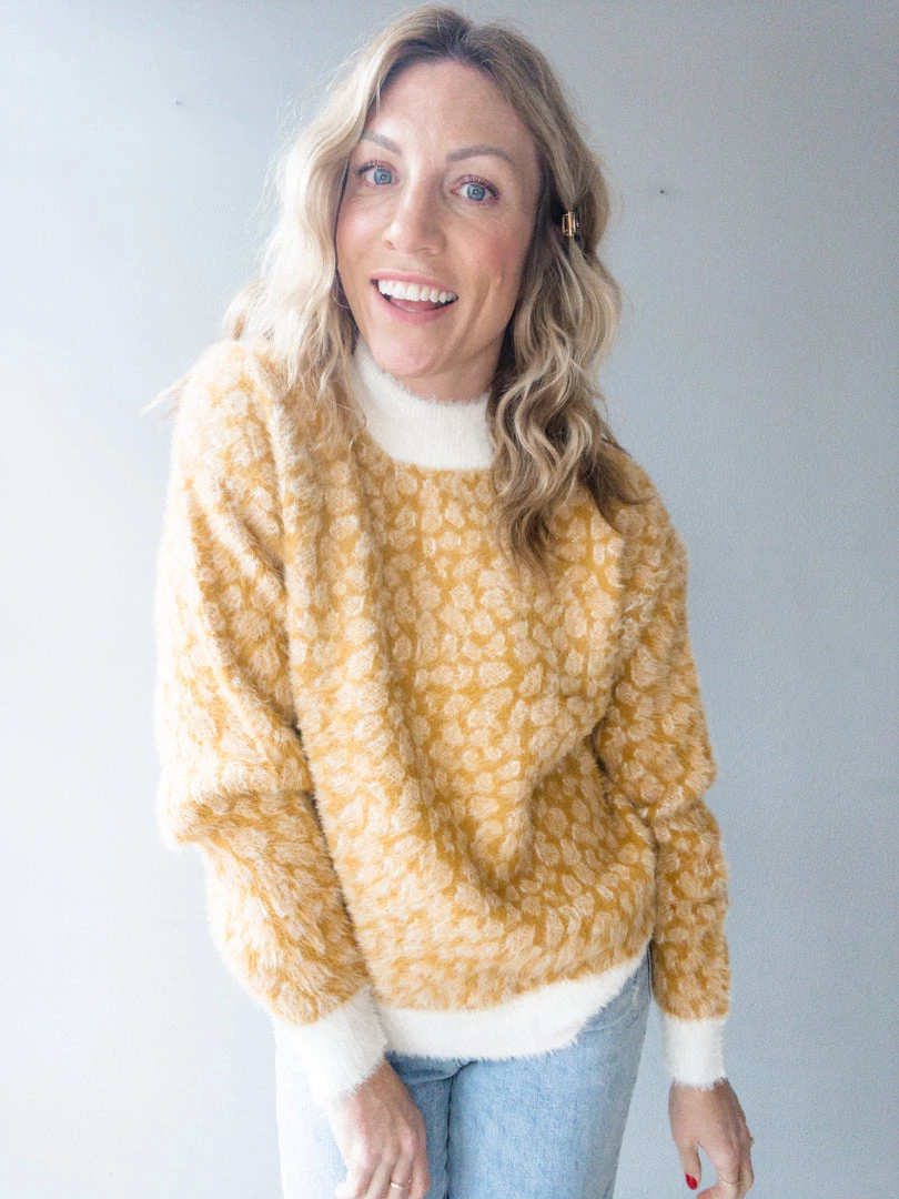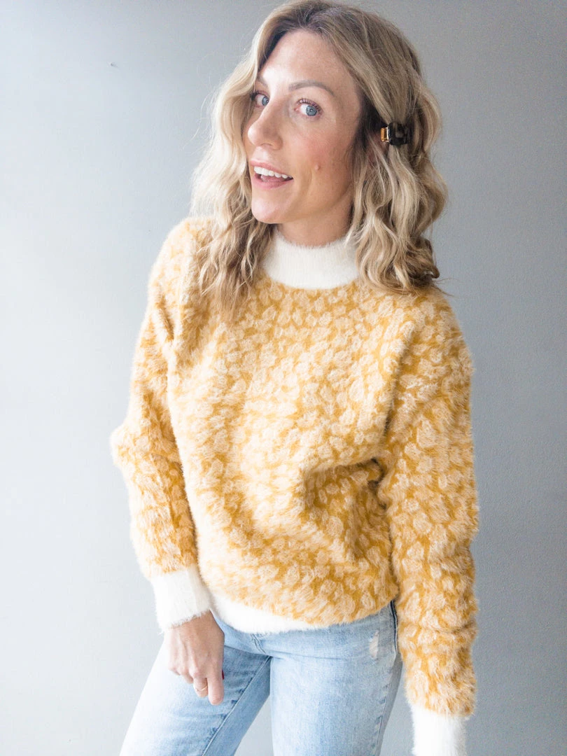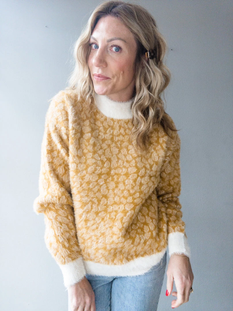 A fuzzy all over speckled print pullover sweater with white contrasting neck and hemlines. A cozy sweater that is chic and a fun add of color. Pair with a light or dark denim and wear dressed up or casual.