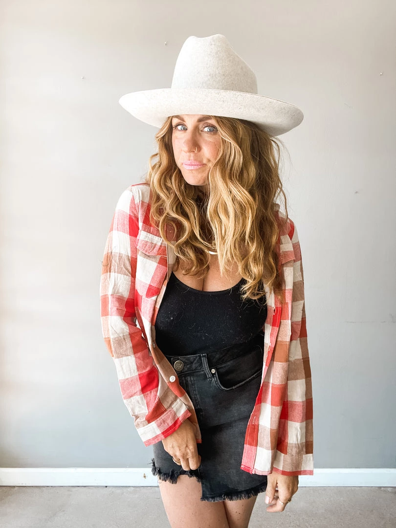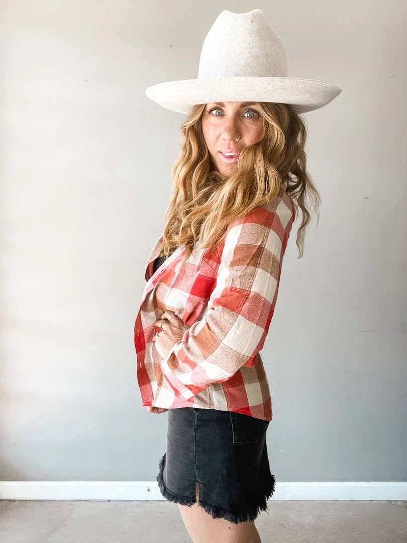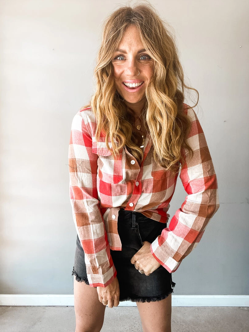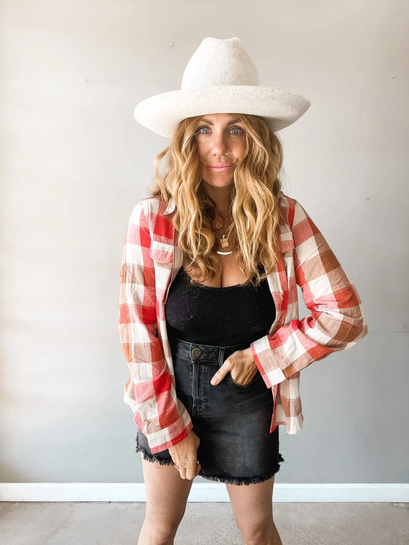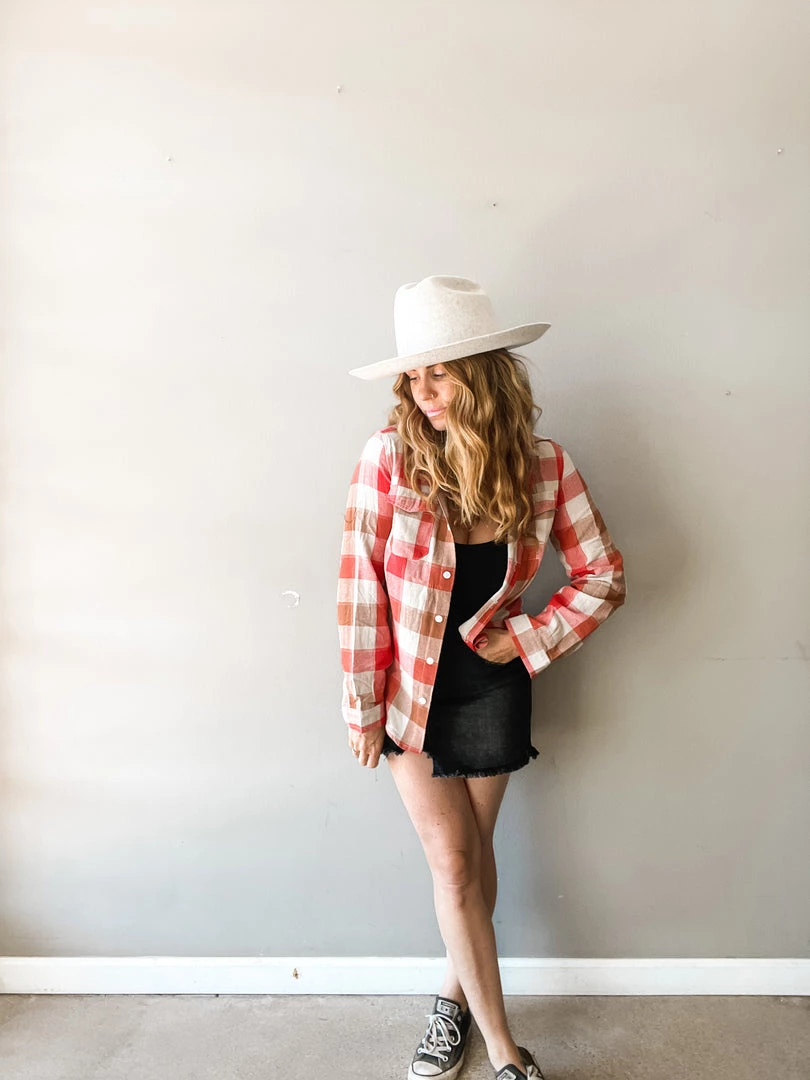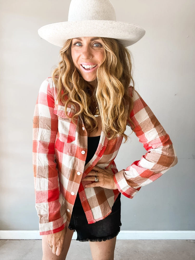 A good flannel is like a fine wine and we can never get enough of either!! A classic red buffalo plaid flannel that goes so much and can be worn year round. A button down with long sleeves and shirttail hem.