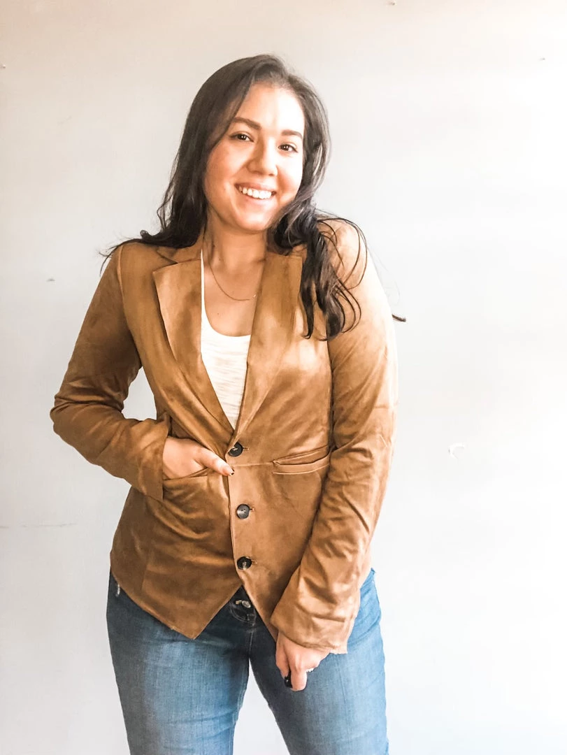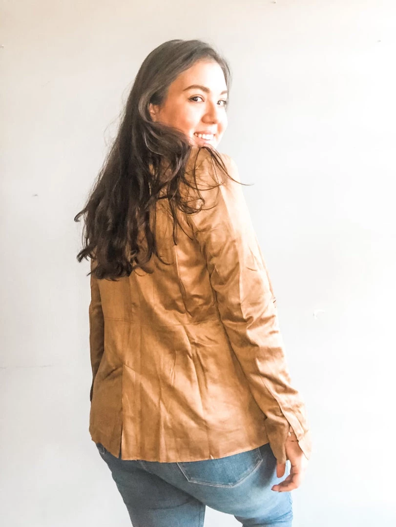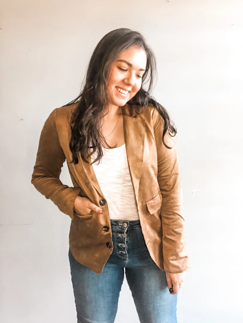 Whether you’re wearing this stretch suede jacket for that nine to five or out to drinks with your gals it’s sure to be your Finest Hour. A classic blazer silhouette that is great for so many shapes and compliments so many looks. This jacket has a three-button front with functional pocket details and the slightest exposed seams in the waist and down the spine. A v-cut hemline at the back makes for a flirty and incredibly flattering fit.