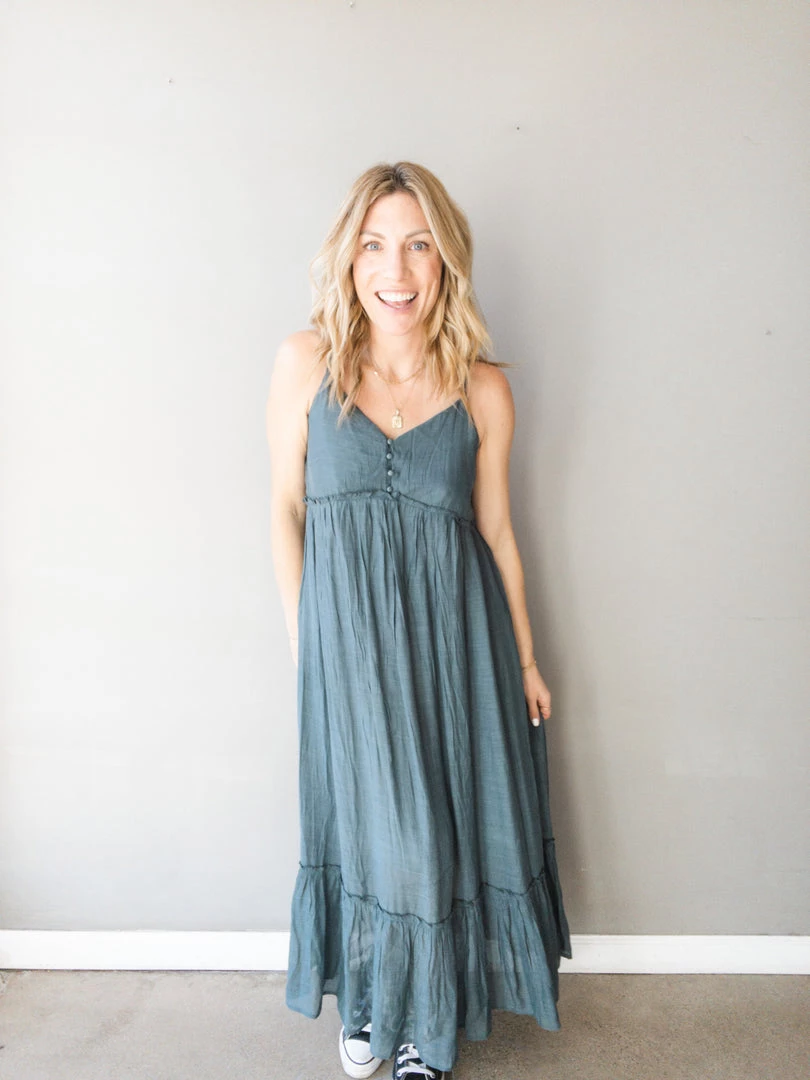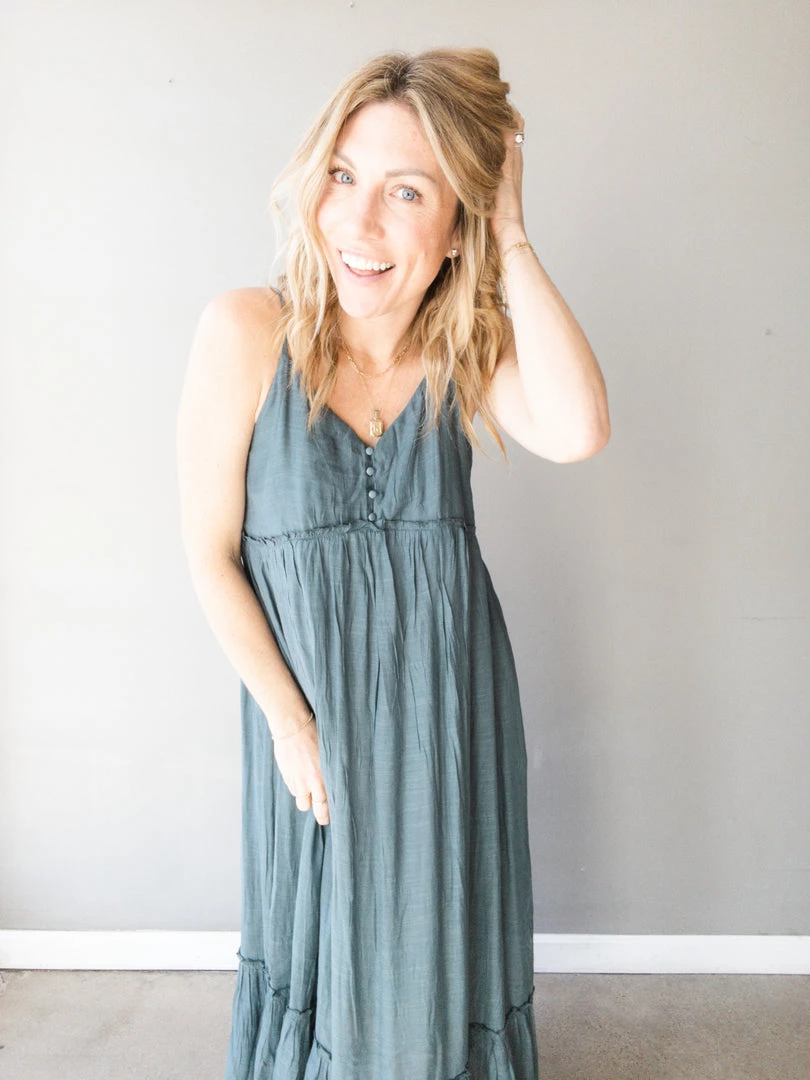 The Green Gables Dress is a feminine woven maxi dress that is so flowy and flirty on!! With a low cut V-neckline, adjustable straps and button closure on center front, this dress has the prettiest lace up center back we ever did see. A tiered layer hem and bust with ruching and baby ruffle detailing. Side seam pockets and lining inside finish off this pretty emerald green dress.
