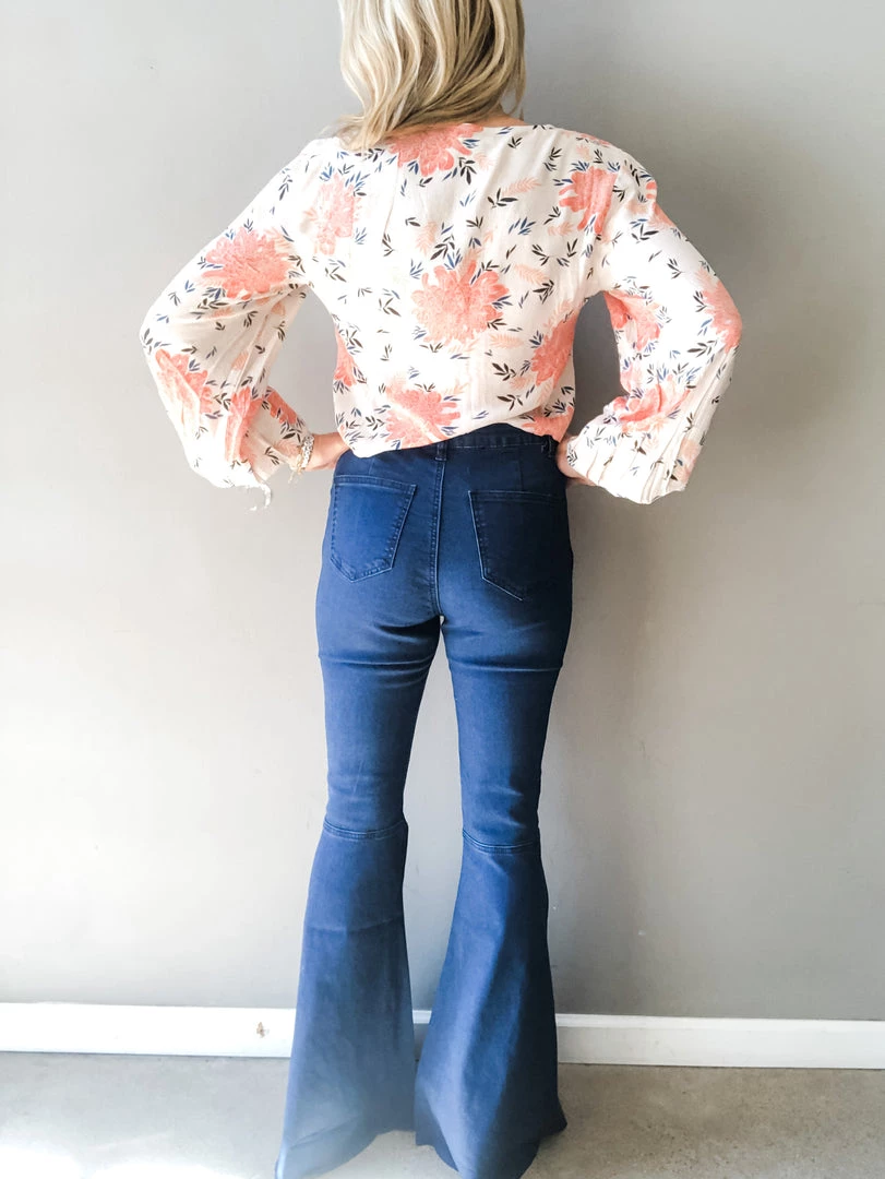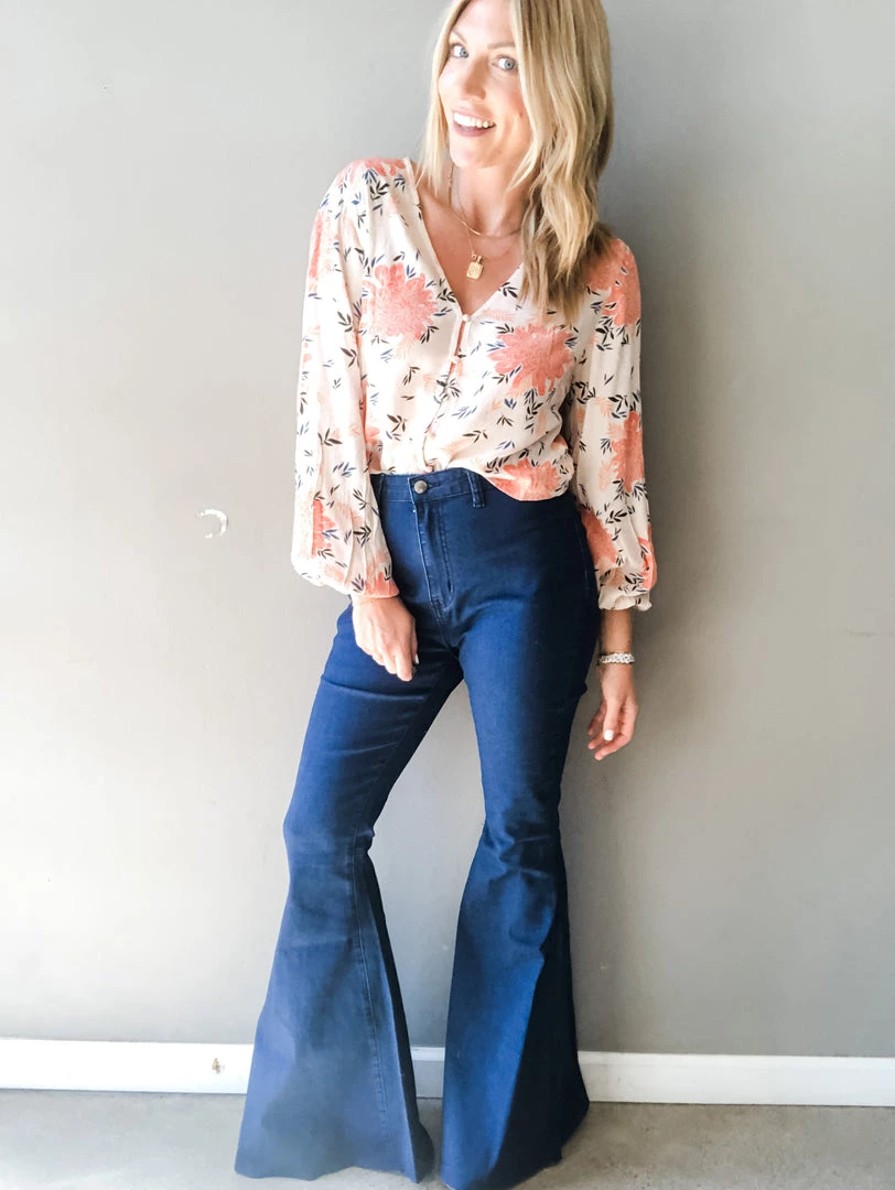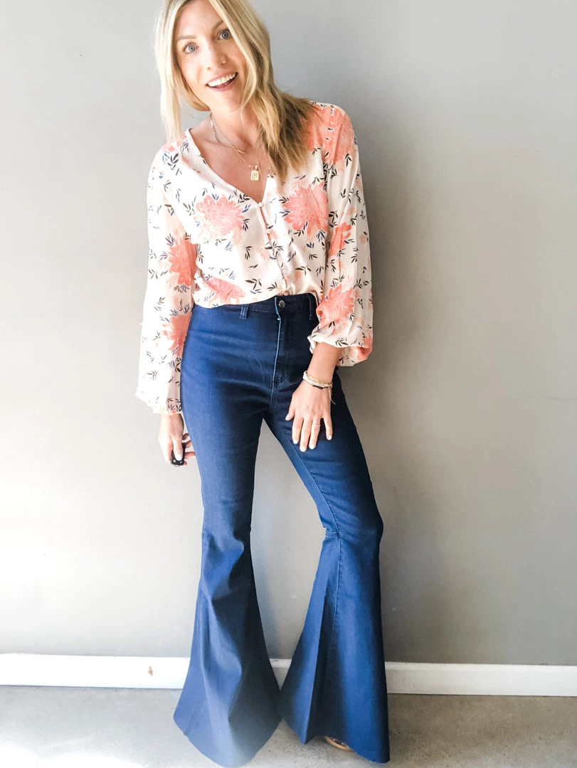 A denim flare always has a close place to our hearts. It’s a little bit rock and roll and a little bit boho babe. These pants are a dark jean with slightly uncut hem for a not-so-polished look we love with a graphic tee and our bestselling Caty boots. Single button waist with zipper closure and back pocket details. These high waisted pants a kick flare bottom with plenty of stretch throughout.