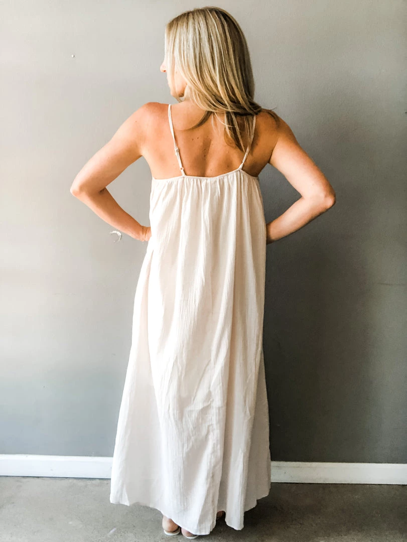 A loose fitting textured cotton maxi dress with side pockets and adjustable shoulder straps. The perfect summer dress to toss on and go. This piece is versatile and can be styled so many ways. Midi length lining.