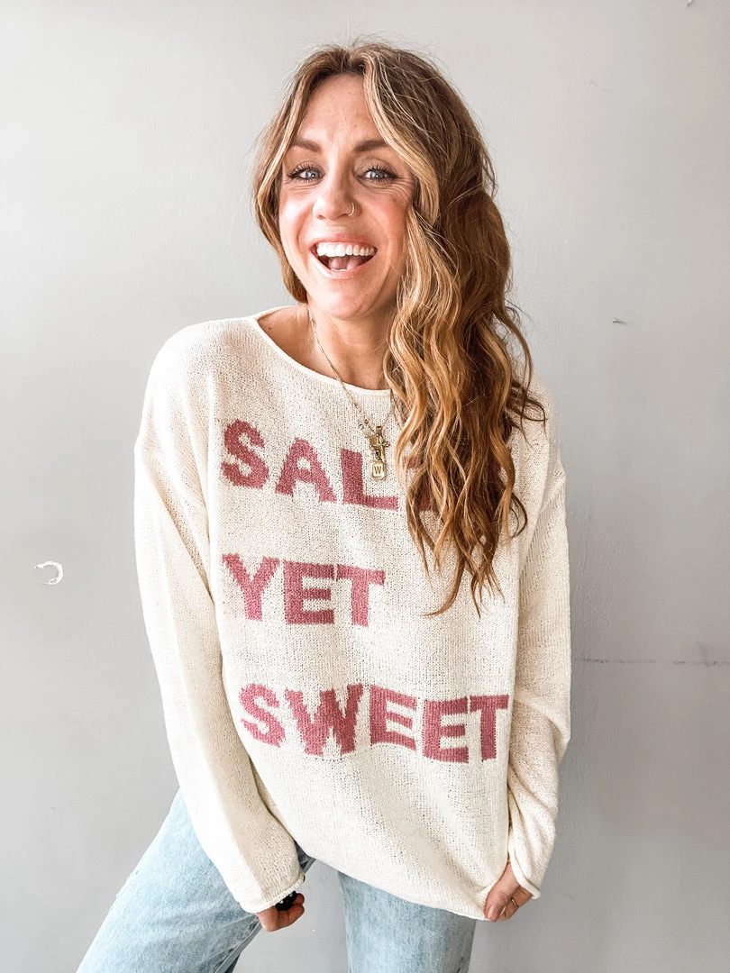 The Salty Sweet Sweater is a super light knit oversized sweater perfect for layering over your favorite basics!!!! We love the fun pink SALTY YET SWEET graphic on this cozy and casual sweater that can be worn during any season!!!