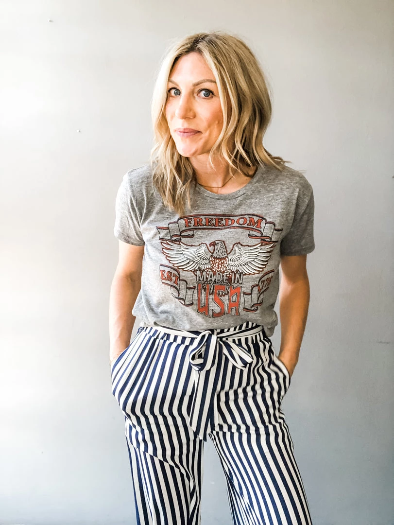 A great pant that is perfect to take from the office to a night out. This high waisted cropped striped pant has side pocketsĀ and anĀ elastic waist with belt. Pair with a graphic tee or a white shirt and blazers for a sophisticated look. Lined.Ā
