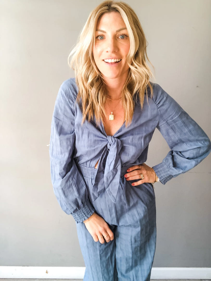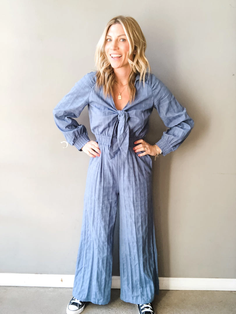 The Cut It Out Jumpsuit is like the love child between two of our favorite pieces – those vintage garage girl overalls we wear over again and that killer jumpsuit. It’s a little bit tailored and a little bit rock and roll. A wide leg high rise pantsuit with elasticated waist and wrists for a fit that will stay put. This dusty blue jumpsuit kicks it up a notch with its subtle blue gingham fabrication and flirty keyhole details above the waist. An adjustable tie bust means flexible fit for all our gals and ankle skimming length means you can put this bad boy on and head out the door…no having to look for your tallest platform shoe.