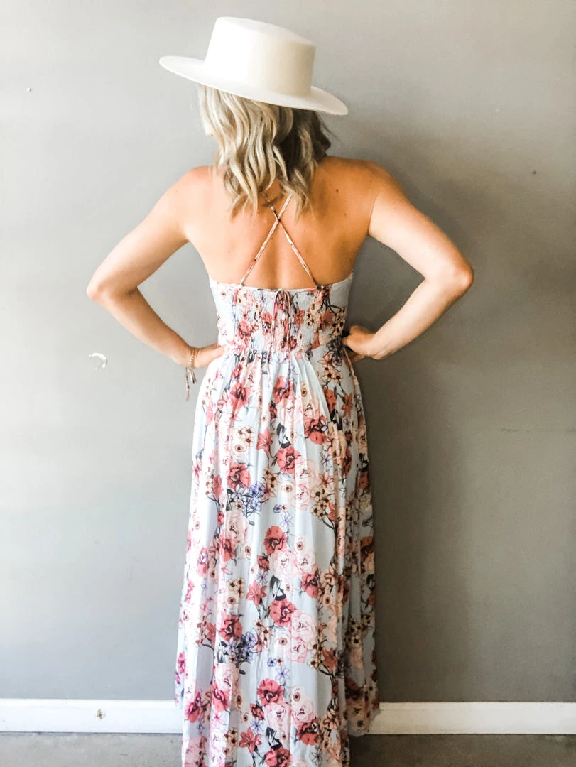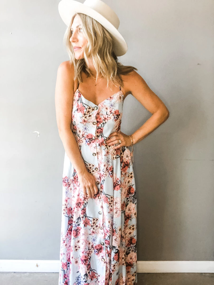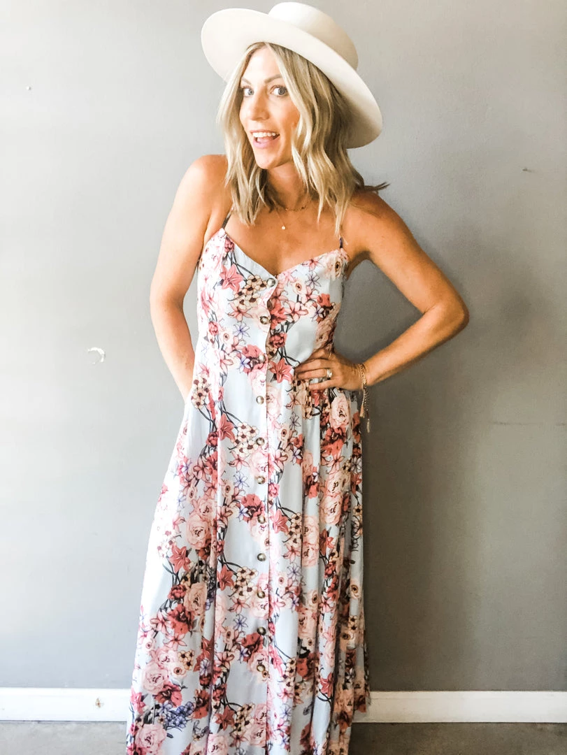 A flare floral print maxi dress with front button detail, v-neck, adjustable straps with tie, smocking at the back, and side pockets. Such a great floral option for summer and vacationing. Easy to dress up or wear casual. Sewn in breast cups for added support and shape.