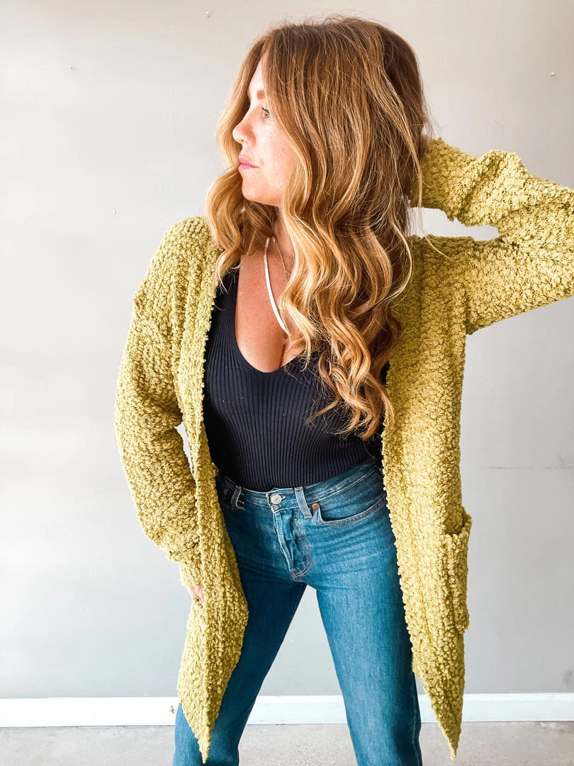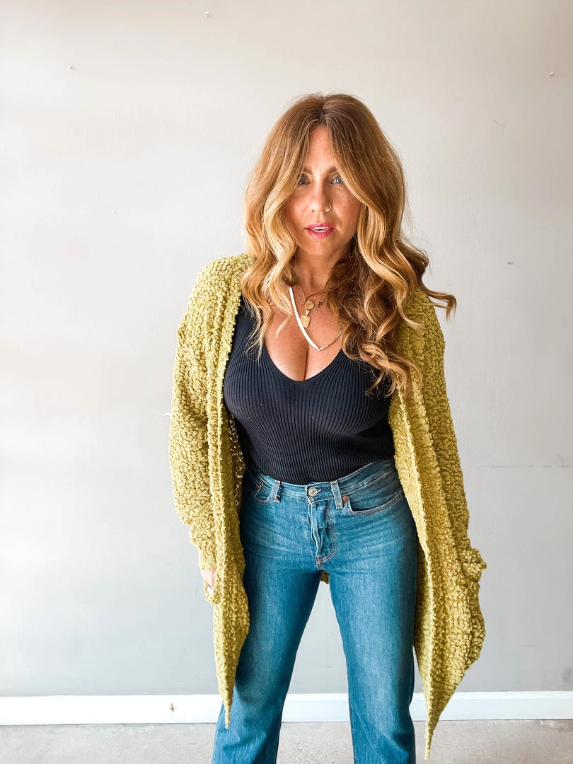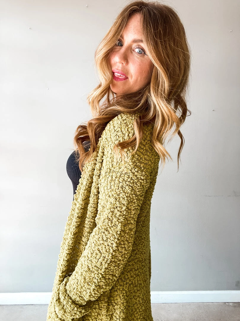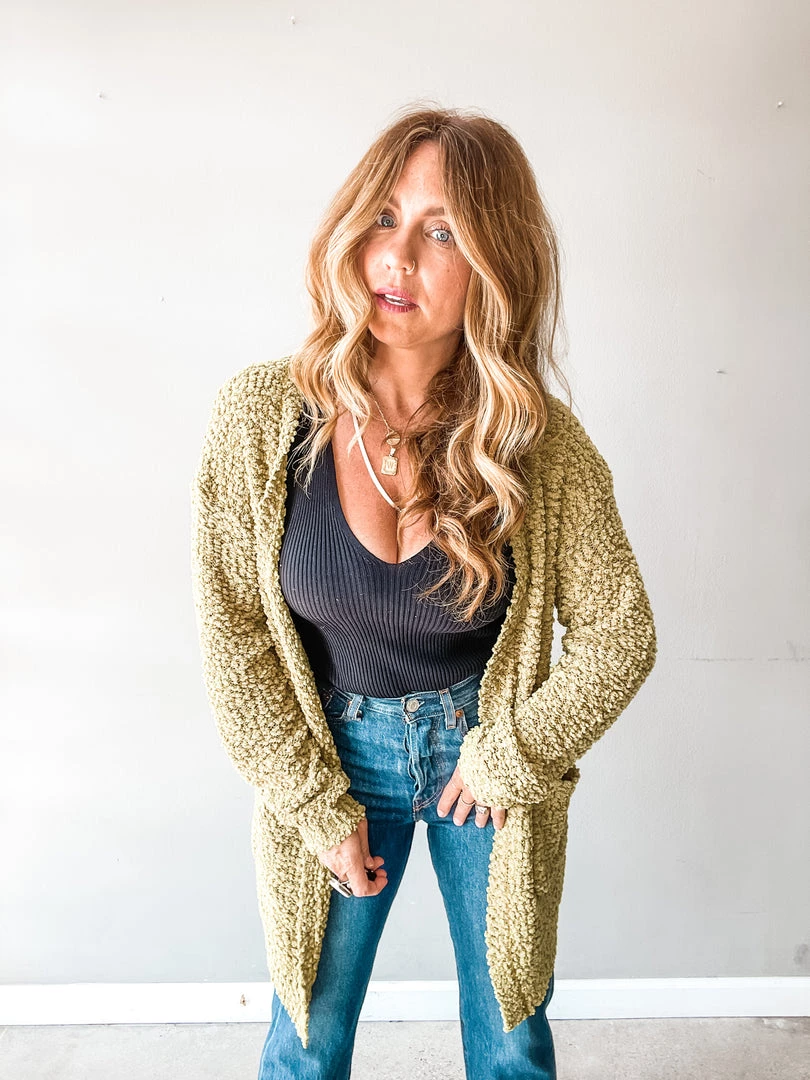 The Get Cozy Cardigan is everything we love about transitioning to Fall! This bright green, super cozy cardigan has deep side pockets and a longer silhouette. Great for pairing with denim cutoffs or your favorite jeans and boots later in the season!!!