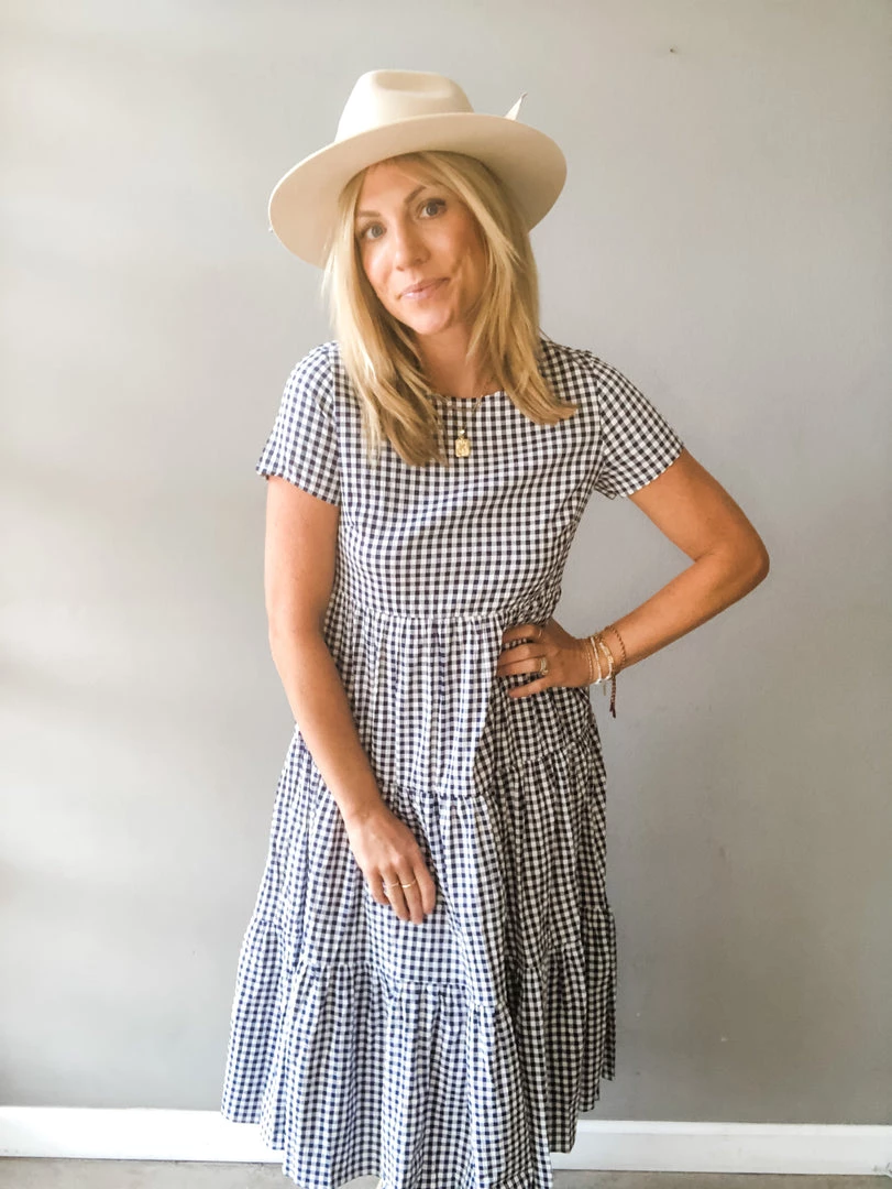 The Going In Gingham dress is a navy and cream gingham printed short sleeve tiered midi dress. This is a great summer dress to toss on and pair with your fav sneakers or slides. If you are loving the gingham trend this dress is a favorite. Great for different bottom shapes and sizes. Lined.