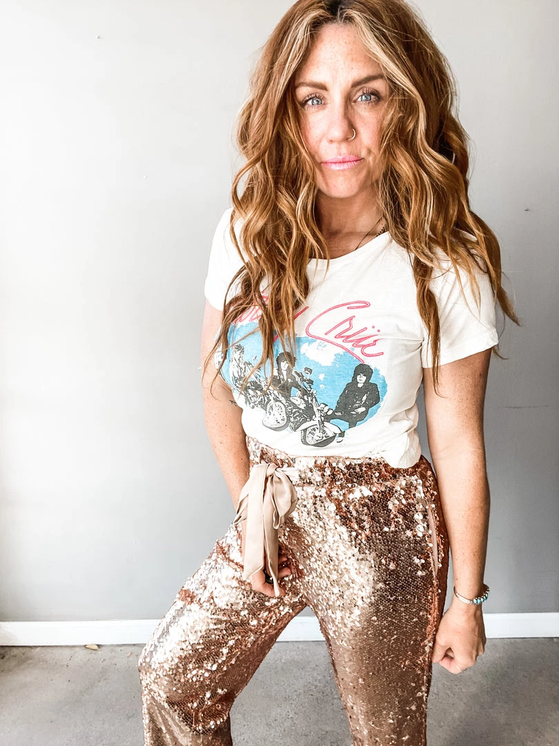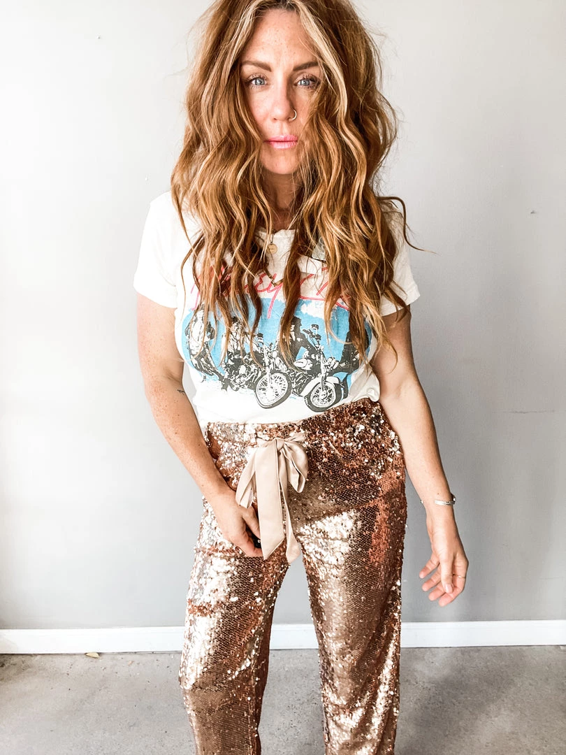 The I Want to Dance with Somebody Pant is a fun sequin, loose fitting pant with tie waist and jogger style fit. We love this statement piece toned down with a great graphic tee and sneaks or dressed up with a little crop or bodysuit and boots! Lots of options for the gal that isn’t afraid to make an entrance.
