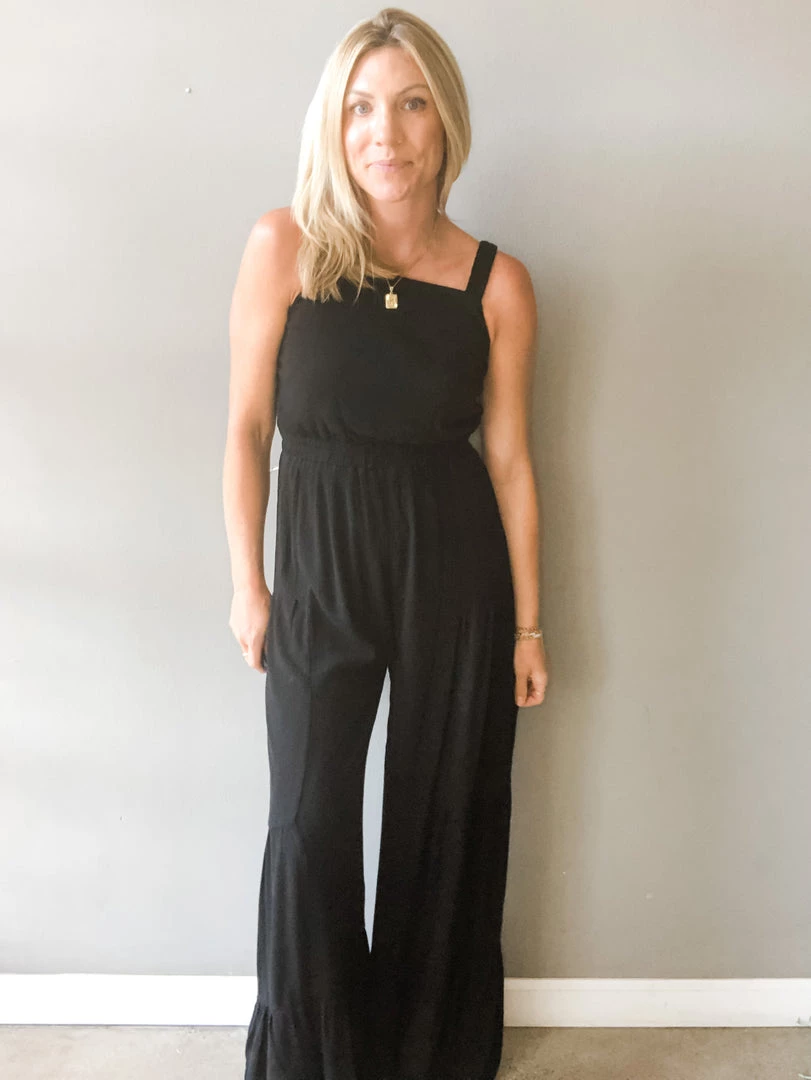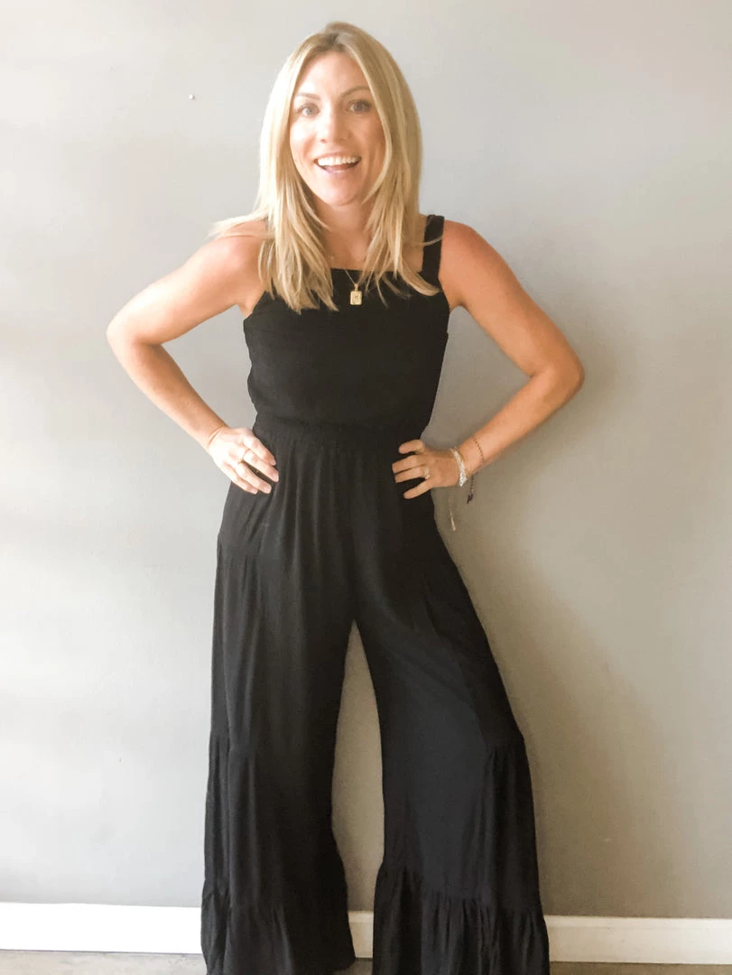 A great go to jumpsuit! This wide, tiered leg jumpsuit can be worn casual or dressed up for a night out. Featuring a textured fabric with a smocked back, elastic waist and shoulder straps. Great fit and fun piece for any occasion.