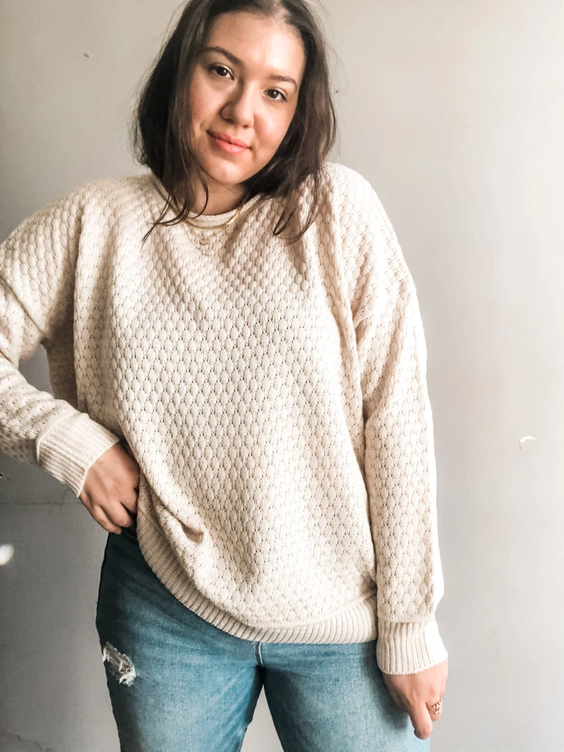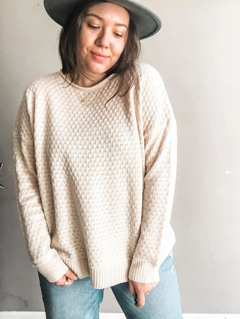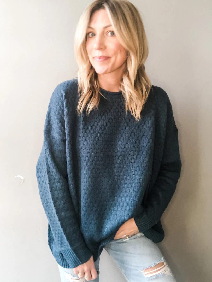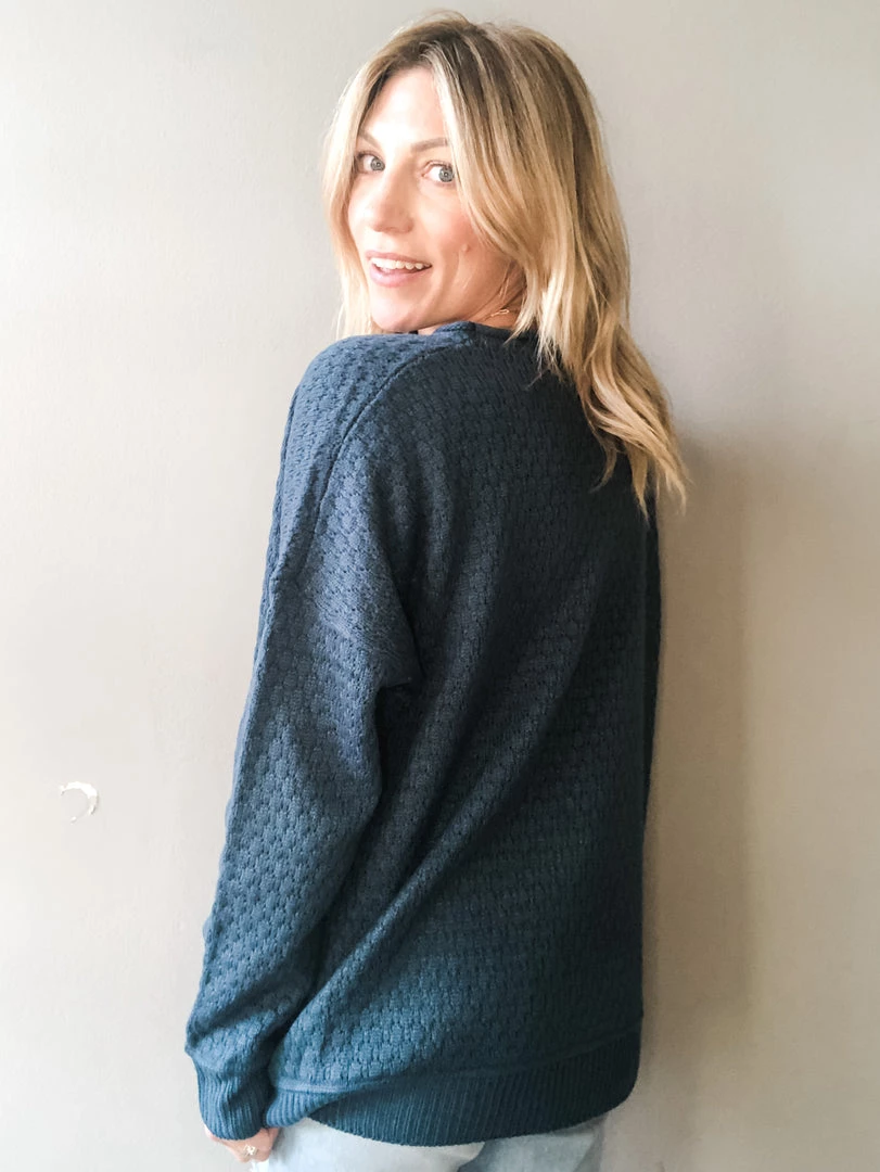 An embossed pullover knit sweater with ribbed cuff and hemline in a beautiful jade we are loving. Perfect to pair with a light denim. Dress up or down and take from work to play.