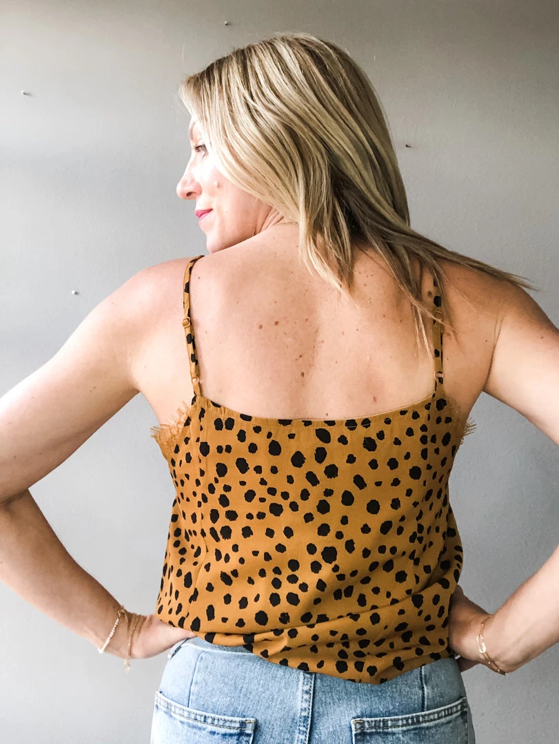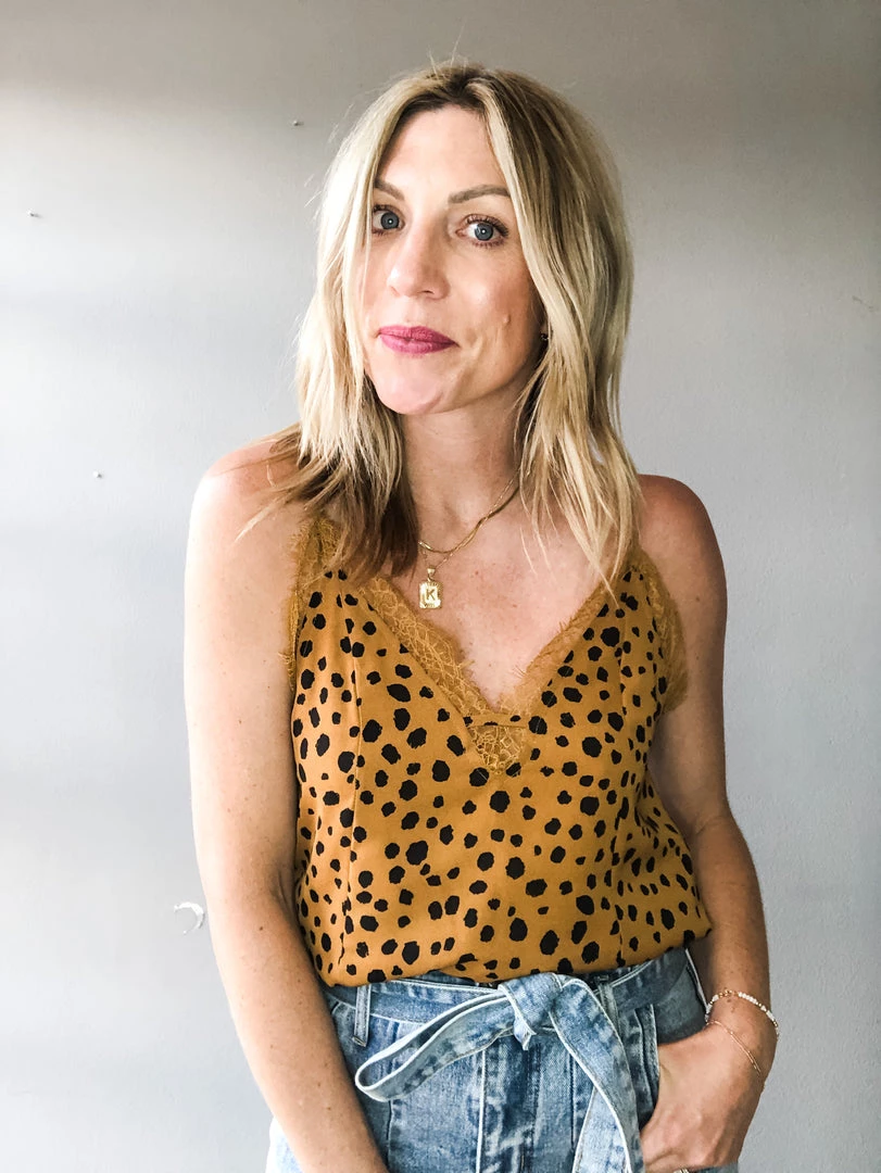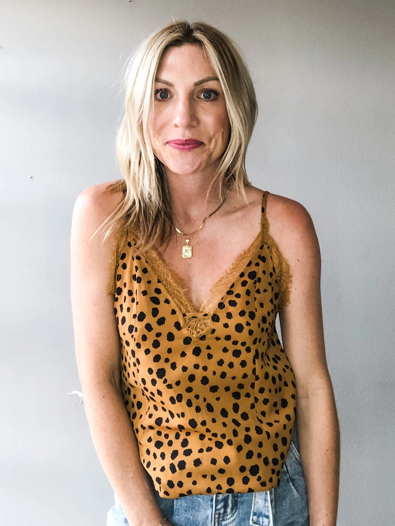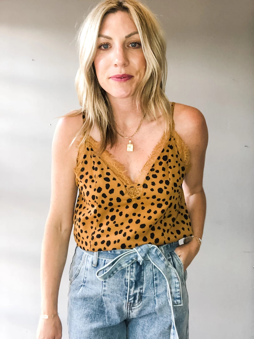 An all over print leopard print cami with adjustable shoulder straps, v-neck with lace trim detail. An easy way to dress up denim for a date night or pair under a blazer for a work event, this cami is fun, flirty and feminine. We love both color ways, you can’t go wrong with either!!