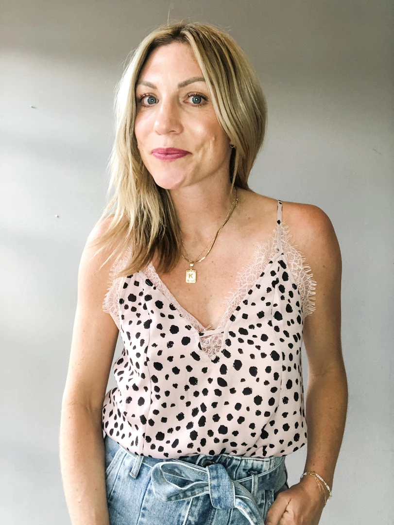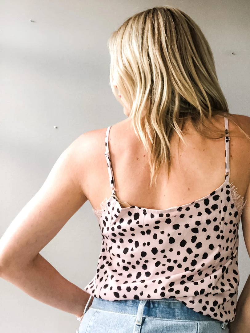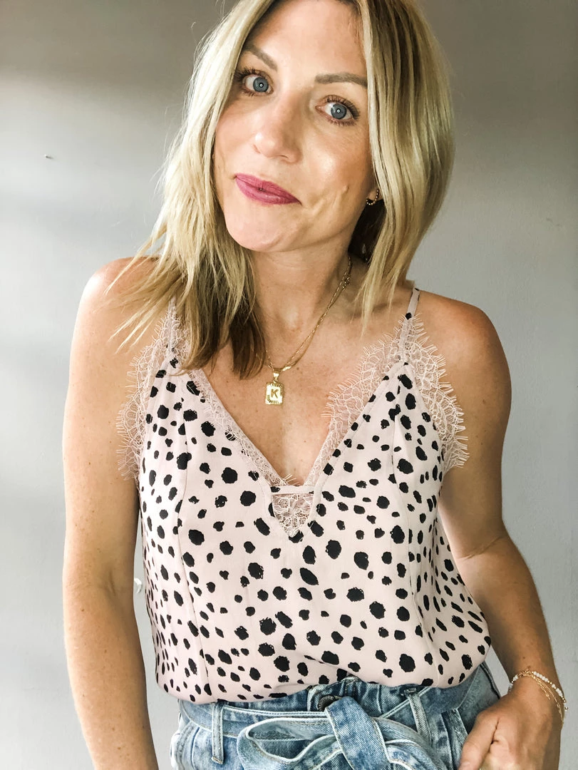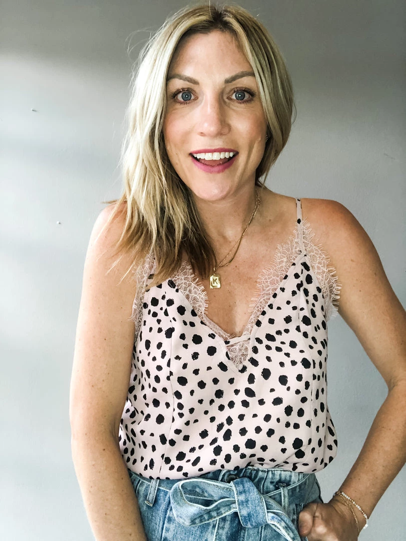 An all over print leopard print cami with adjustable shoulder straps, v-neck with lace trim detail. An easy way to dress up denim for a date night or pair under a blazer for a work event, this cami is fun, flirty and feminine. We love both color ways, you can’t go wrong with either!!
