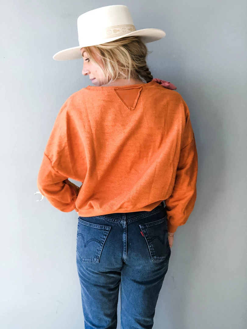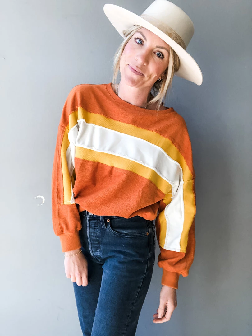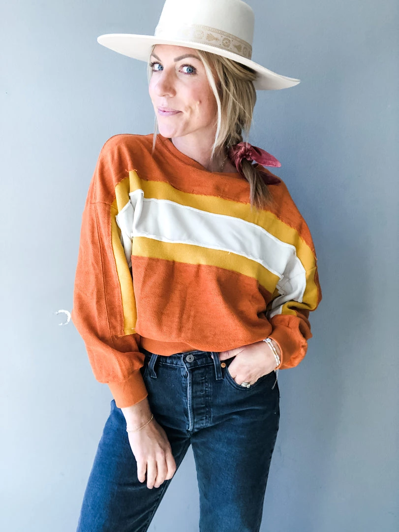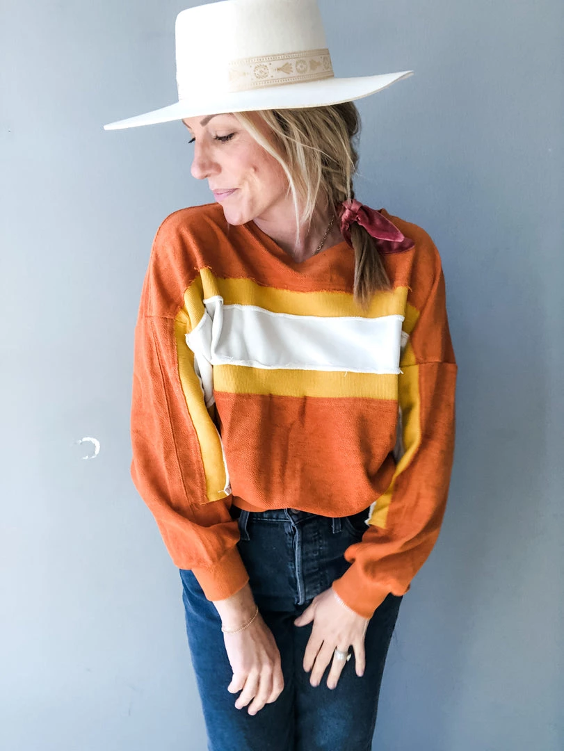 A lightweight color block french terry pullover top. With exposed seams, contrasting fabrics and a retro color way, the mini top is a fall favorite. With a slightly cropped fit, pair with your fav high waisted denim and sneaks for an everyday look we can’t resist.