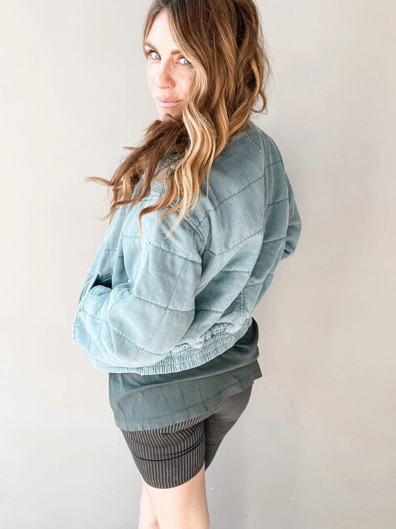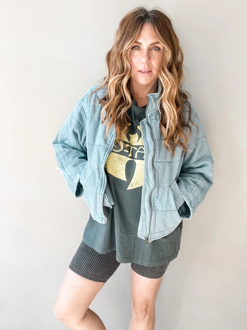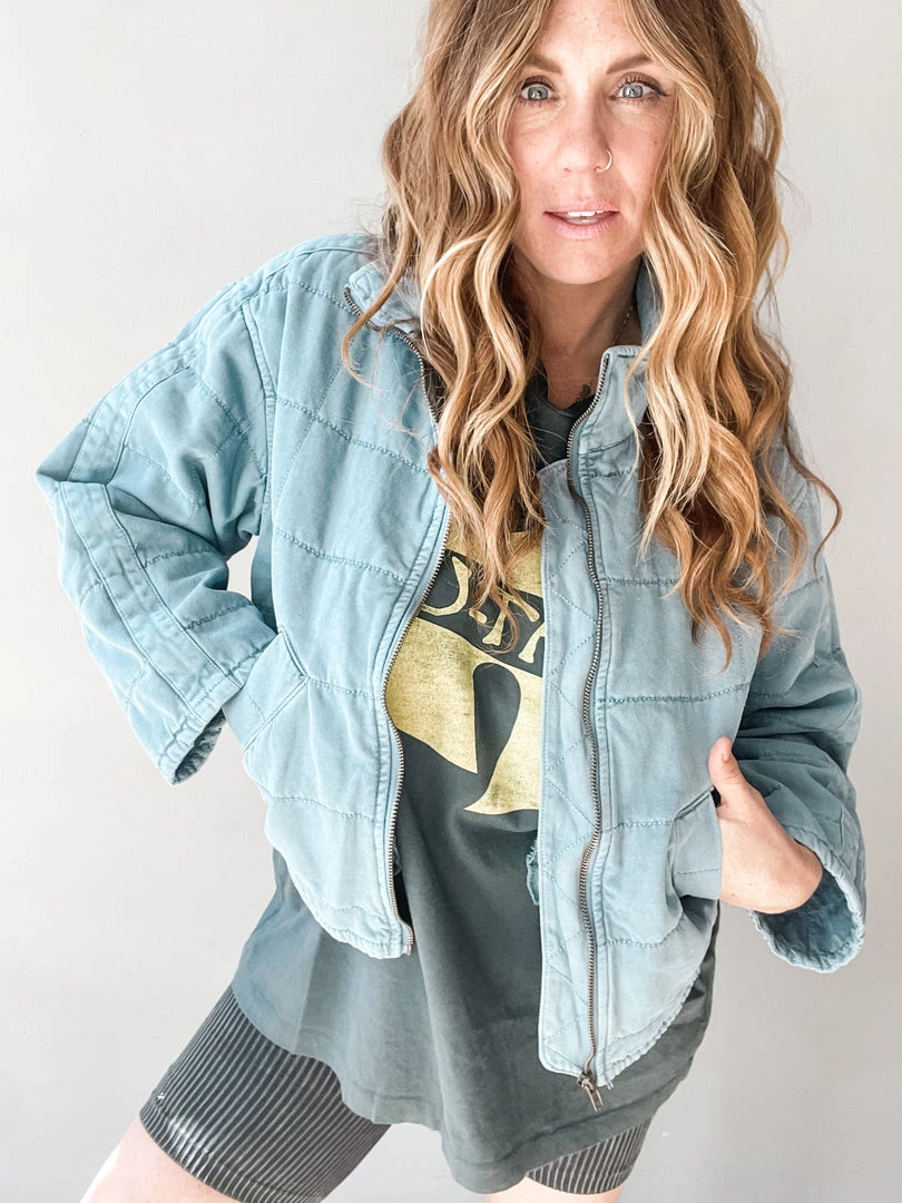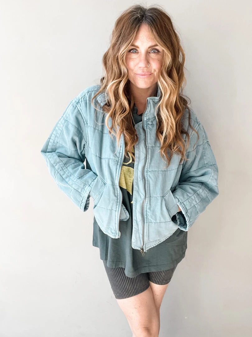 The item of the season…the quilted jacket!! A cozy and super functional piece we love tossed over so many Fall looks, the Open Roads Jacket has a fun but classic update with its denim fabric and colorway. This jacket features a mock high neck collar with shorter batwing style sleeves and elasticated lower back hem. Side pocket details and a slightly boxy fit makes this denim jacket a shop favorite.
