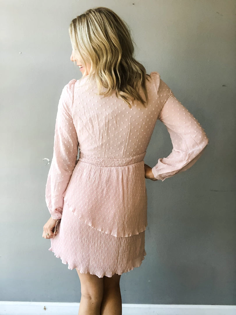 A swiss dot ruffle v-neck chiffon mini dress that is perfect for any special occasion! A cross over front, long sleeves with buttoned wrist, layered pleated skirt with side zipper closure. So chic, feminine and sophisticated. From weddings to work events, this dress has you looking good!