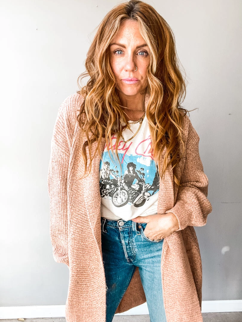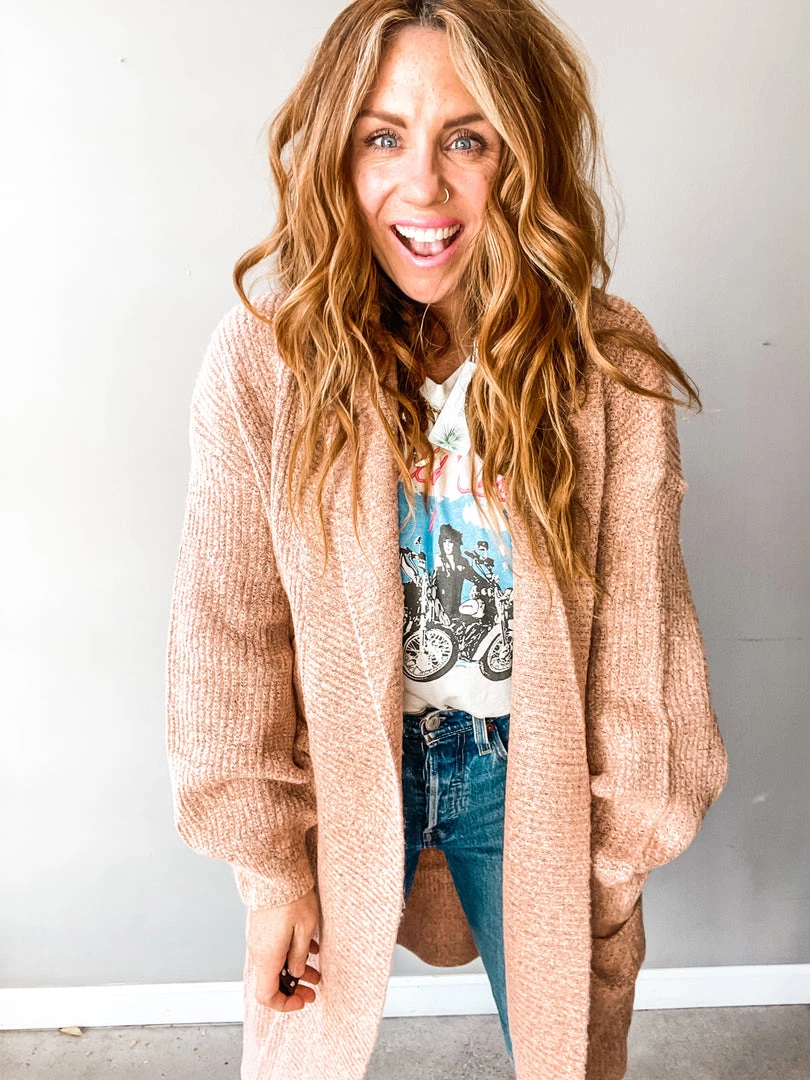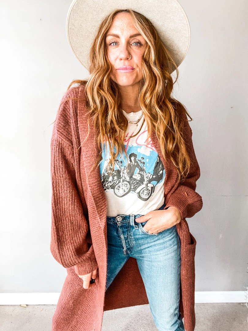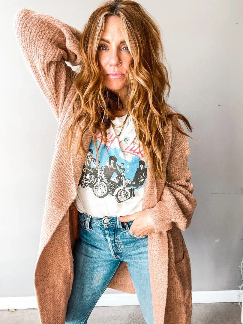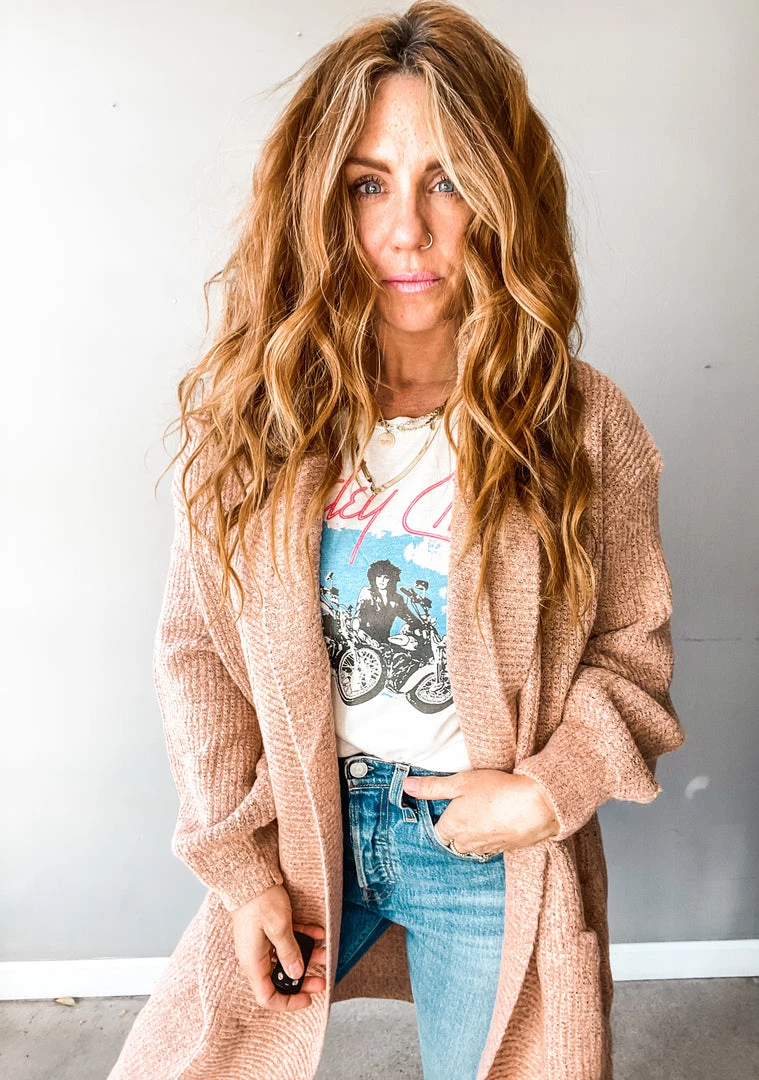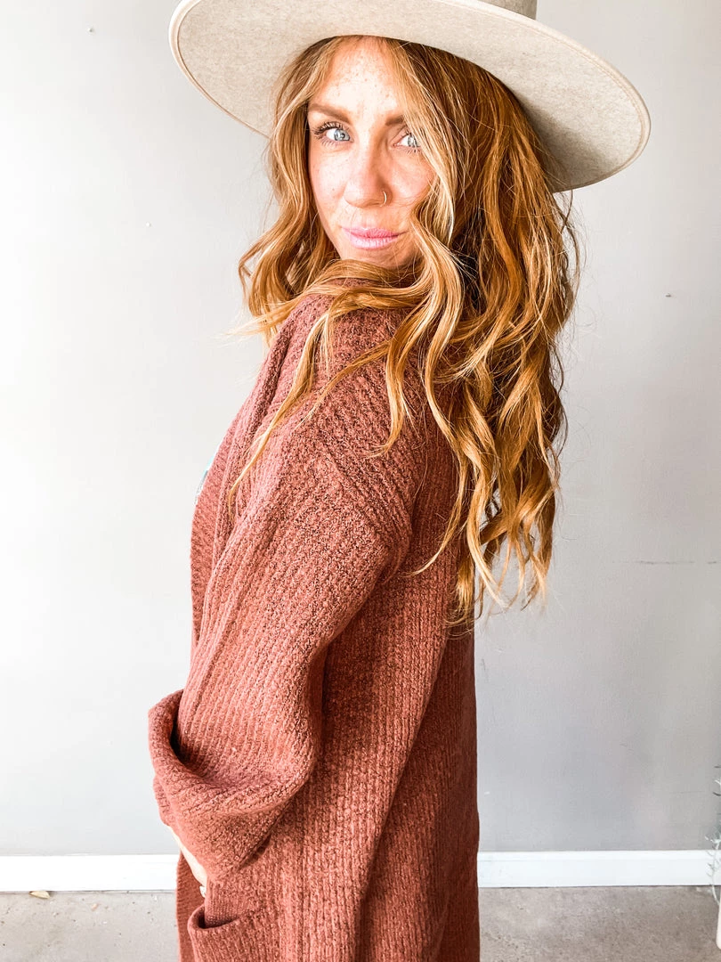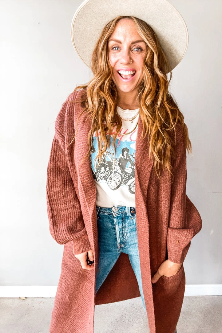 The kind of cardigan you want to cozy up fireside in! This VERY soft, longer fitting cardigan features deep side pockets and a delicious fabric blend to give it texture and a silhouette you will wear season after season.