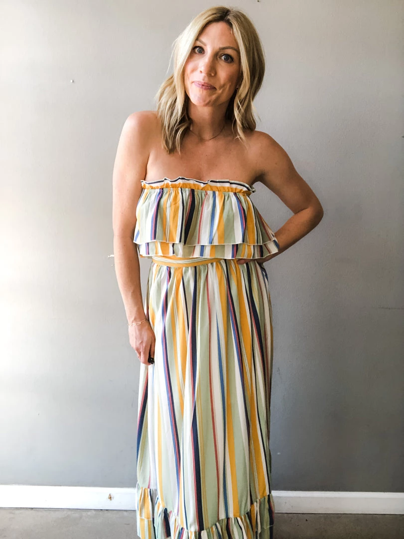 This wanderlust skirt set is giving us all the vaca feels. A strapless ruffle top with elastic to hold her in place pairs with the matching skirt. The skirt has a wrap style look, ruffle hemline, a high waist with a side zipper closure. Wear seperate or as a set, we are loving on the colorful pastel stripes and all the beautiful places she would love to go. Sold as a set.