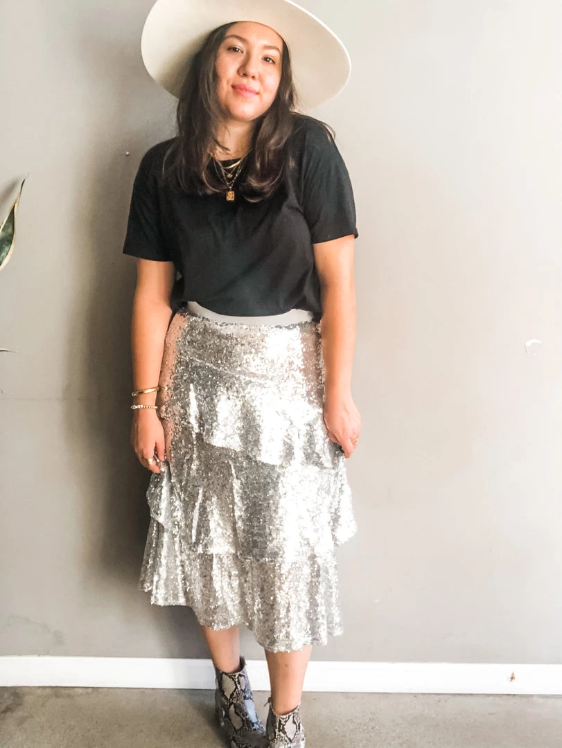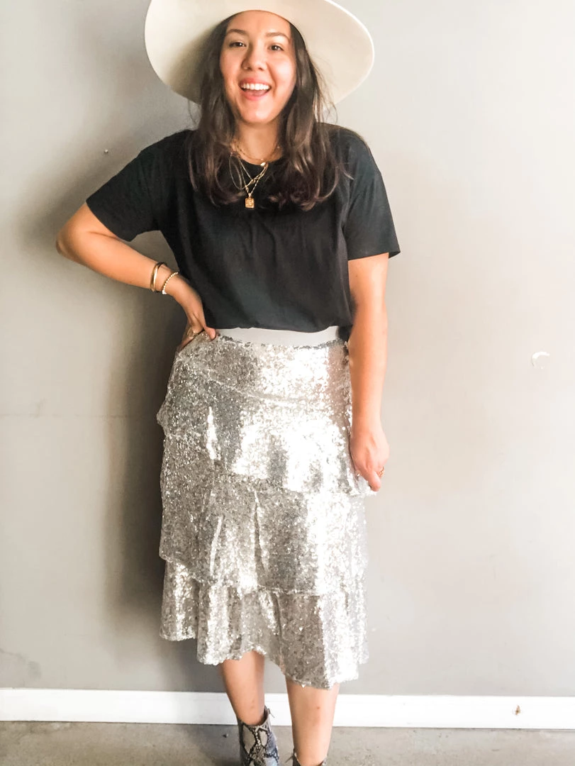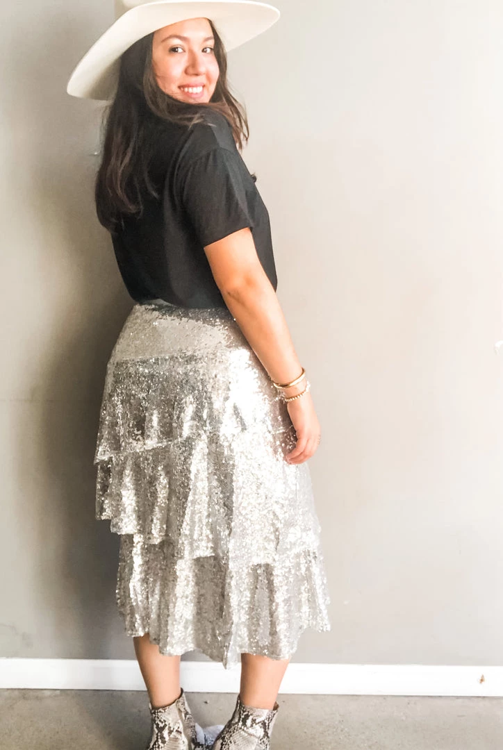 The type of skirt that looks killer on and doesn’t sacrifice on any of the comfort!! This ruffle tiered midi skirt packs a sequin punch. Hidden zipper at the side with eye-hook closure and elasticated waist makes for an easy and flattering fit. We love it paired with a tee and some boots for a casual look or dressed up with a heel and a sweet knit.