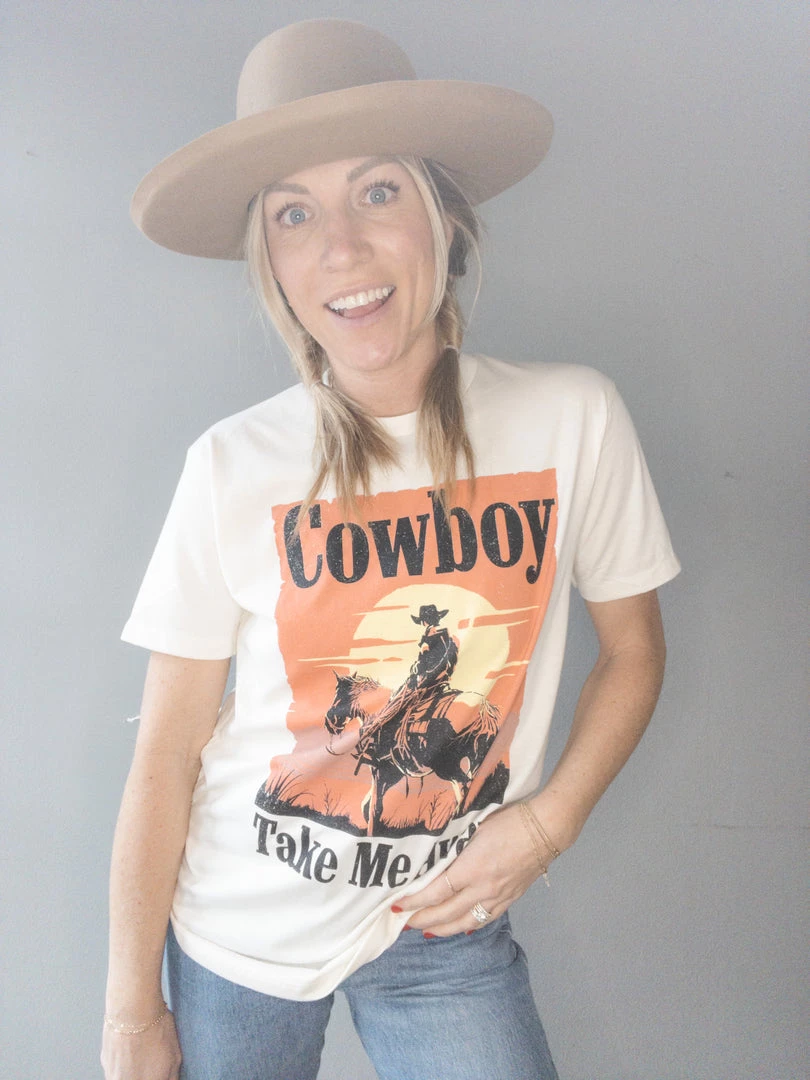 Cowboy Take Me Away is a colorful graphic on an ivory boyfriend tee. Loose in all the right places and features an open neckline and slightly dropped sleeves.