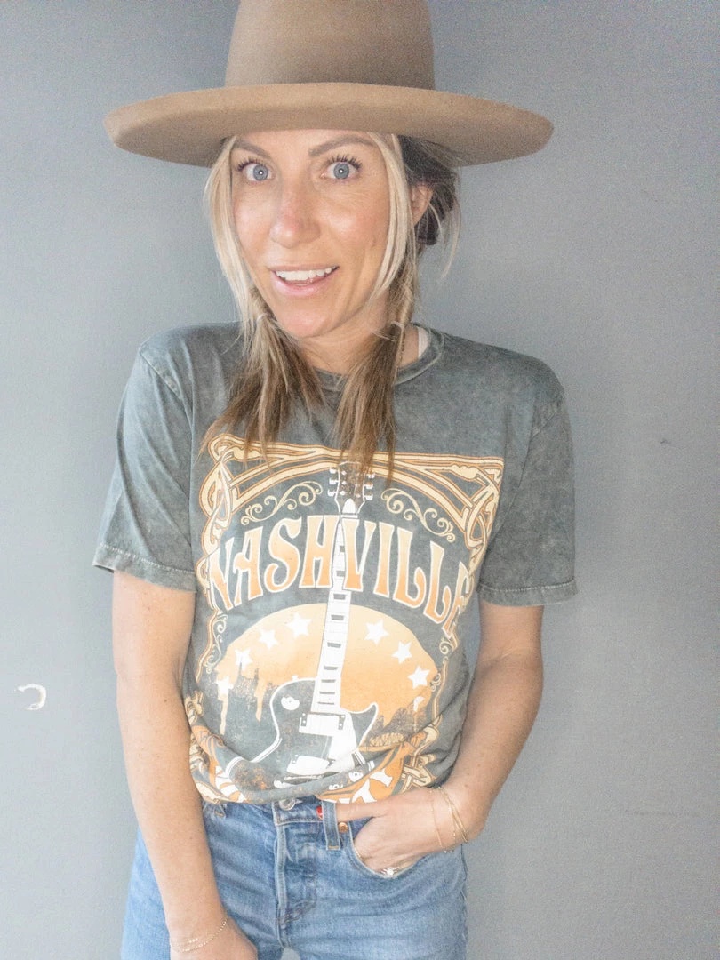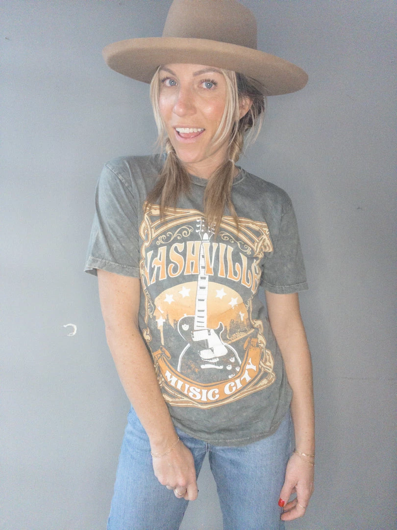 Nashville Music City is a colorful graphic on a stone grey mineral washed boyfriend tee. Loose in all the right places and featuresĀ an open neckline and slightly dropped sleeves.