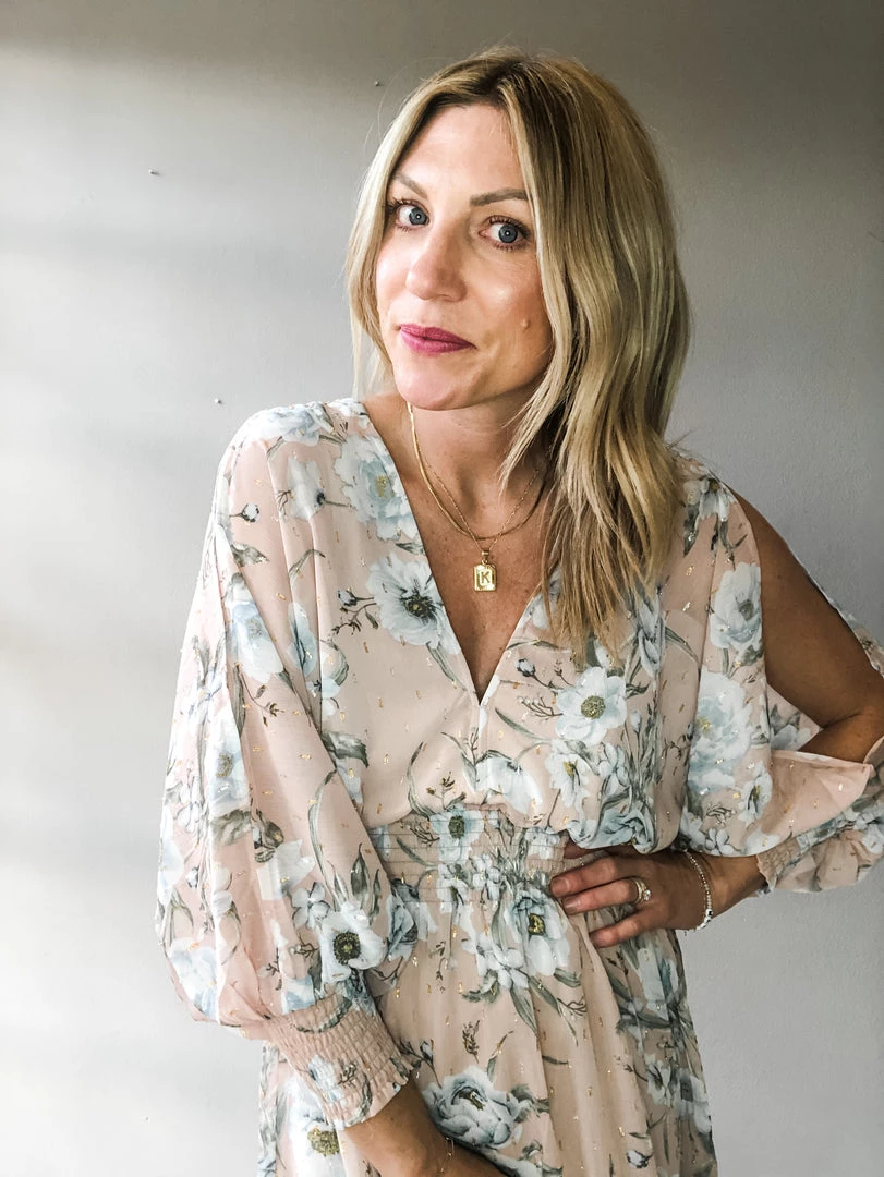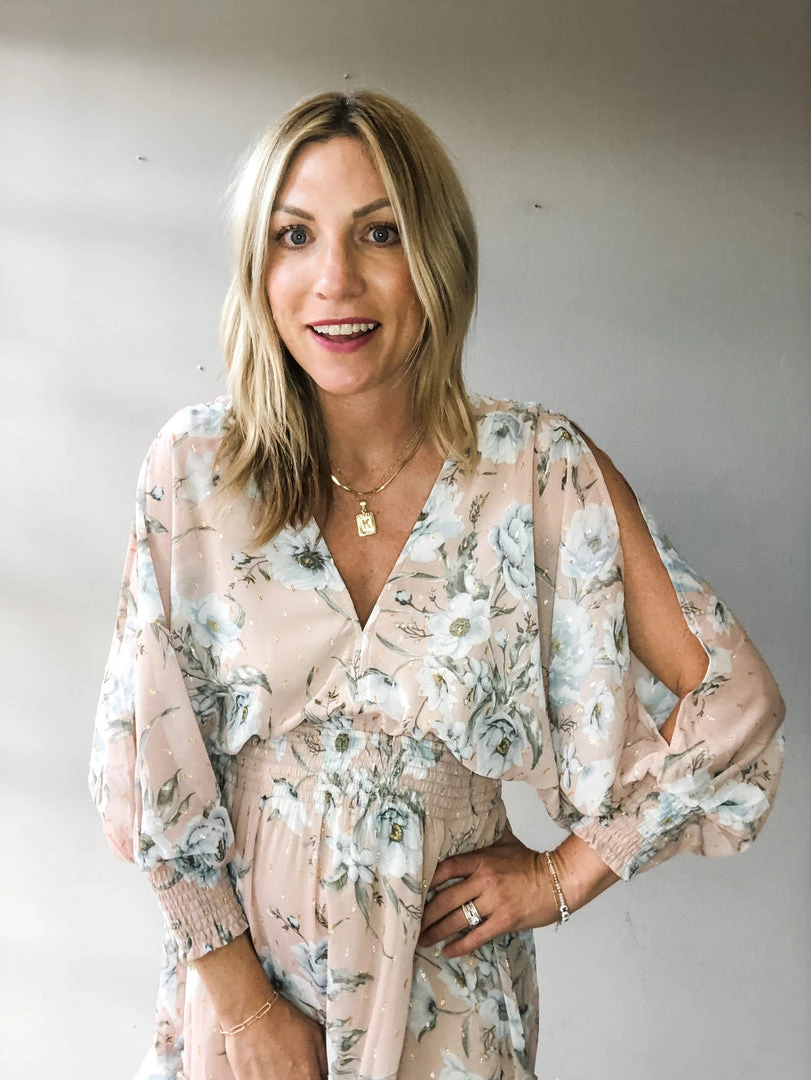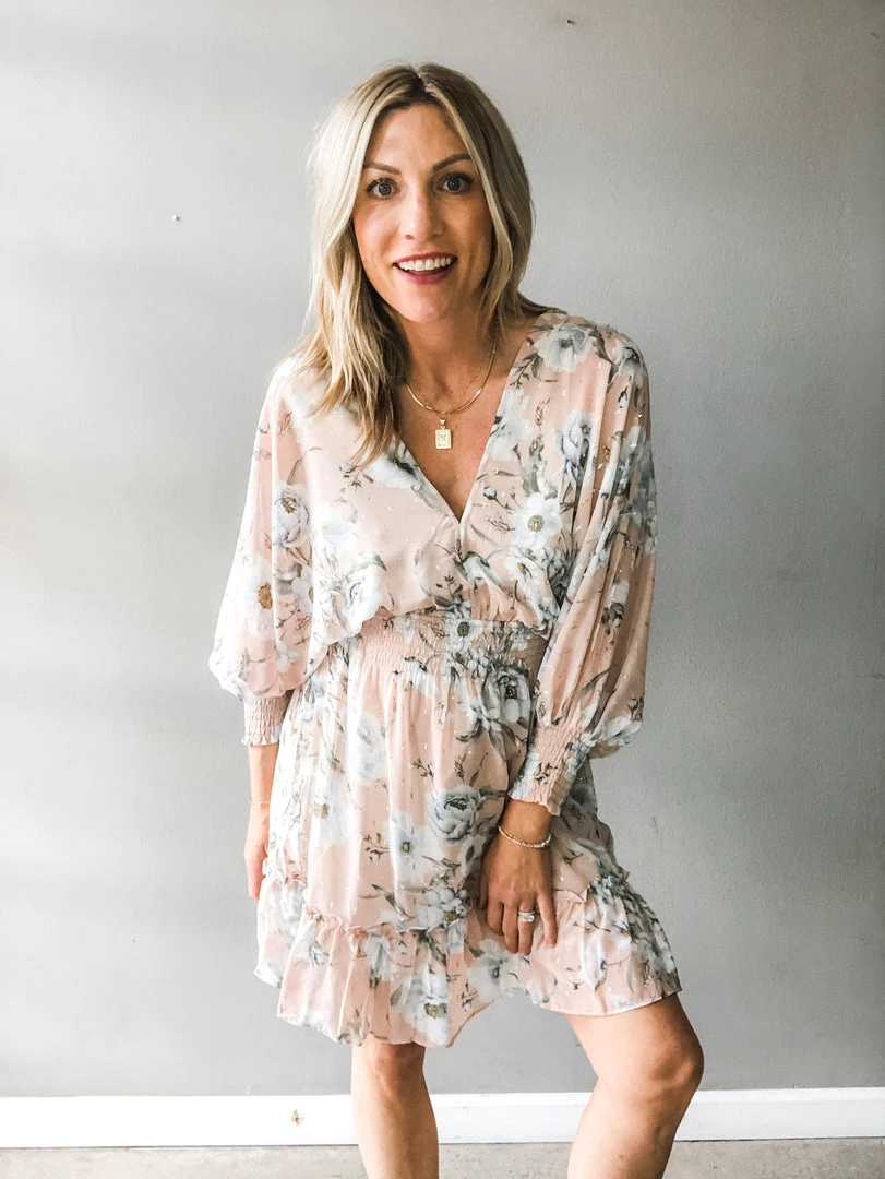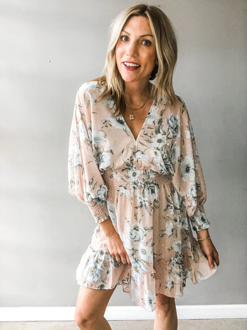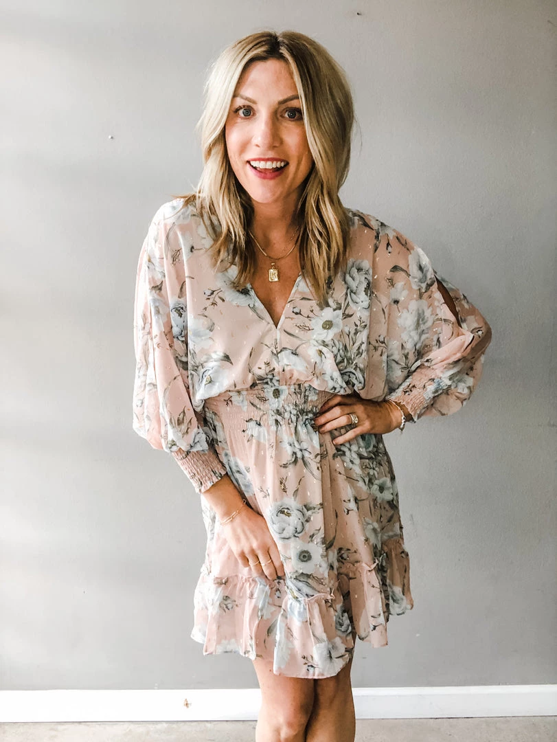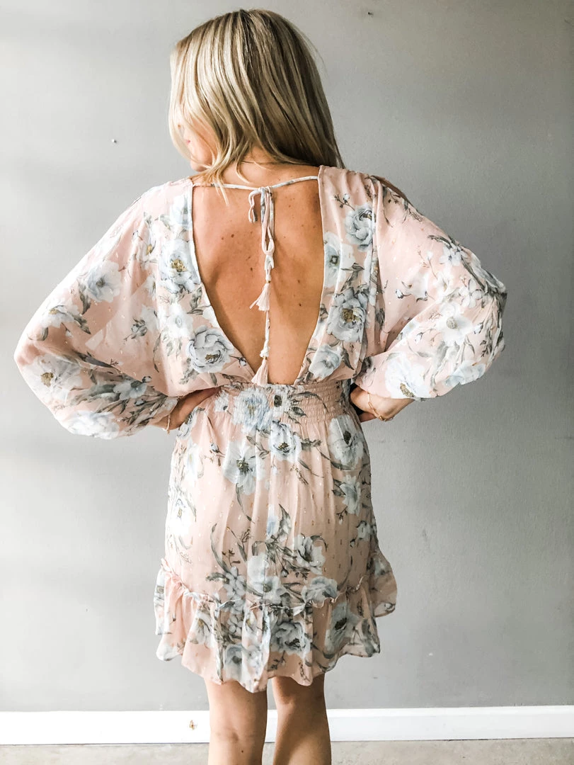 A mini dress in a pretty floral print with subtle metallic details throughout. Featuring a v-neckline, long split sleeves with a smocked elastic wrist cuff, an open back with tassel tie closure, a smocked elastic waist for definition, and a ruffle trimmed tiered skirt. A great option for brunch, a wedding shower or any special occasion. The perfect summer dress that is soft, sweet, and feminine.