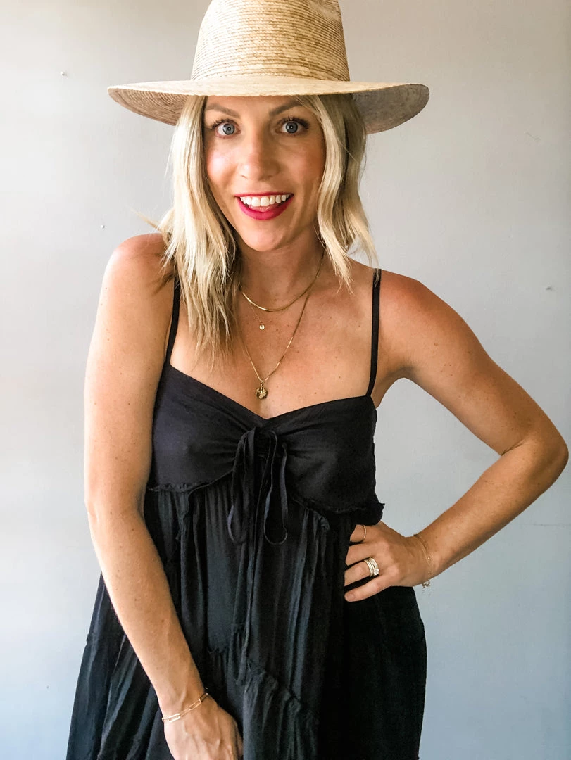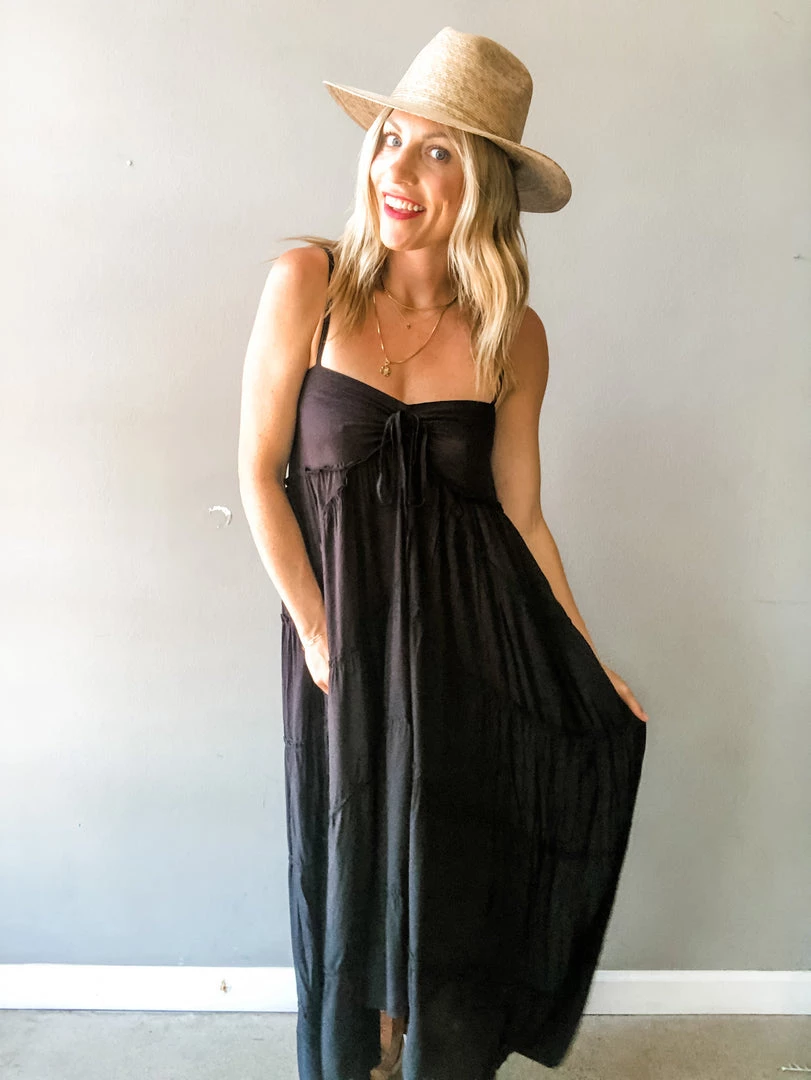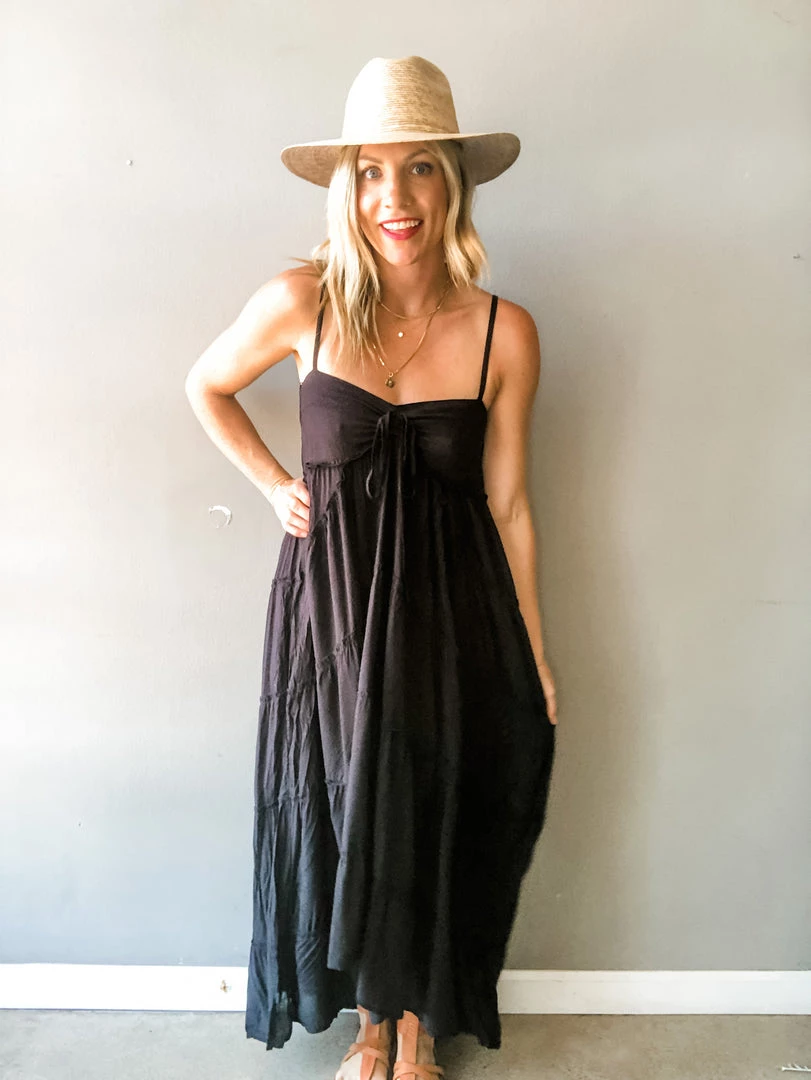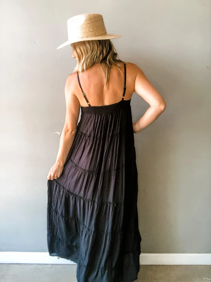 A super light weight tiered maxi dress with adjustable center front tie and shoulder straps with back smocking. Perfect dress for frolicking barefoot in the sand. Can easily be dressed up or paired with sandals for an easy go to dress all summer long.