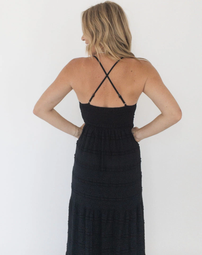This dress features a smocked back with adjustable straps, a surplice neckline that will stay put and a smocked back. We love the ultra feminine details of this cross back, tiered maxi. Lining attached.