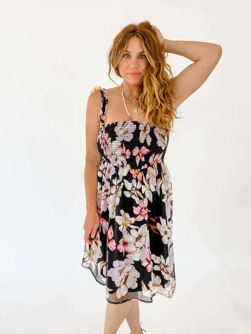 The Summer Nights Mini Dress is perfect for just that…summer nights!! A flirty floral number with gauzy silhouette and pink, orange and purple large floral print. With ruffle trim sleeves, smocked bust and adjustable tie back. This mini dress features plenty of stretch with an elasticated waistline and smocked bust. An easy fitting floral dress that is so easy to toss on and go! Double lined skirt.