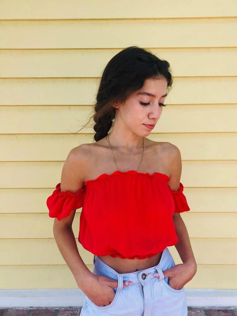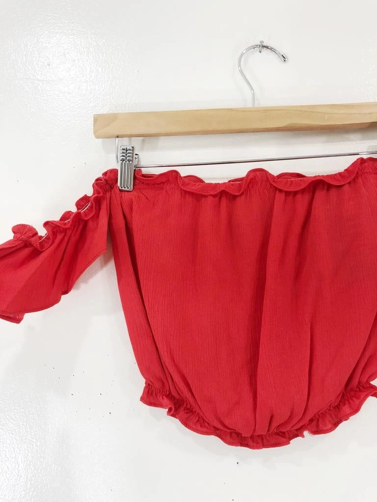 A cropped strapless top with off the shoulder sleeves that is ready for your next summer bbq. Pair with denim cutoffs and sneaks for a backyard look we love.