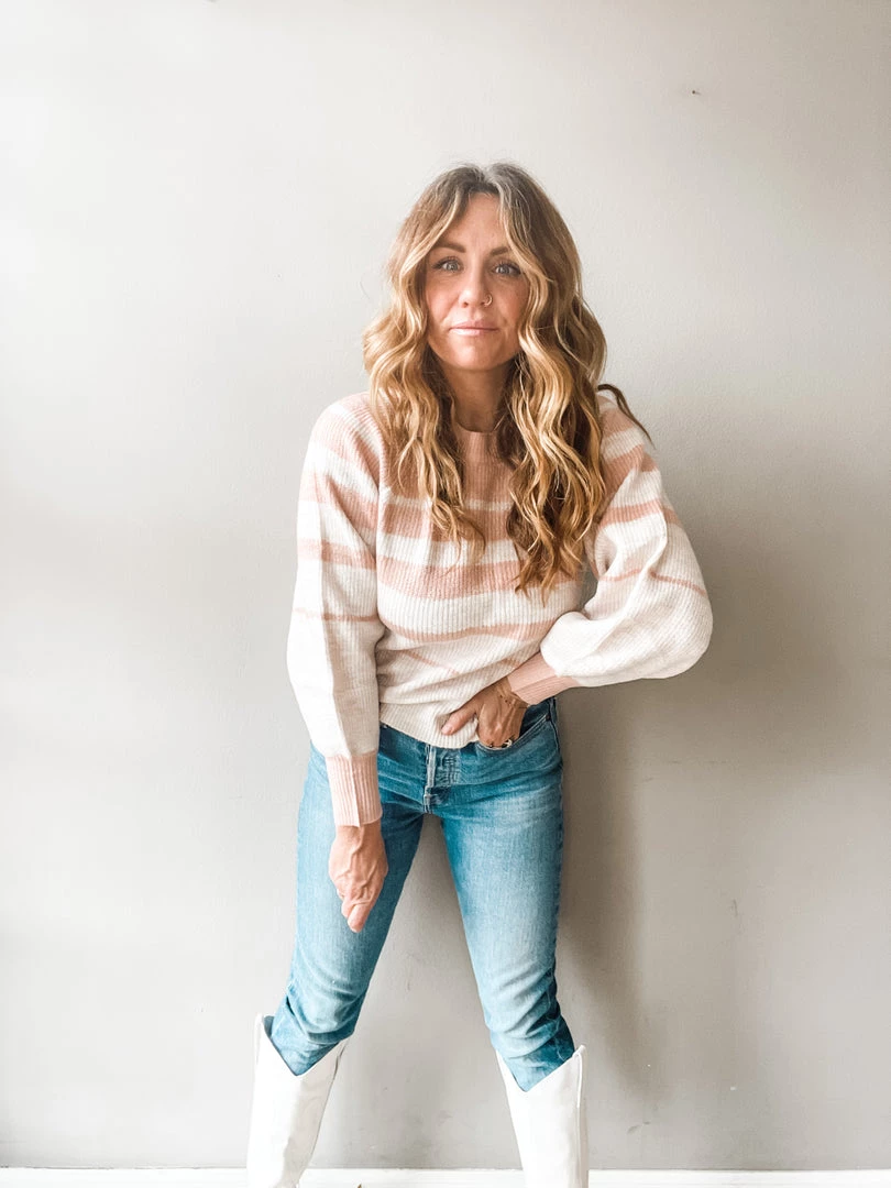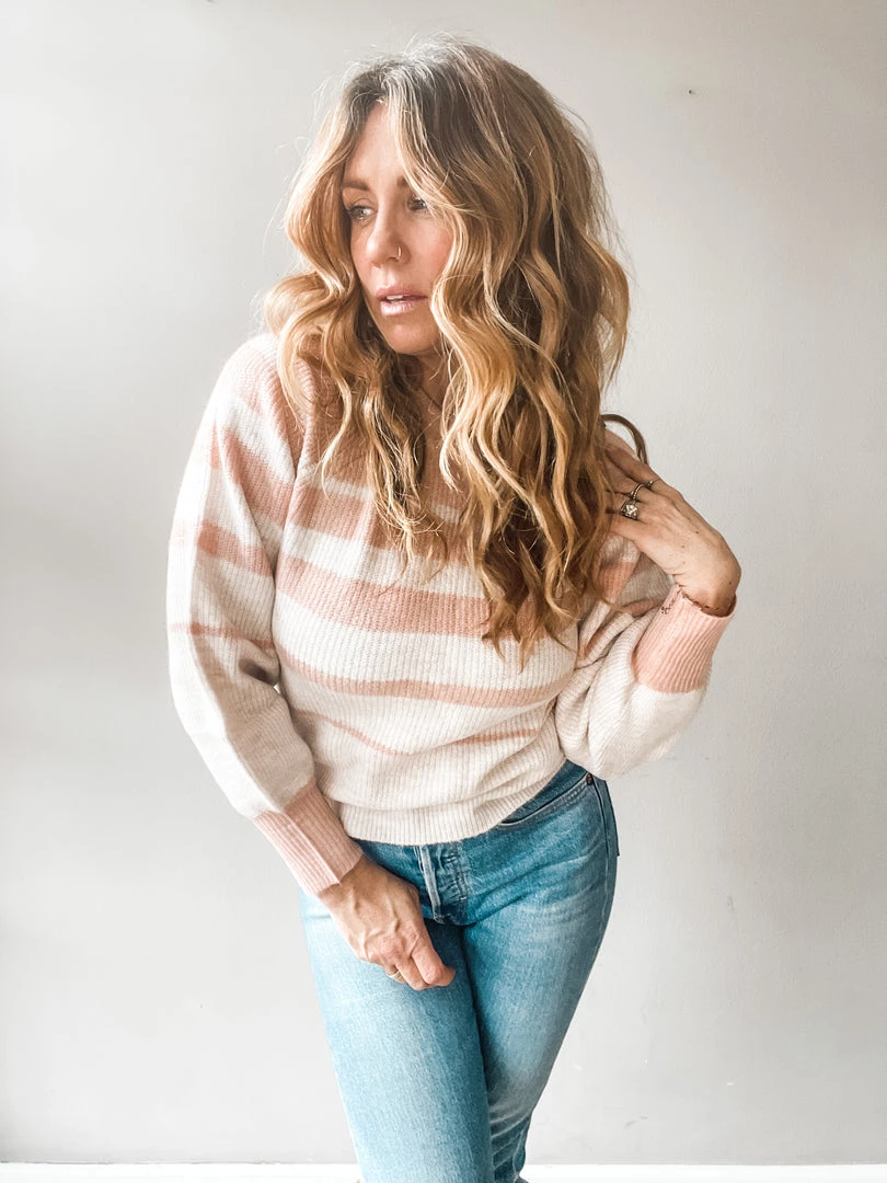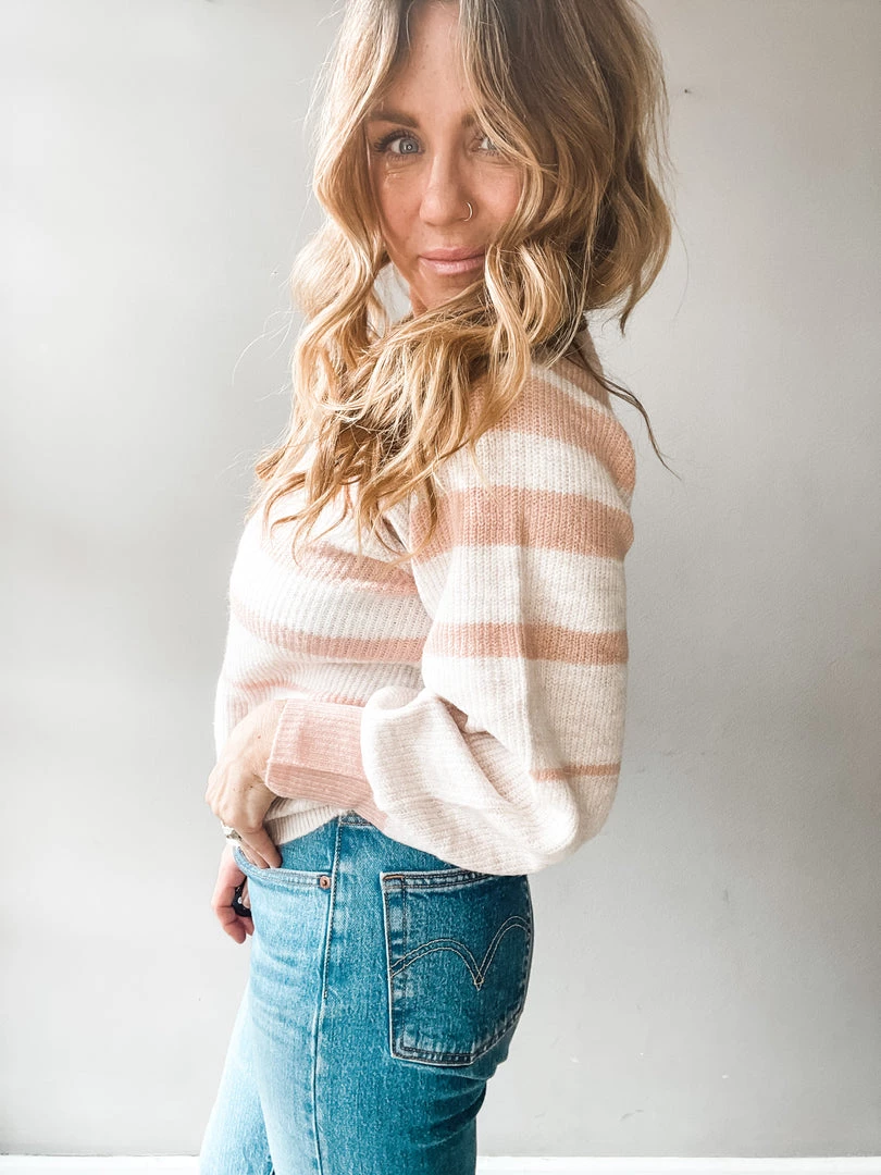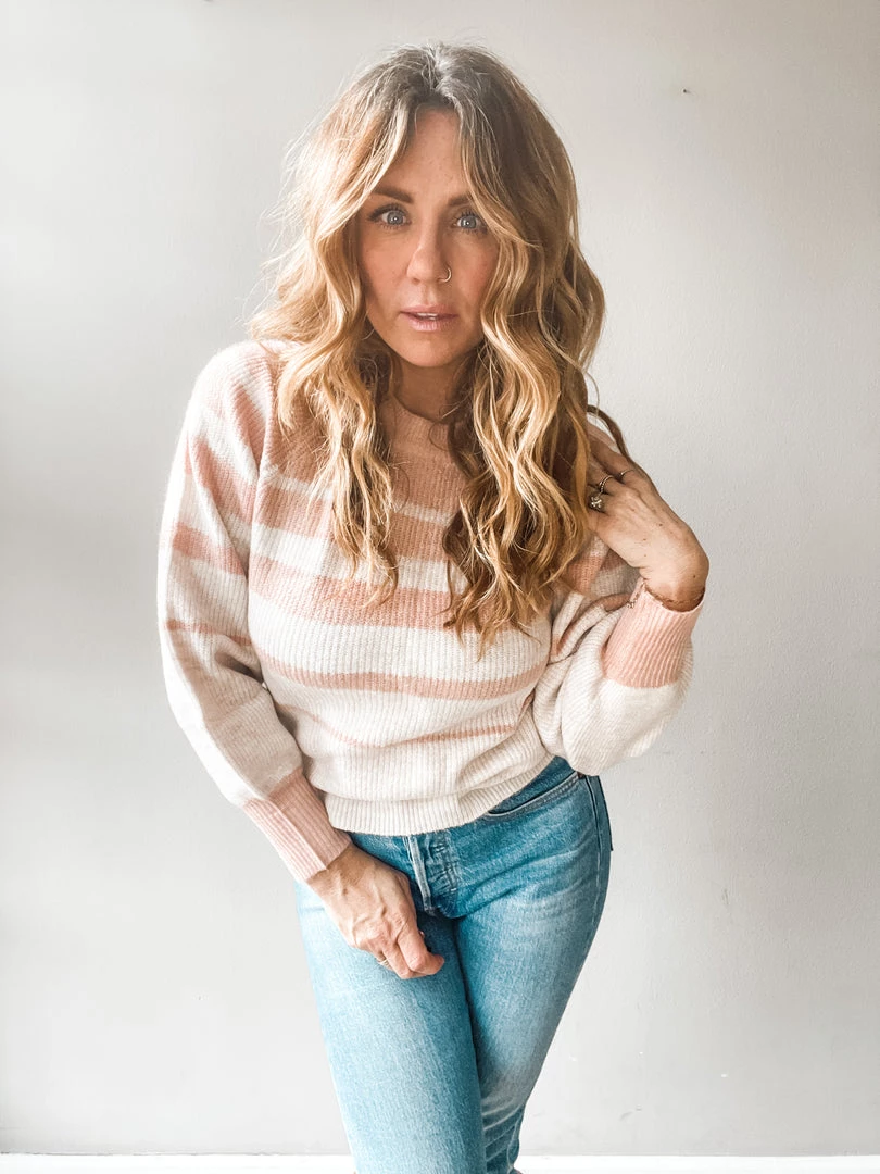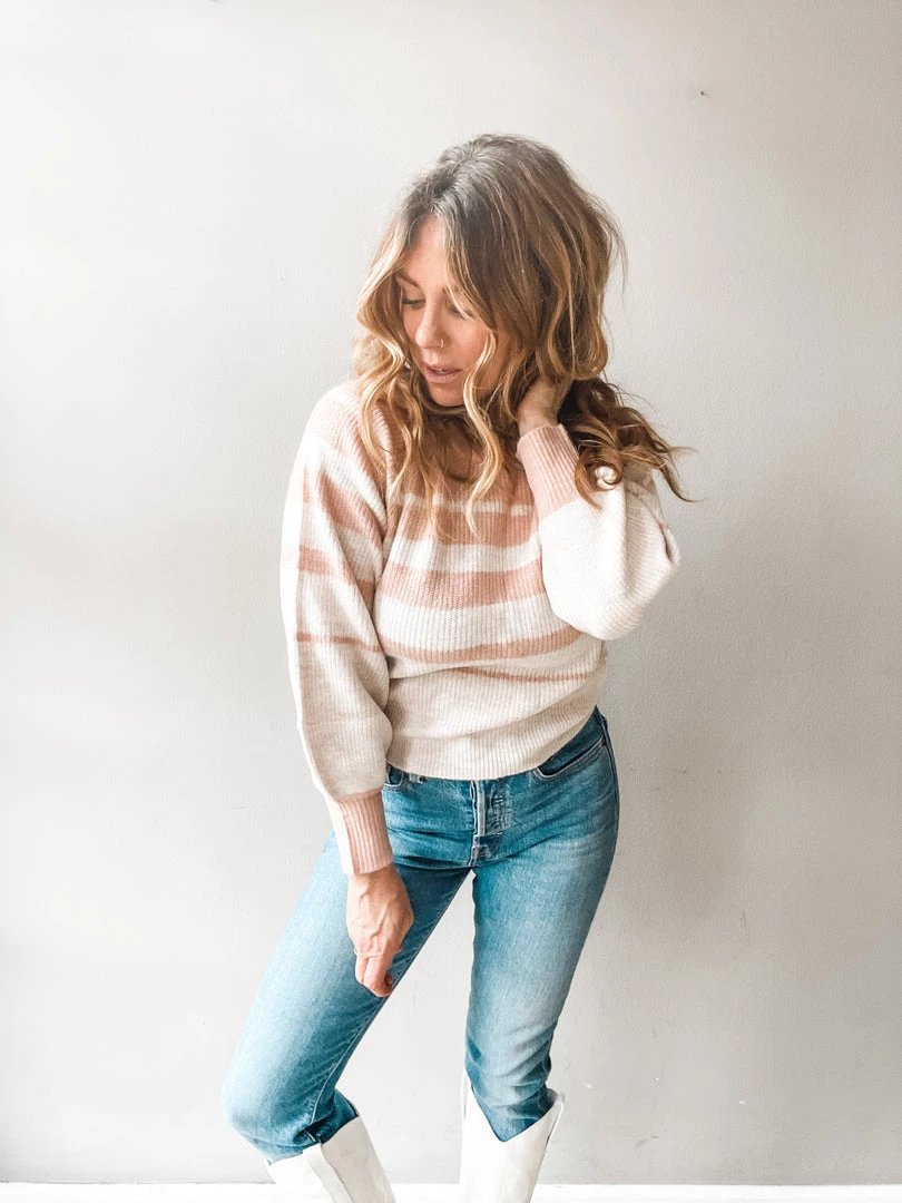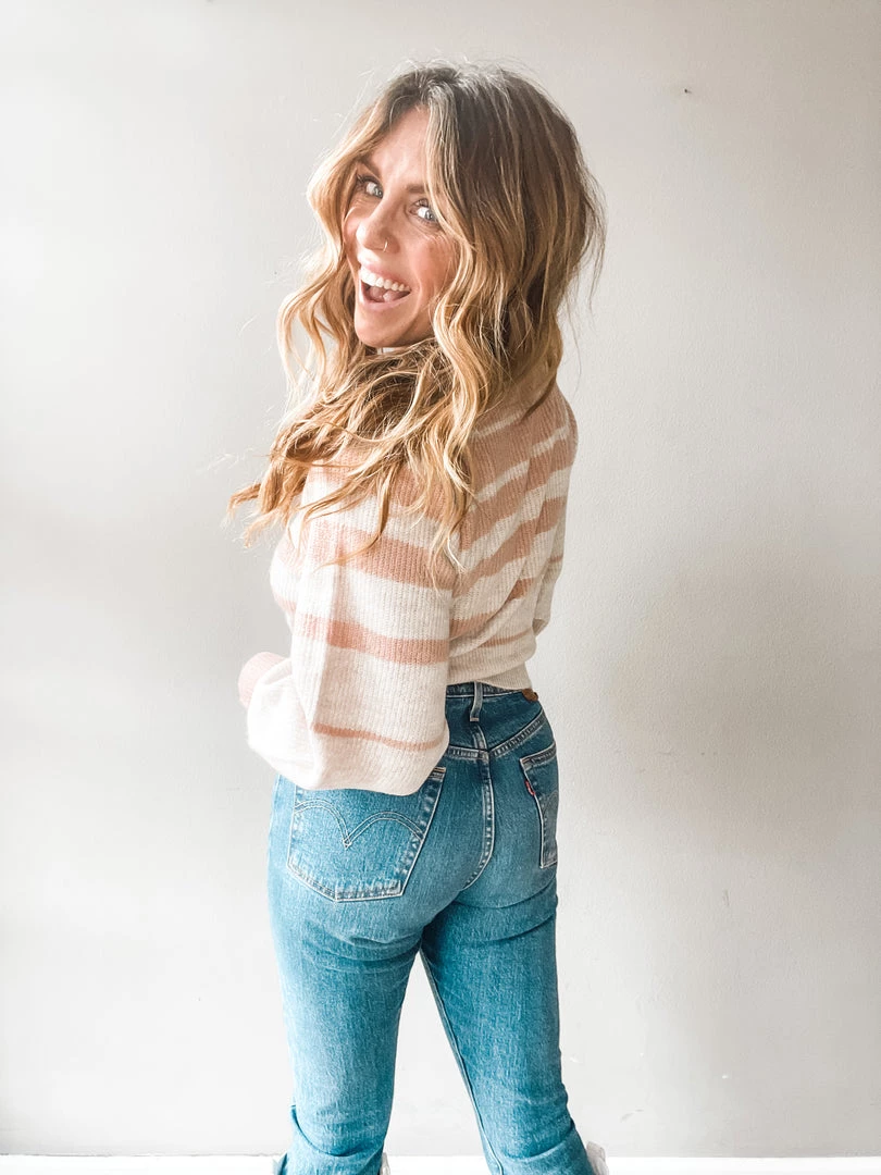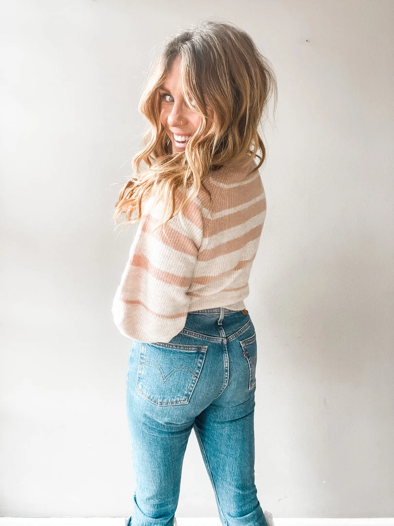 The Apricot Apres Sweater is a chic classic fitted sweater with apricot and cream striped details. Its the perfect feminine little sweater for any occasion and to pair with any color denim!