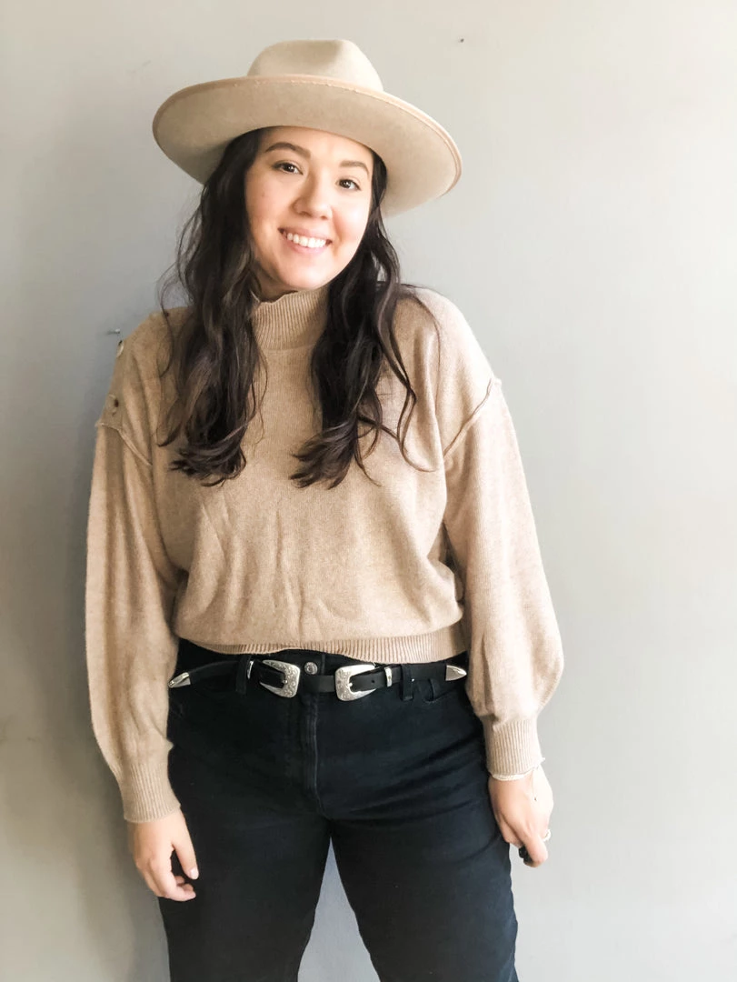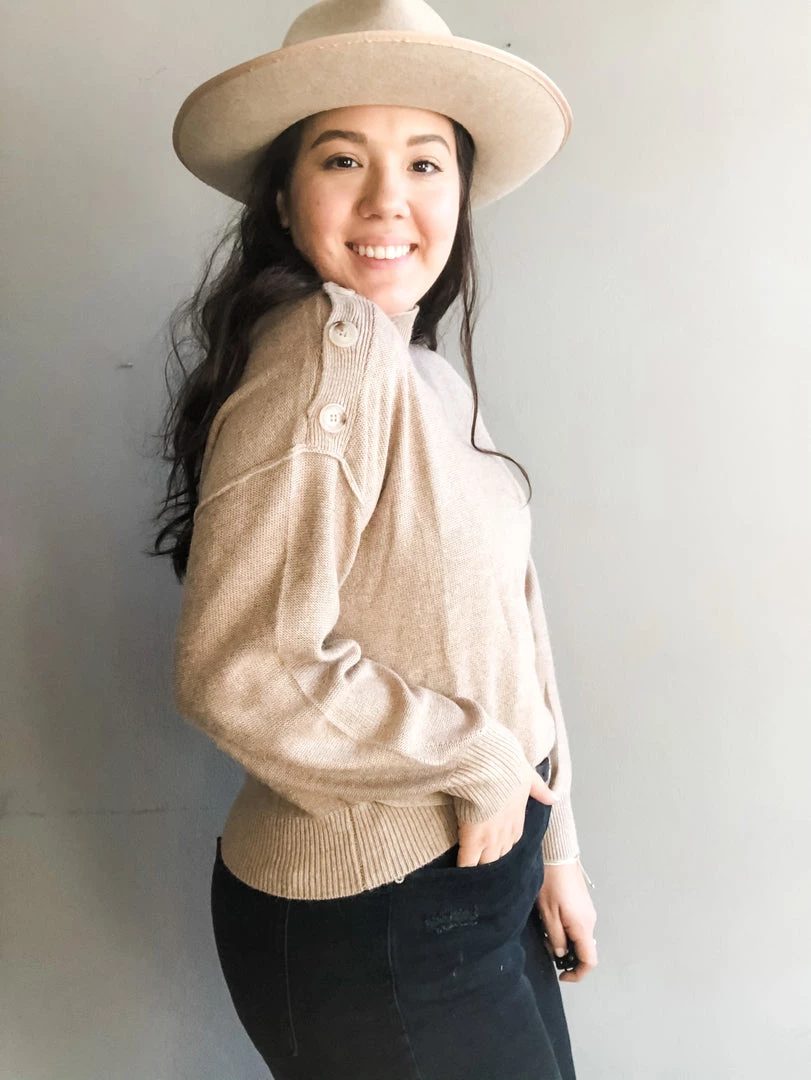 We love this mock neck a latte!! A cozy pullover with ribbed high neck, waist and wrists. An easy piece to wear for work and for play! This mock neck long sleeve comes in a perfectly neutral latte colorway that goes well jeans and midi skirts alike. It’s comfy and just loose enough in all the right places with seamed drop shoulder, slightly loose sleeves and a button down shoulder we love.