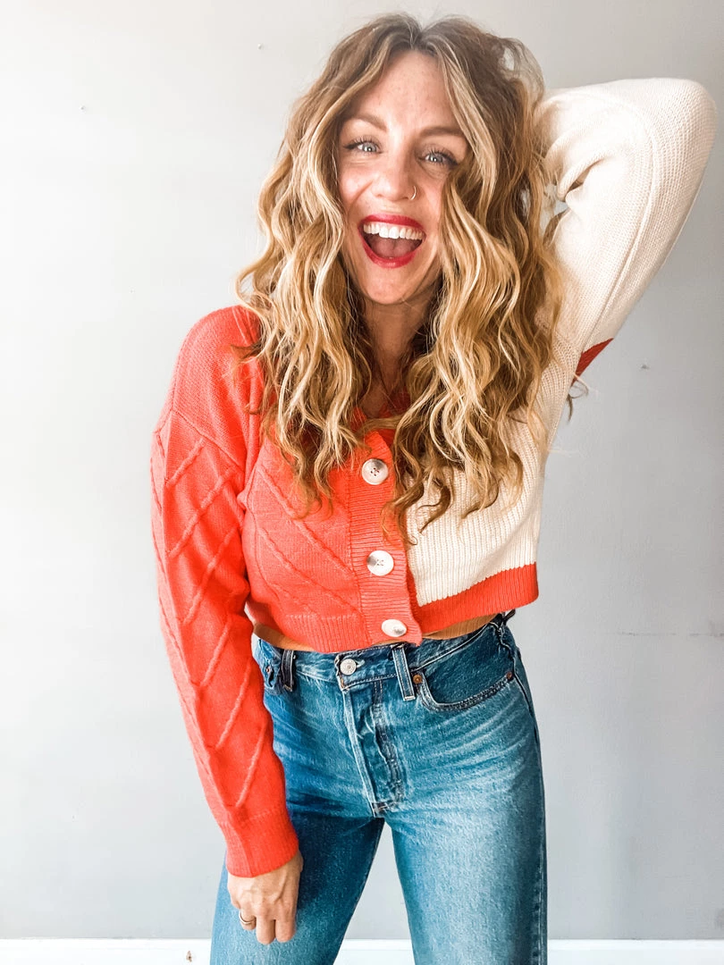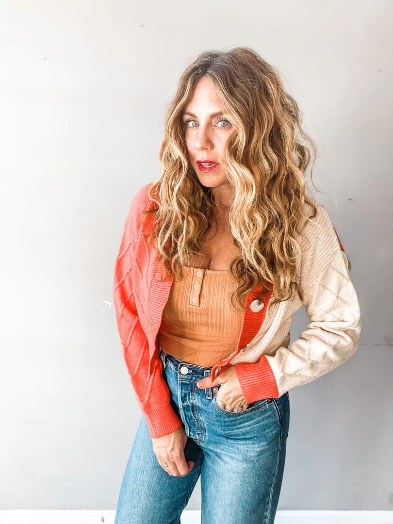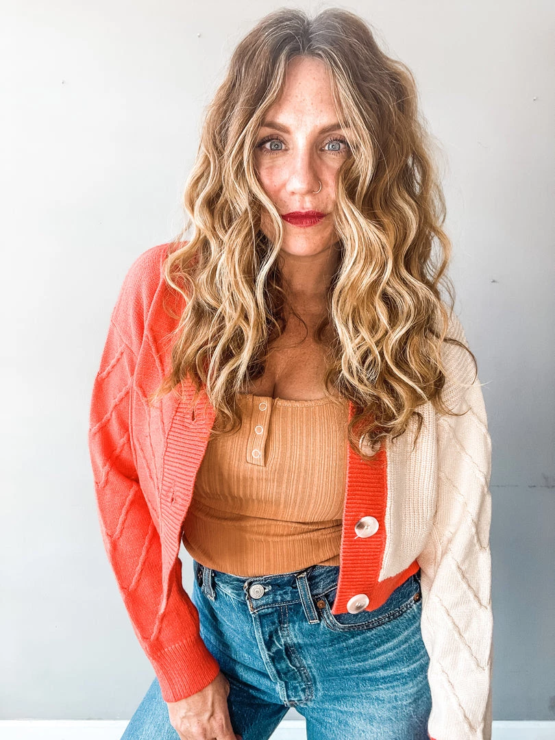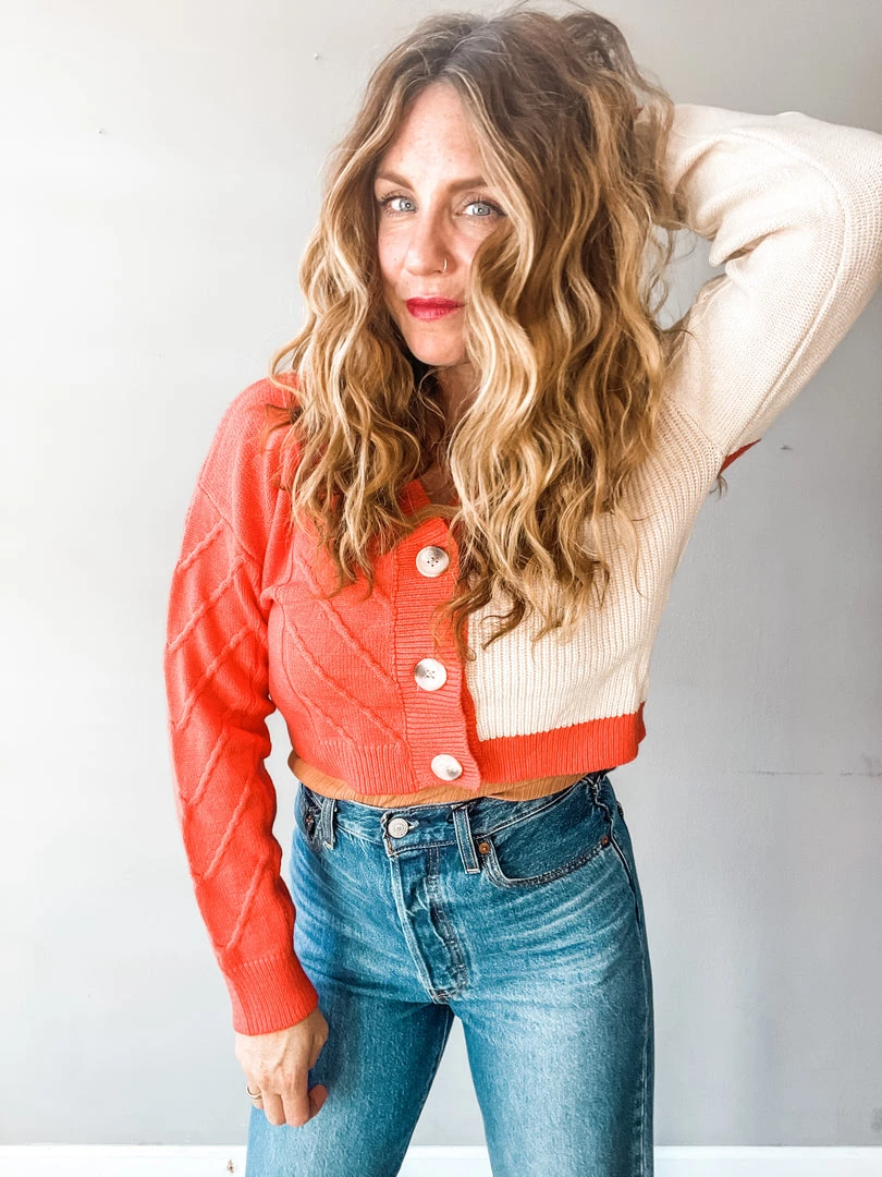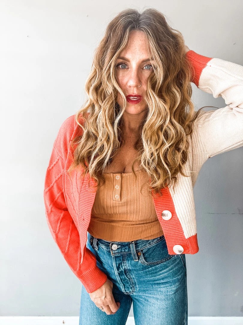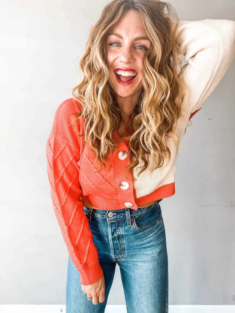 Obsessed with this new fun cropped cardigan in red and taupe!!! We love the fun pop of color with this exciting little piece. Super cute buttoned up and tucked in as a casual sweater, or worn over your favorite tees and tanks as an open cardigan!