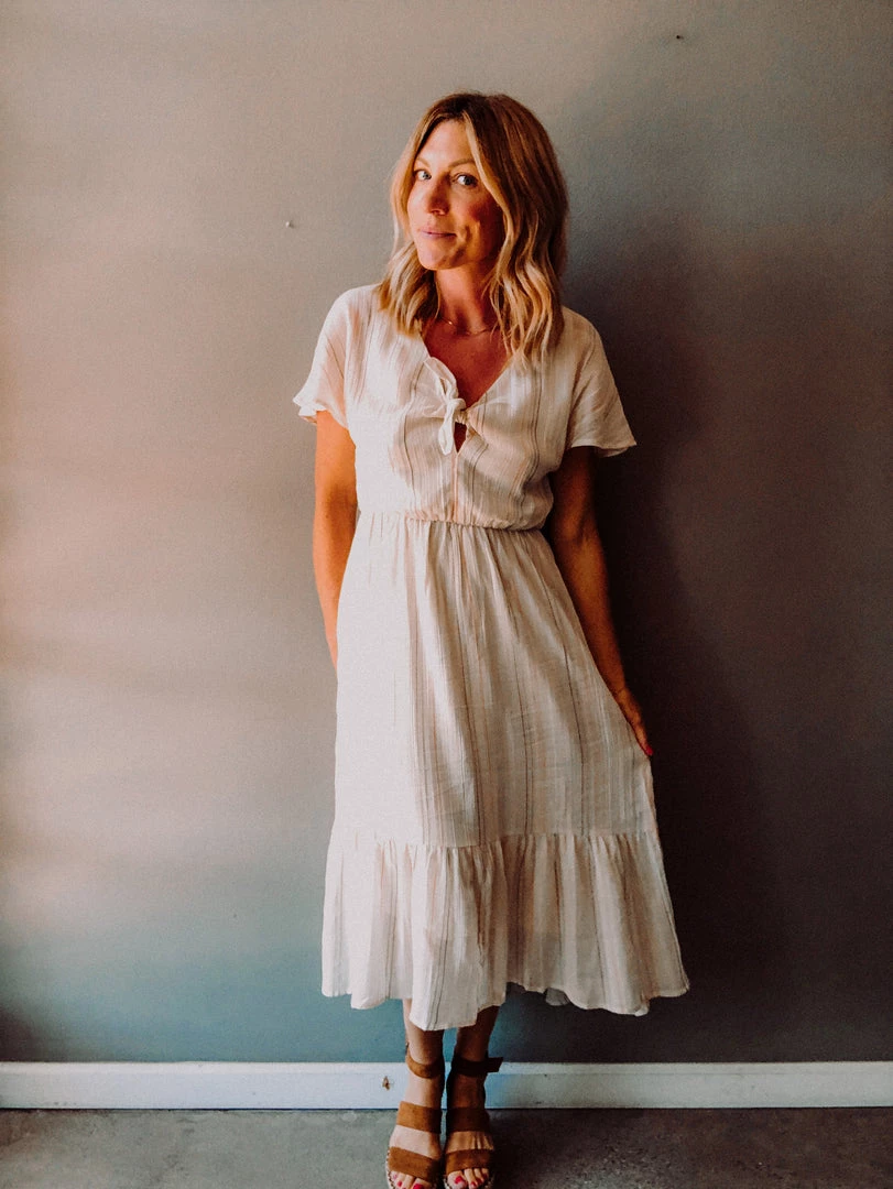 A sweet tiered midi dress with light stripes, loose cap sleeves, tie front and elastic waist. This dress is easy to wear from day to night. It pairs well with booties or a wedge. Loose fitting and lined.