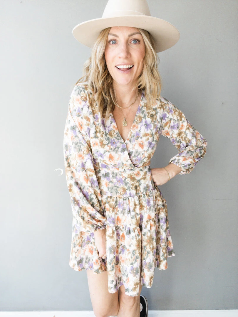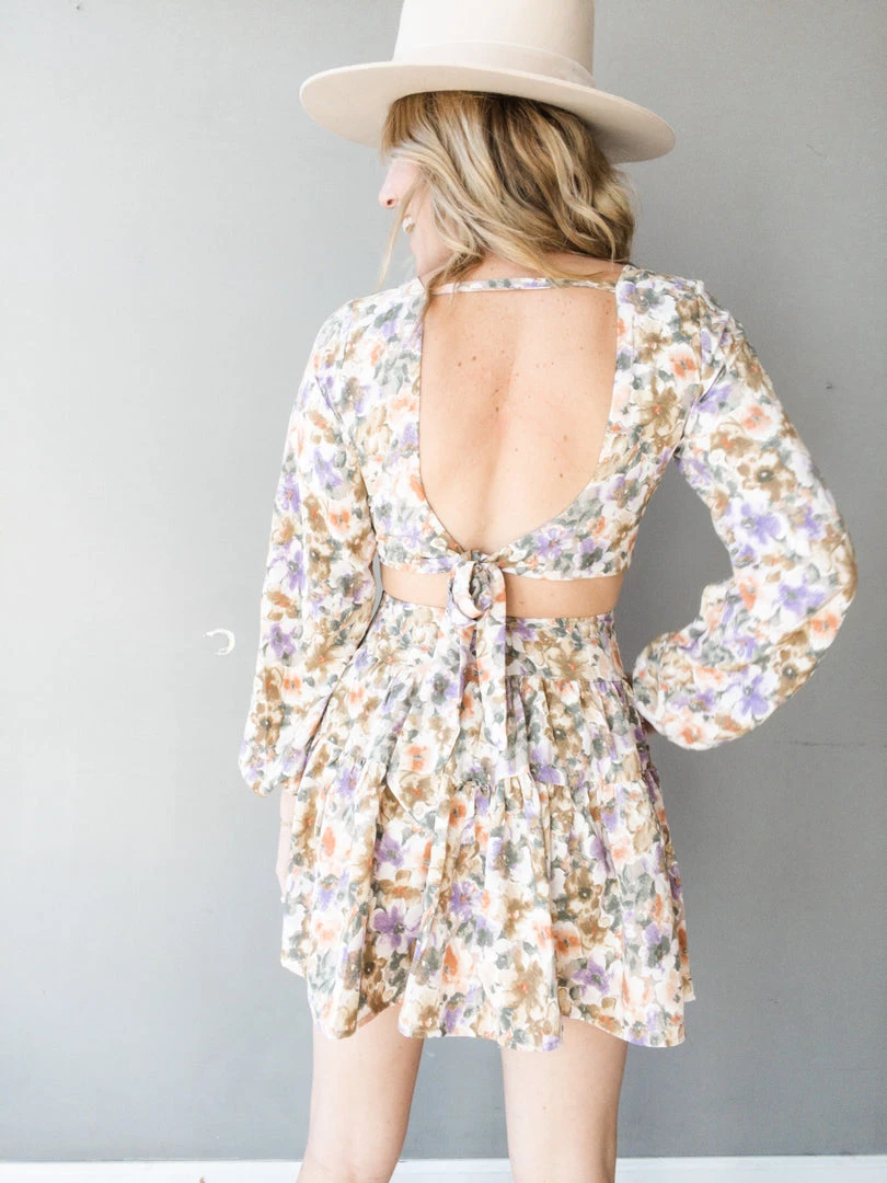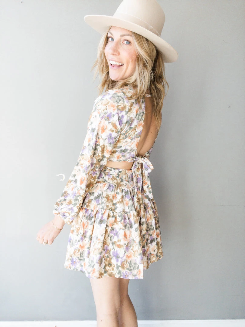 Spring has sprung and the Back In Time Mini Dress kicks us off! This dress is a fun update on a classic mini dress with its cut out details at the center and stunning open tie back. All over floral print and ruffle tier hem adds some fun dimension to this flirty dress. This pretty mini features a fixed waistband with large keyhole back, V cut neckline with button closure at the bust and a zipper closure at the back of the skirt. Slight bubble long sleeves with elastic wrists and a double lined skirt and bust.