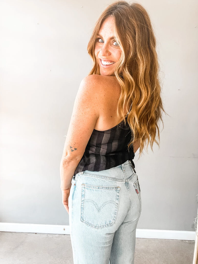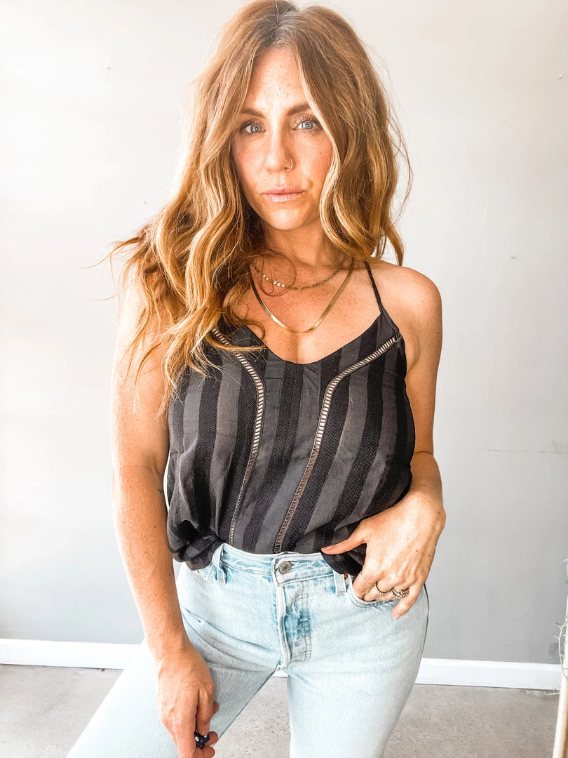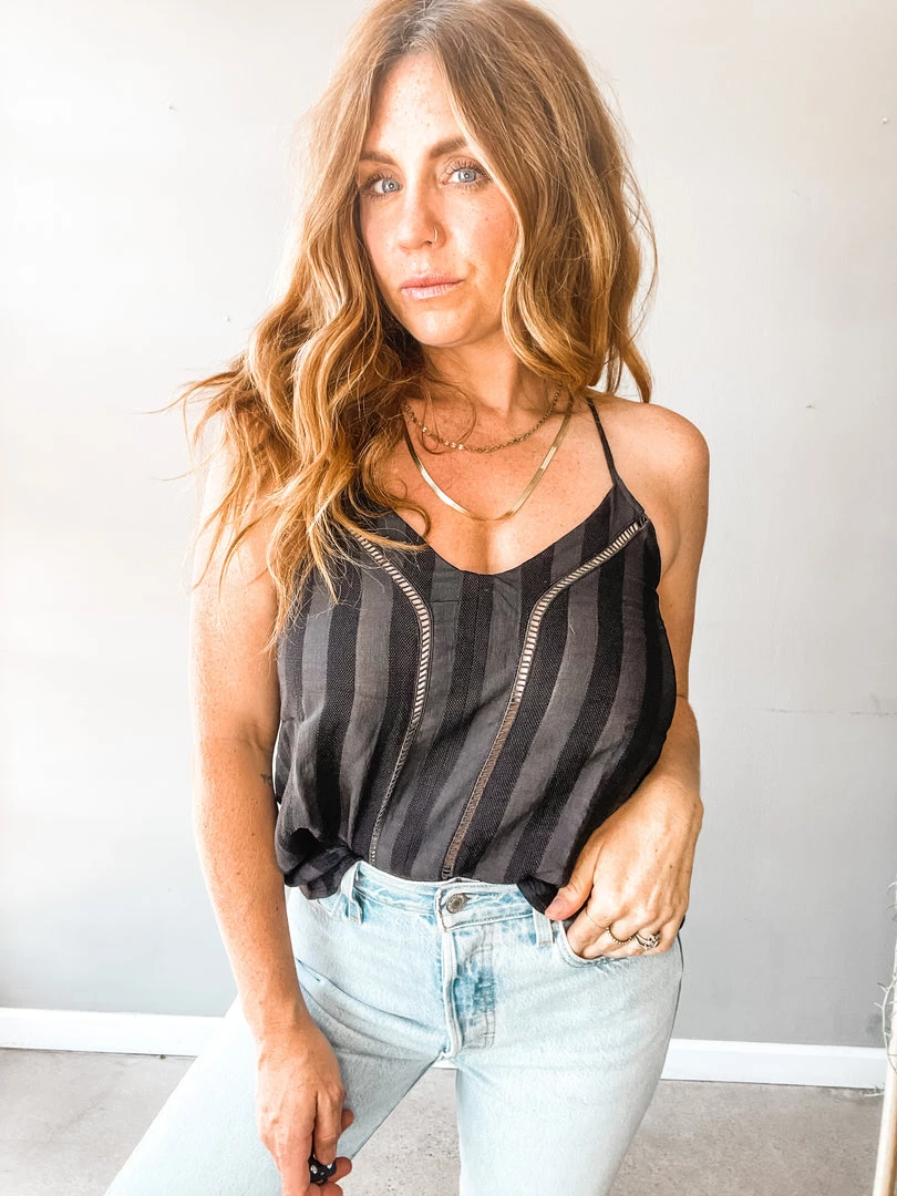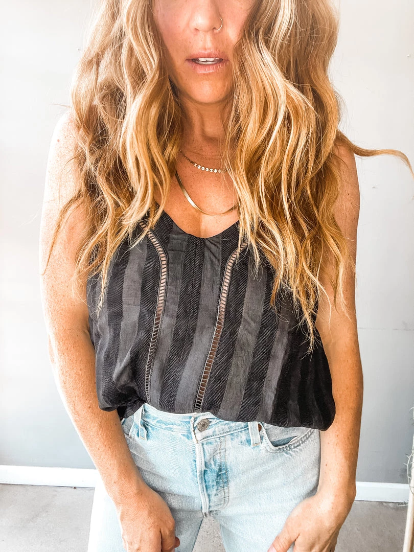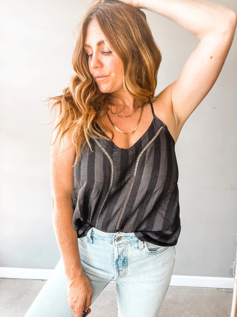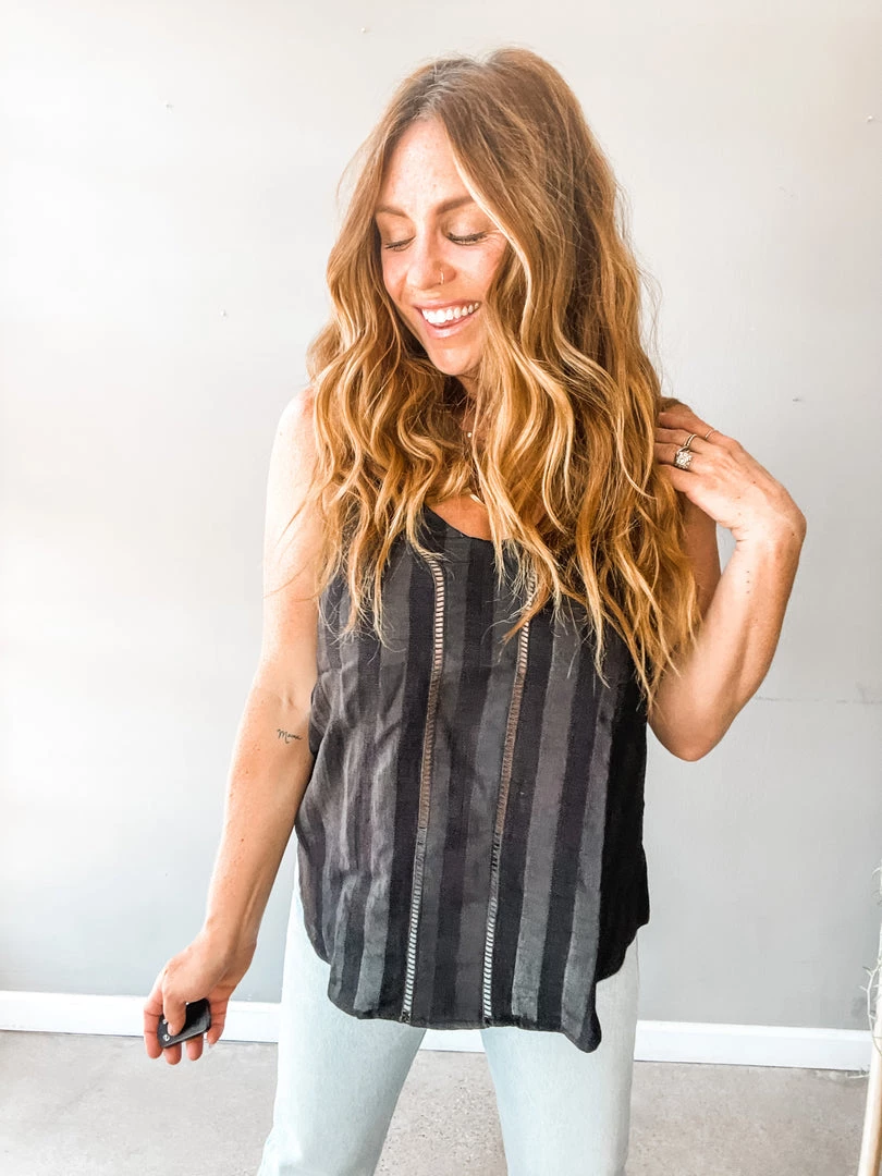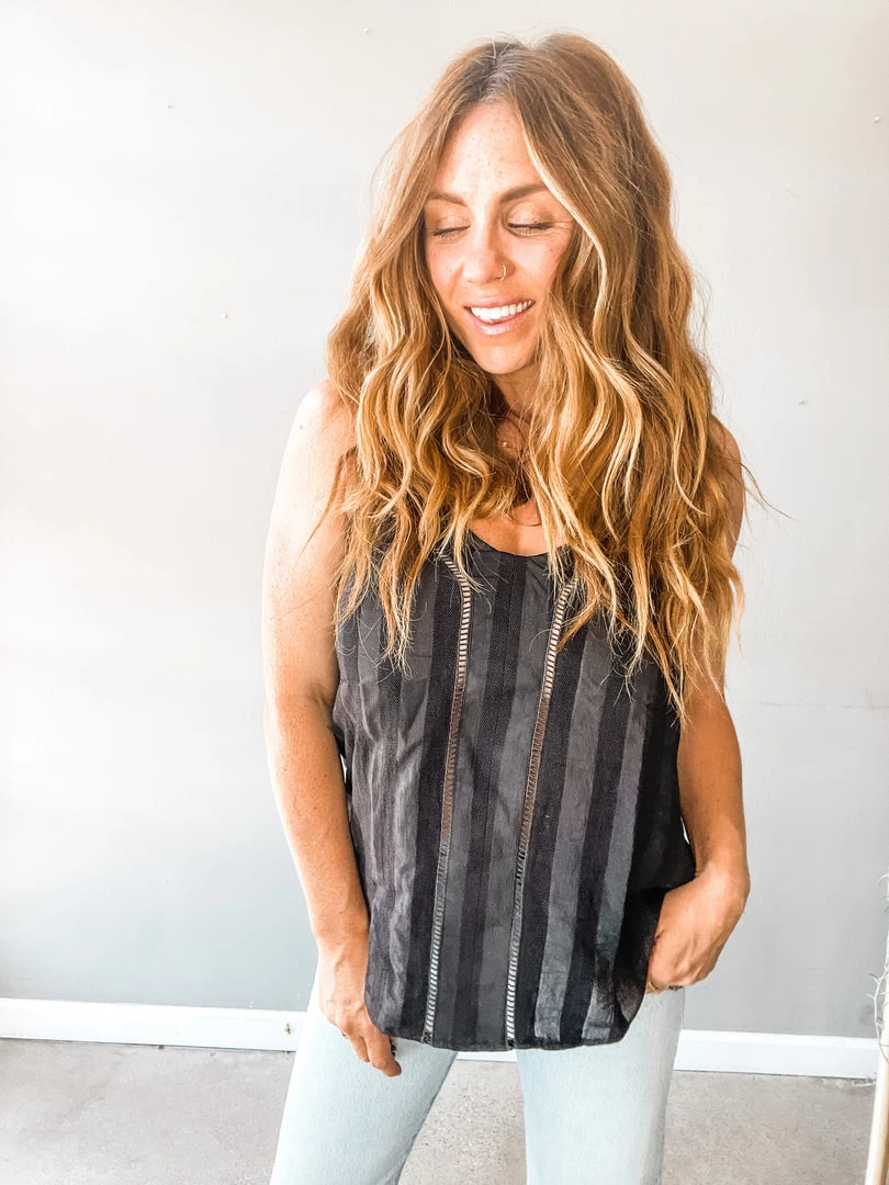The Back to Back Tank is a fun black basic, longer silhouette tank with faint striped details and a crochet lining. A fun take on a classic black tank top! Love it tucked in and the super flattering neckline and back of this chic basic.