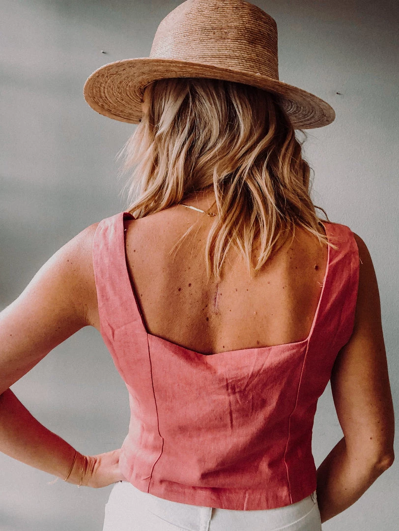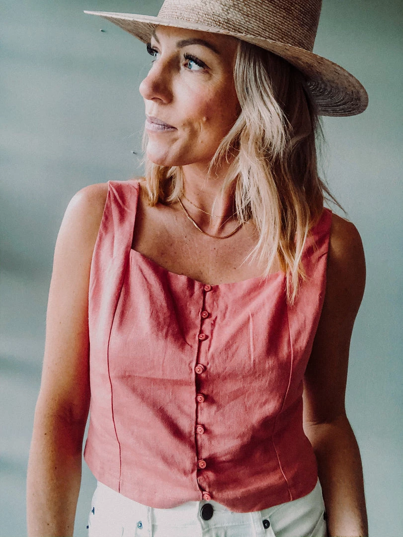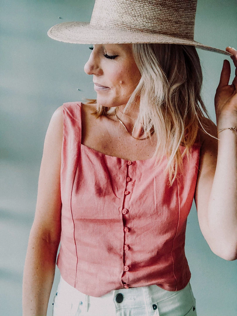 A square neck, button front crop tank that is easy to pair and wear. This linen tank can be dressed up or paired with denim shorts for a casual look. Fits slightly cropped, hitting at the top of your favorite high waisted denim.