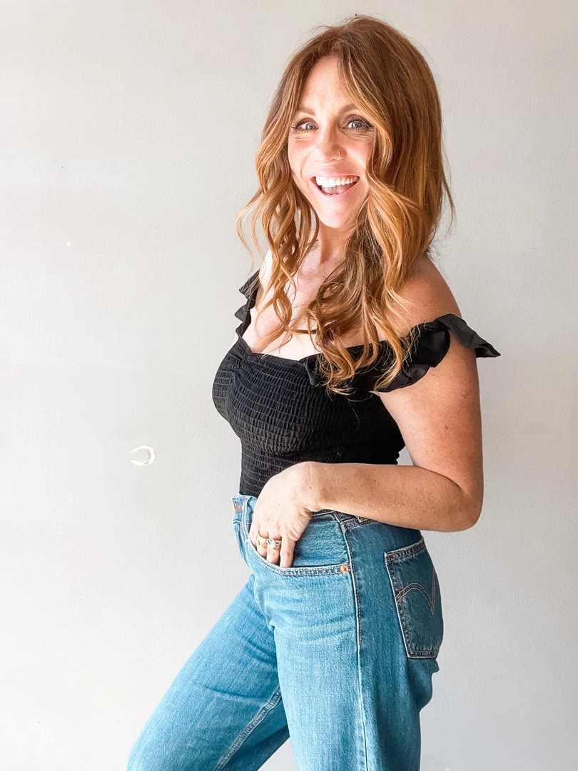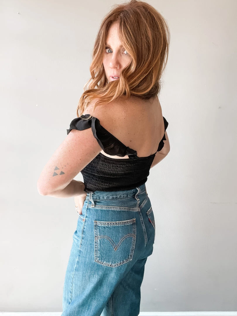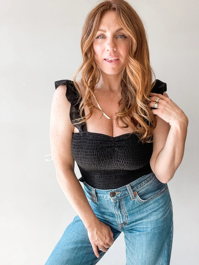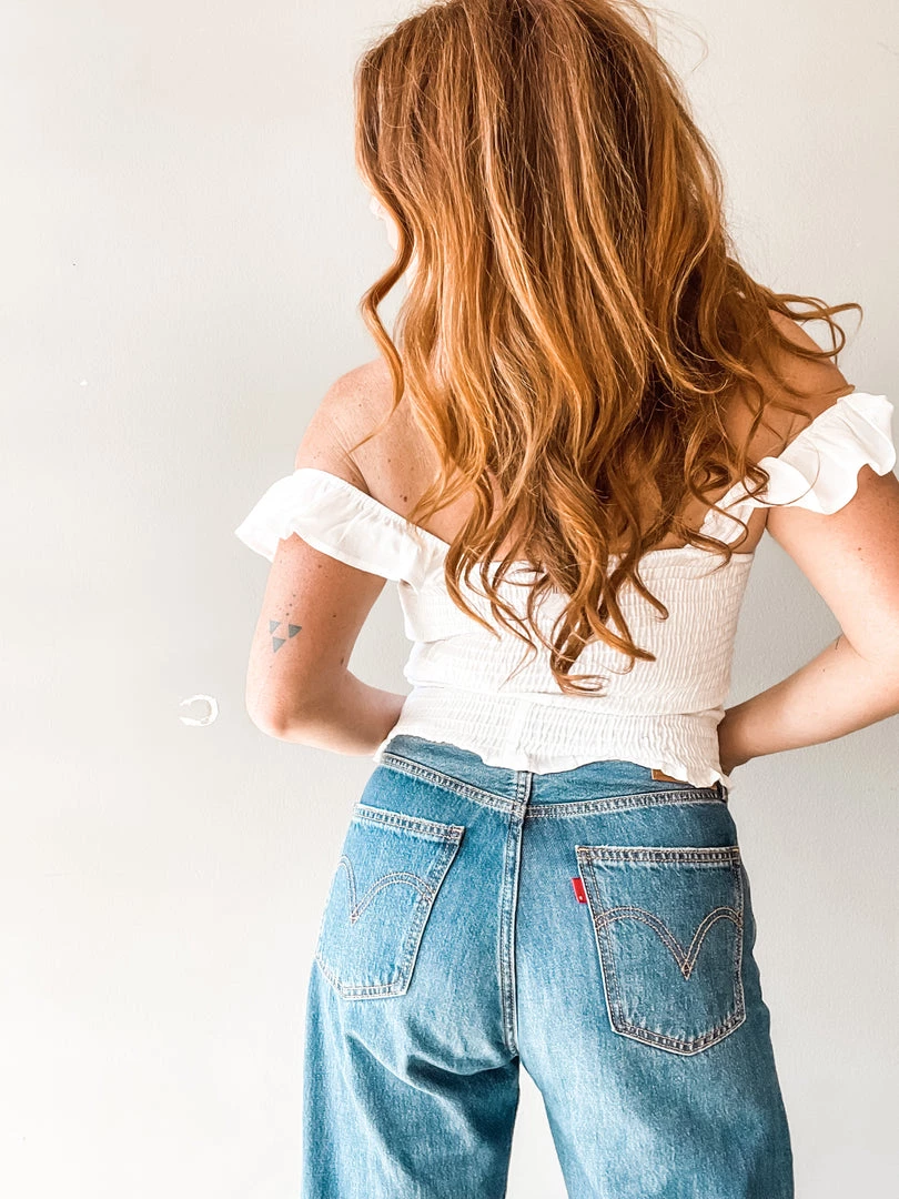 Boy oh boy, we sure do love this smocked crop! It’s fun, flirty, and hugs the body in all the right ways. Style the ruffle straps on or off the shoulder depending on your mood. It’s the perfect length to get tucked into high-waisted pants or to have the ruffle edge sit just above the pant line.