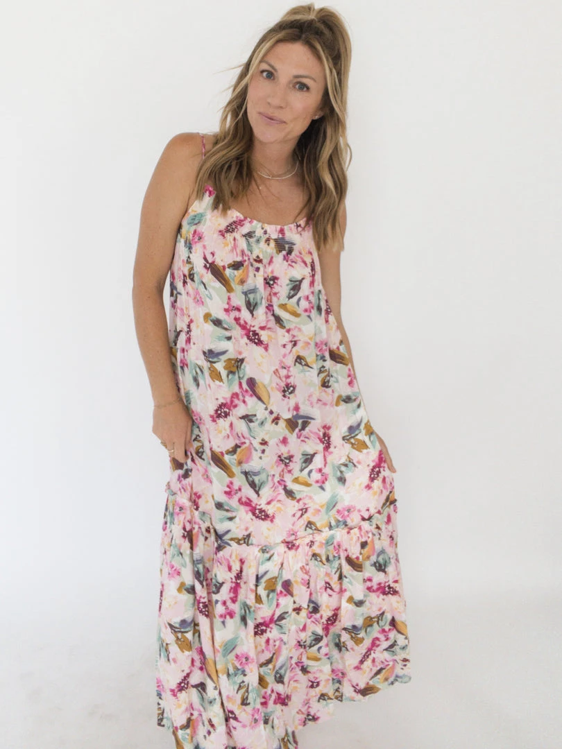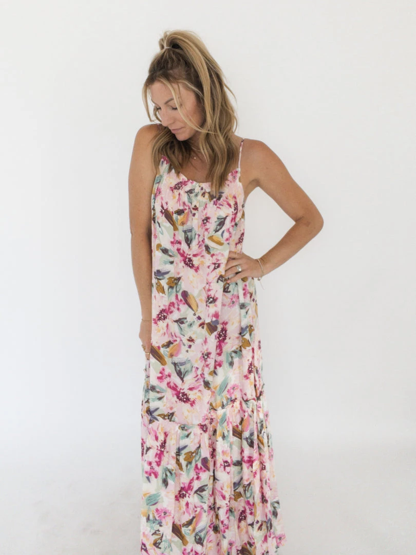 This beautiful maxi dress comes in an abstract floral print of pinks, purples, greens, and yellows. It has a smocked neckline, adjustable straps, a tie at the back, and a tiered skirt. It’s lightweight, flowy, and super soft.