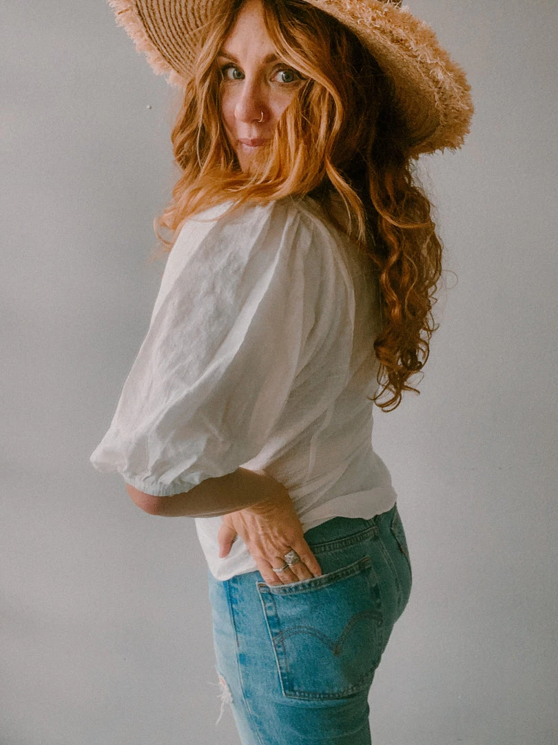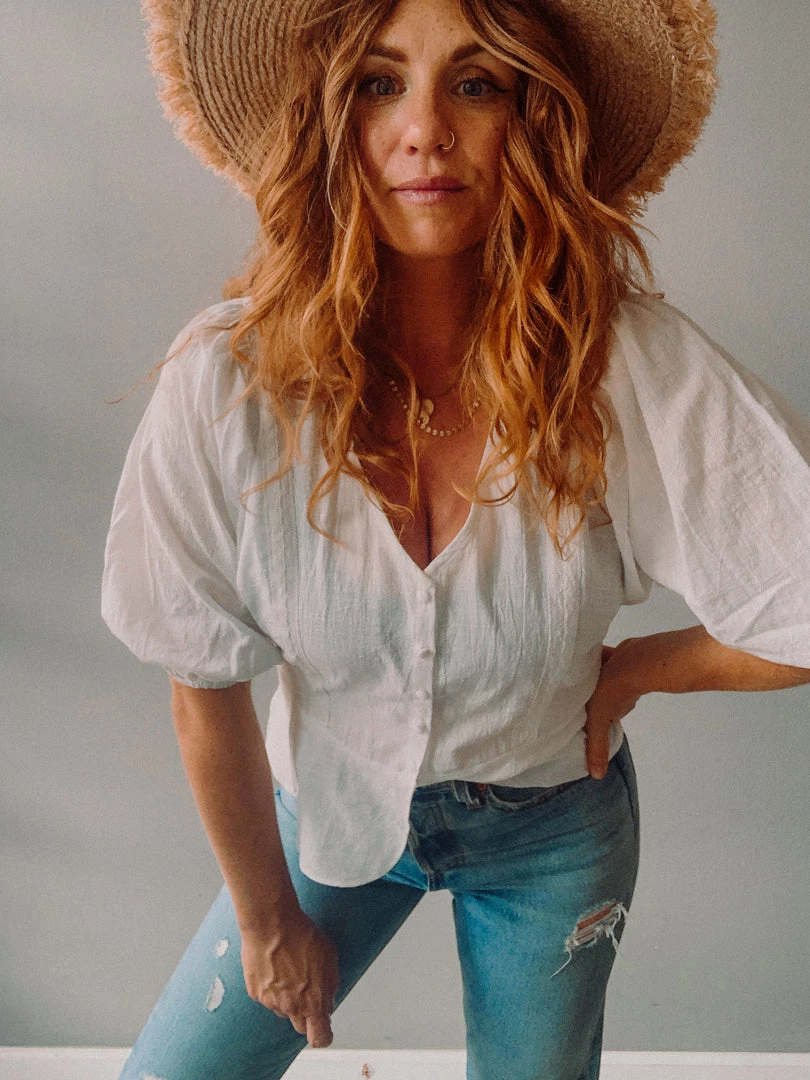 The Blanco Button Up Blouse is a super chic, clean white blouse with a slight puff balloon sleeve. This slight crop features a button up front, v neckline and open hem at the bottom. Pefect for tucking into all your go-to high waisted denim!