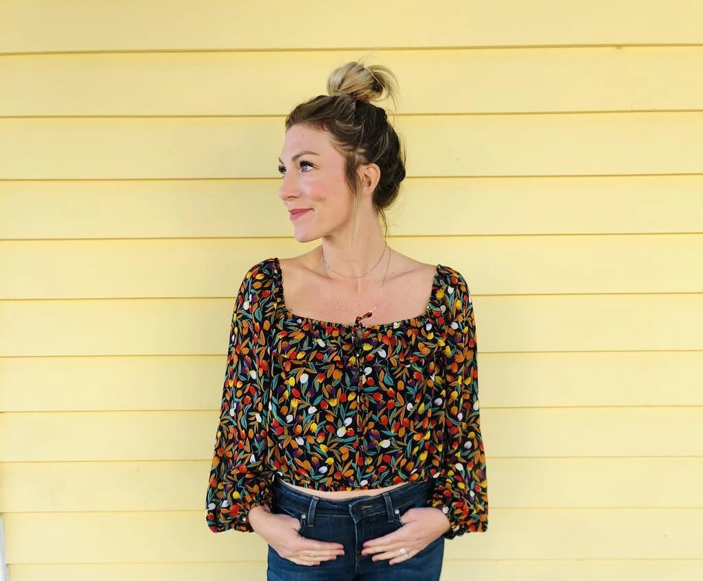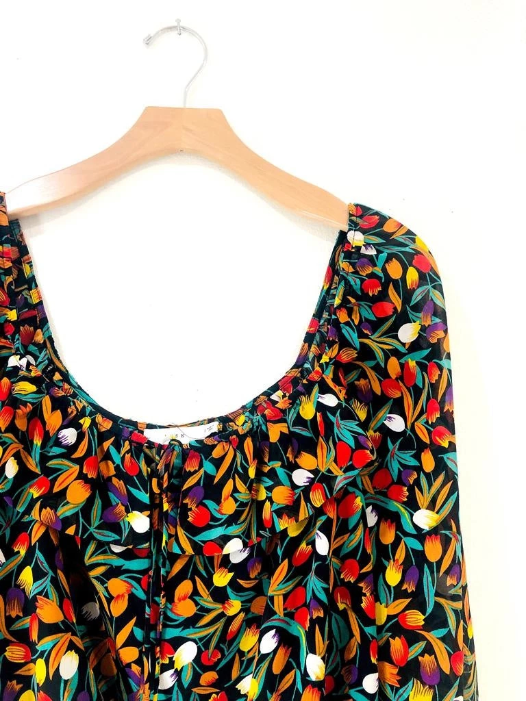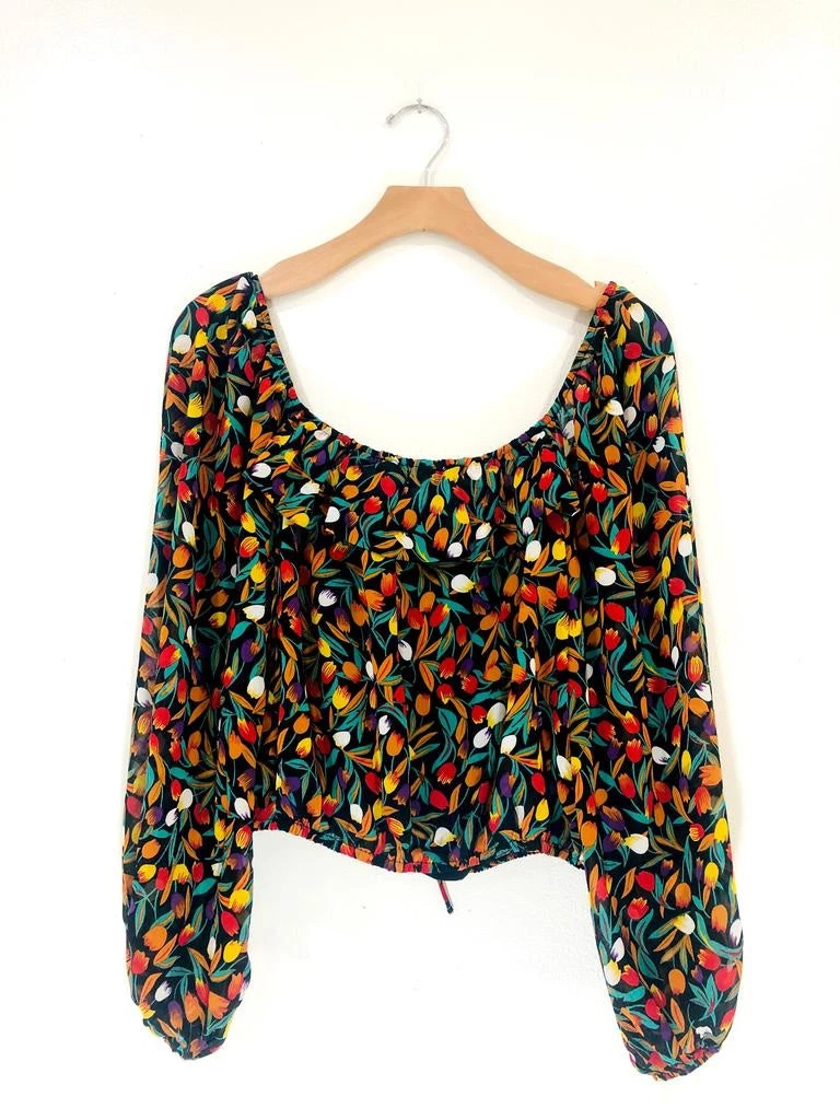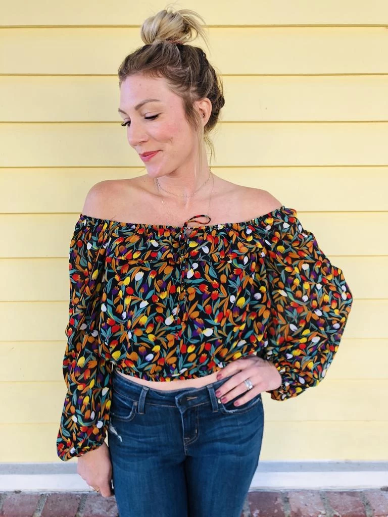 This crop makes us want to book a trip ASAP. This little number is an off the shoulder top with banded bandeau-style top and ruffle deatils at the bust. A tie front top in a bright bloom colorway with loose sleeves.