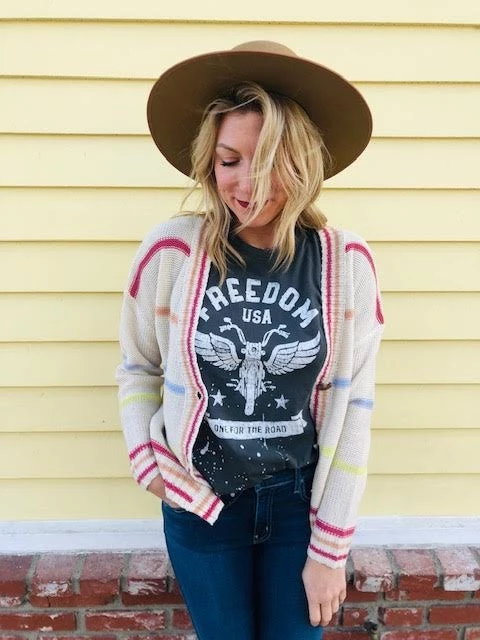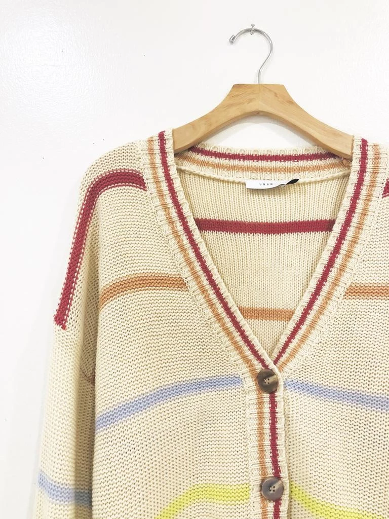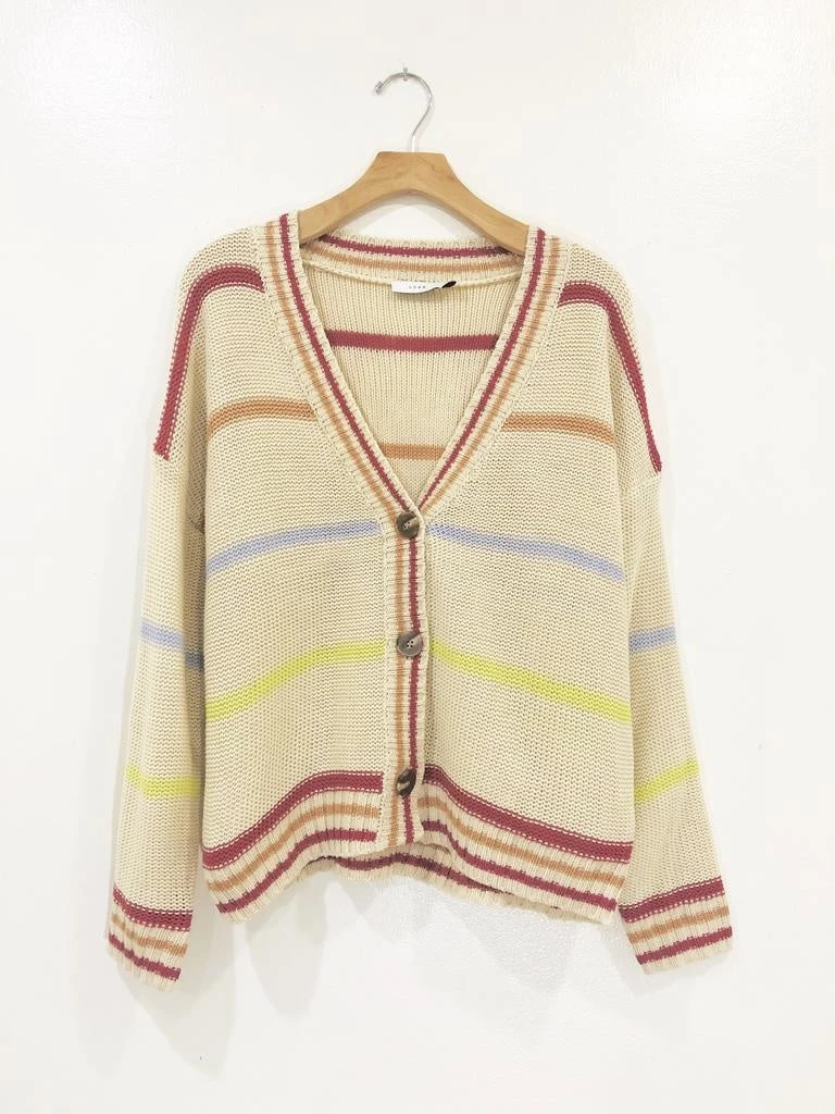 We love a piece like this one. A little bit classic and a little bit funky. Such an easy style to throw on over all your favorite tees and jeans. This cardi has that slouchy grandpa fit we love and features pastel stripes with natural button front.